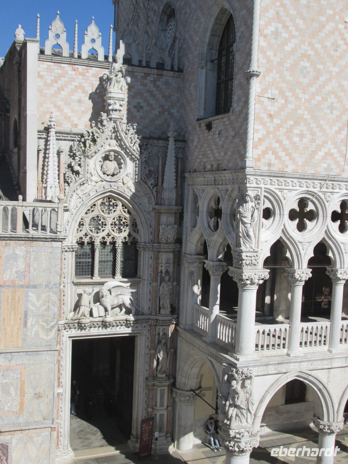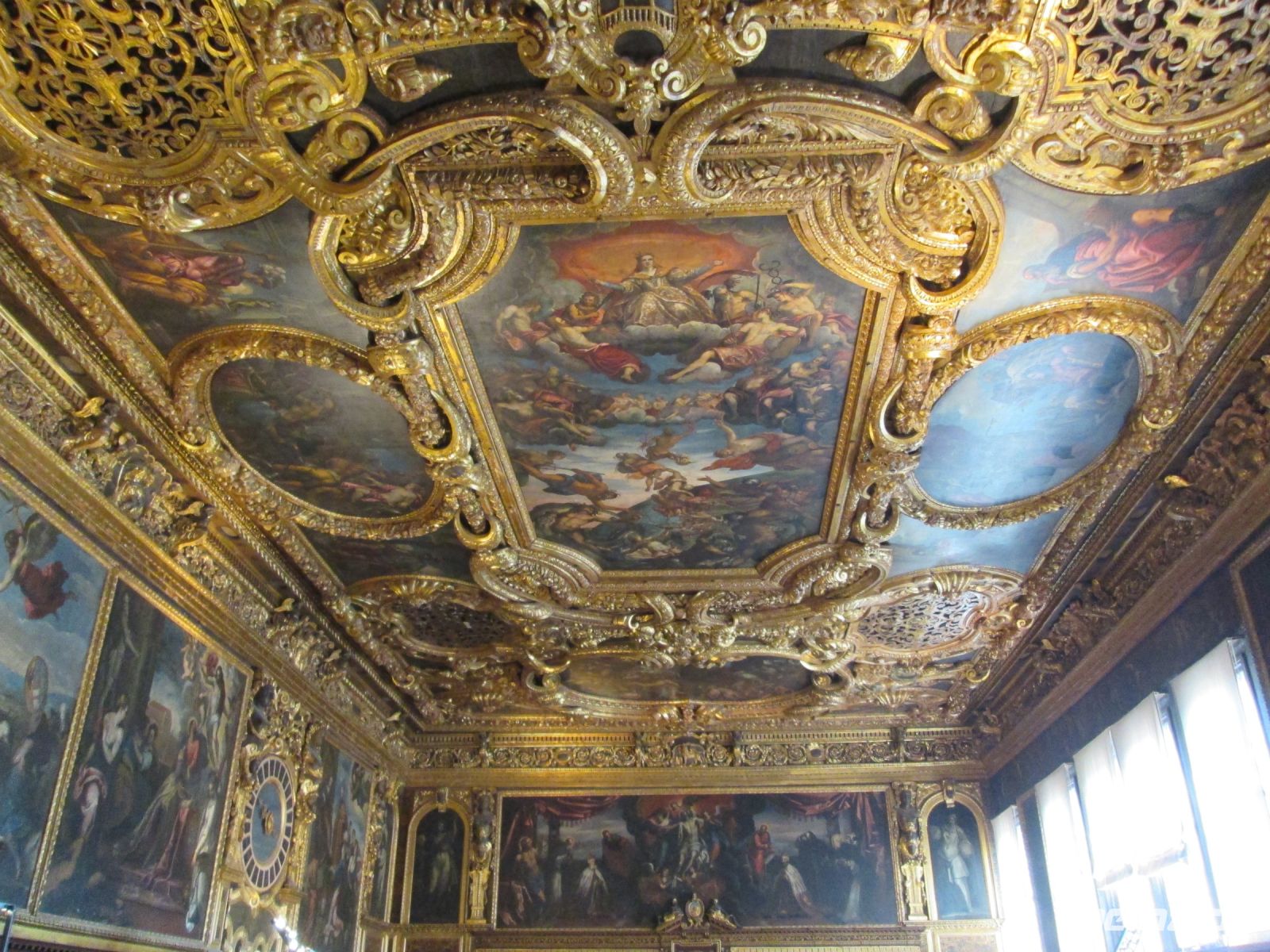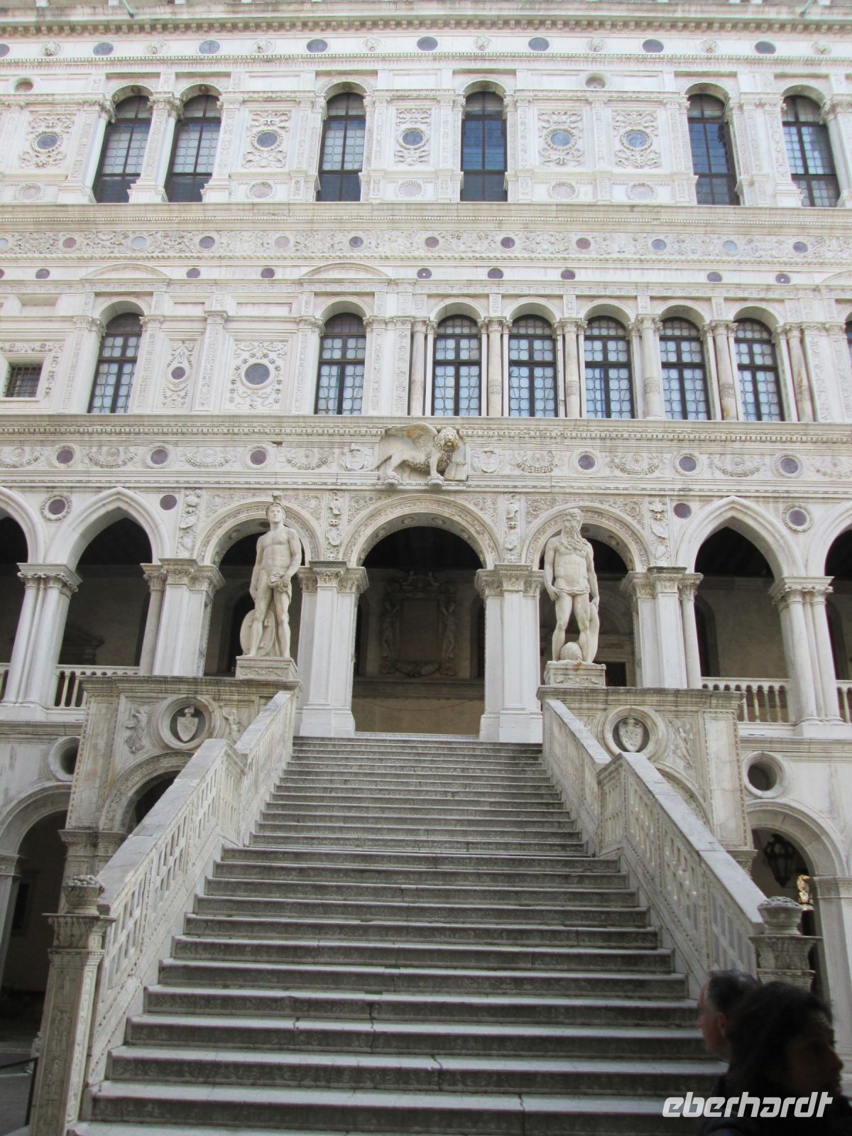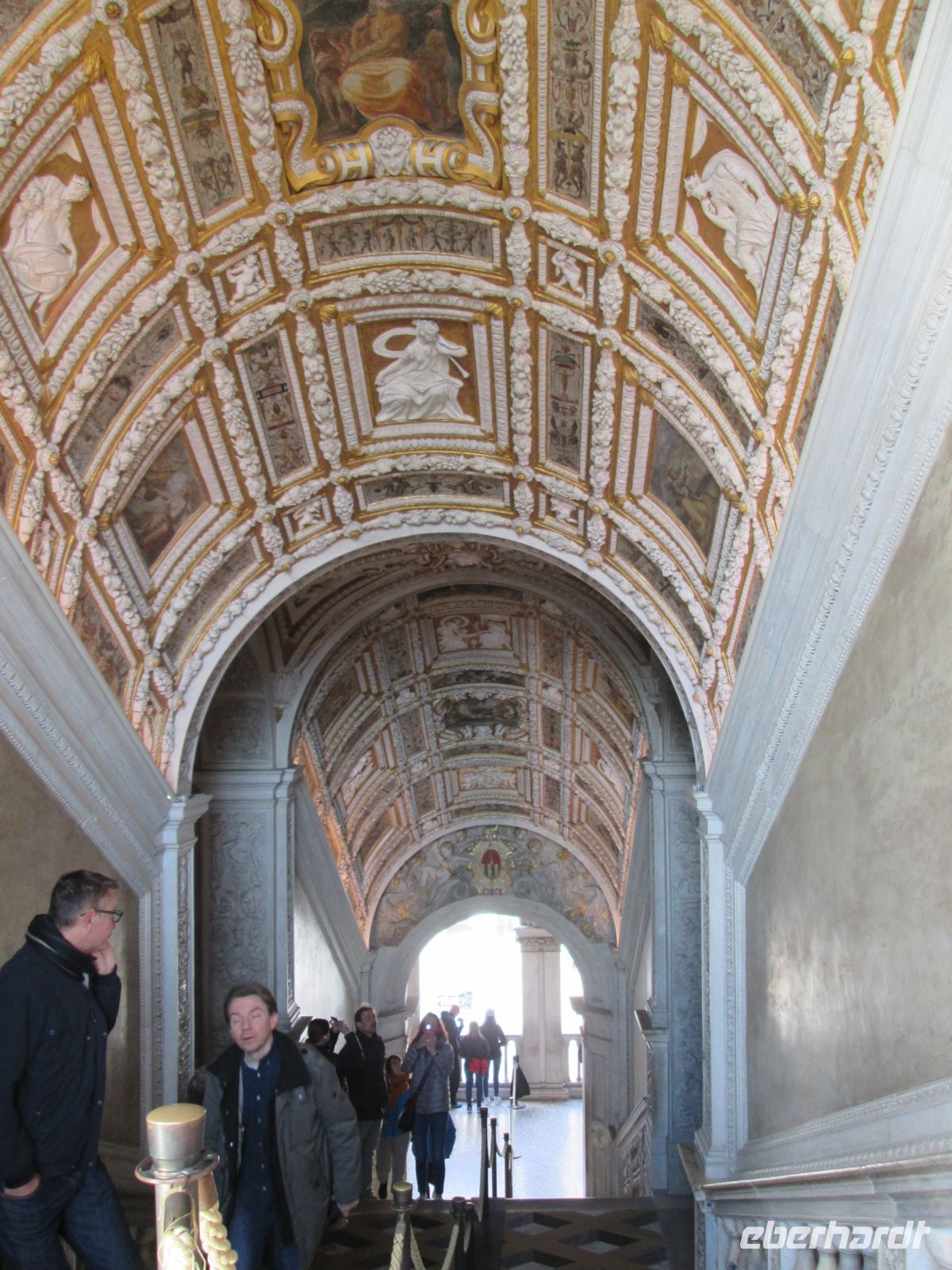 Der Dogenpalast, Palazzo Ducale genannt, war unser heutiges Ziel. Keine Zeit vergeudeten wir, ohne anstehen zu müssen, waren wir schnell im Innenhof des Komplexes. Der Produktmanager von Eberhardt Travel, Herr Fritzsche, hatte auch hier, wie bei den Sehenswürdigkeiten zuvor und auch bei denen, die noch folgten, alle Tickets im Voraus gebucht, ausgedruckt und mir übergeben. Ein zügiges Austeilen der Tickets und schon befanden wir uns an der reich verzierten Scala d' Oro, der Goldenen Treppe. Diese führte uns in das Obergeschoss und alsbald folgten viele interessante Informationen unserer charmanten Stadtführerin zu den Appartements der Dogen, den berühmt berüchtigten Bleikammern und natürlich dem Großen Saal. In diesem haben sich Veronese und Tintoretto verewigt. Letzterer durch sein gewaltiges "Paradies" an der Stirnseite des Sala del Maggior Consiglio.