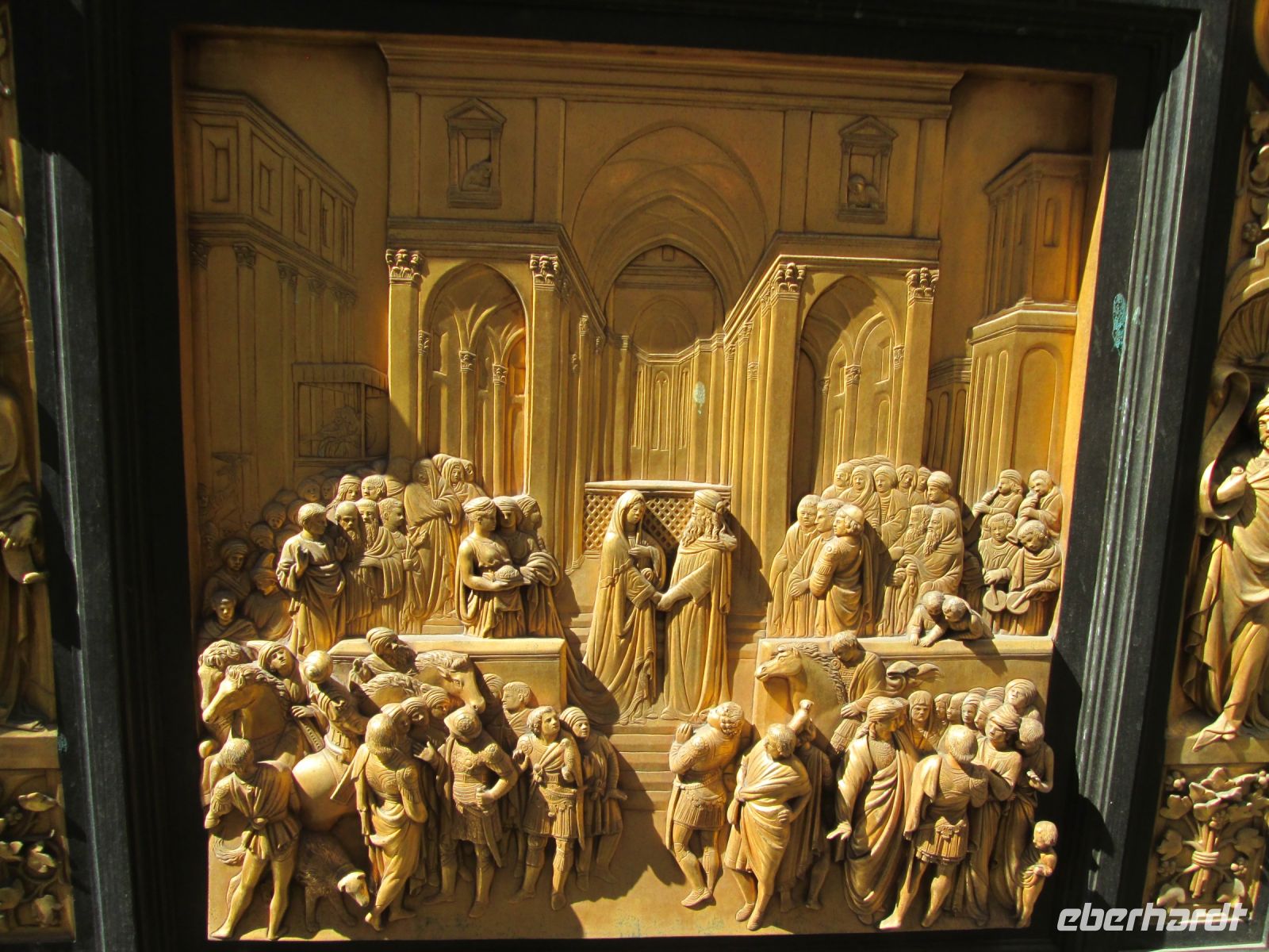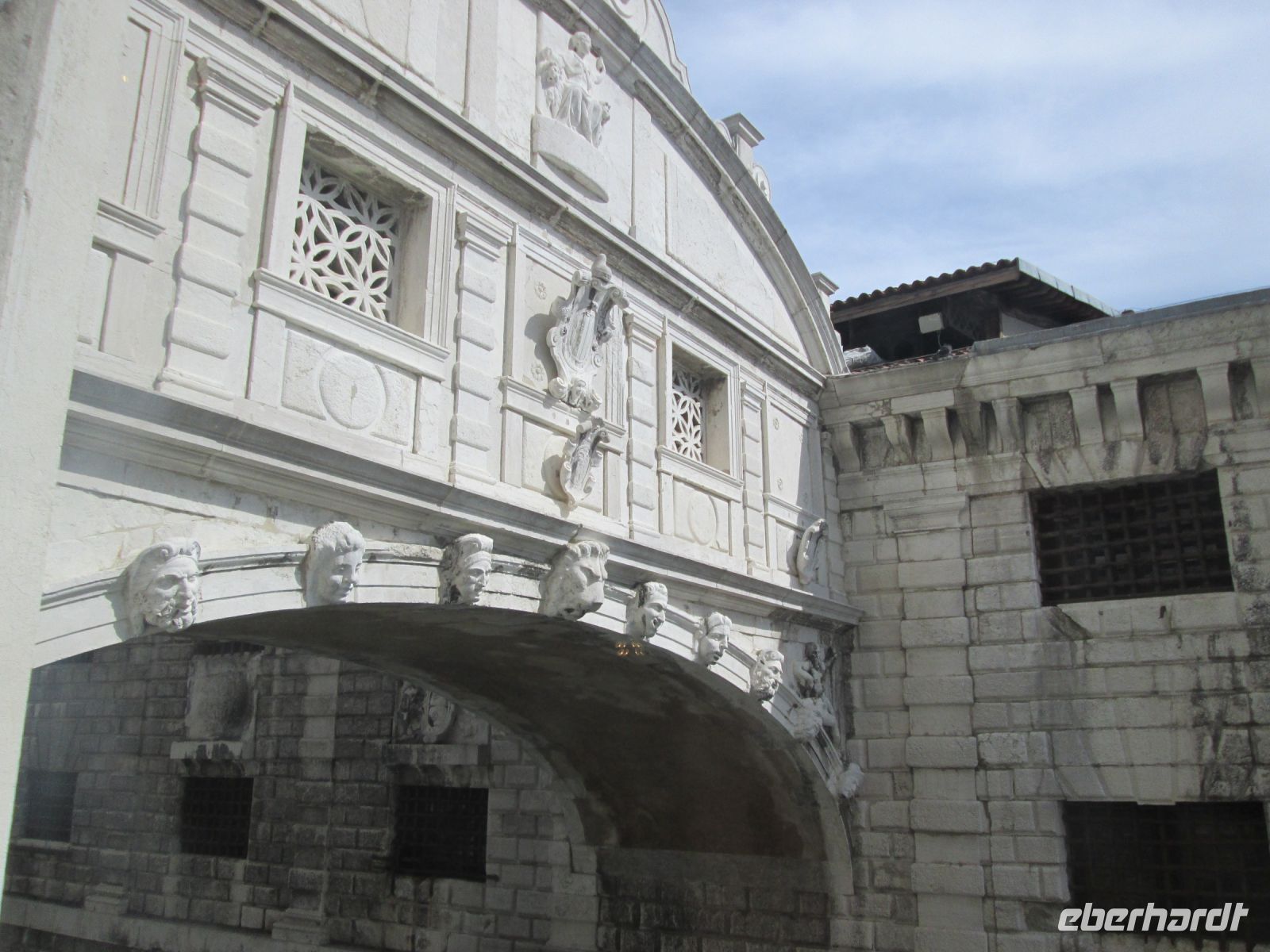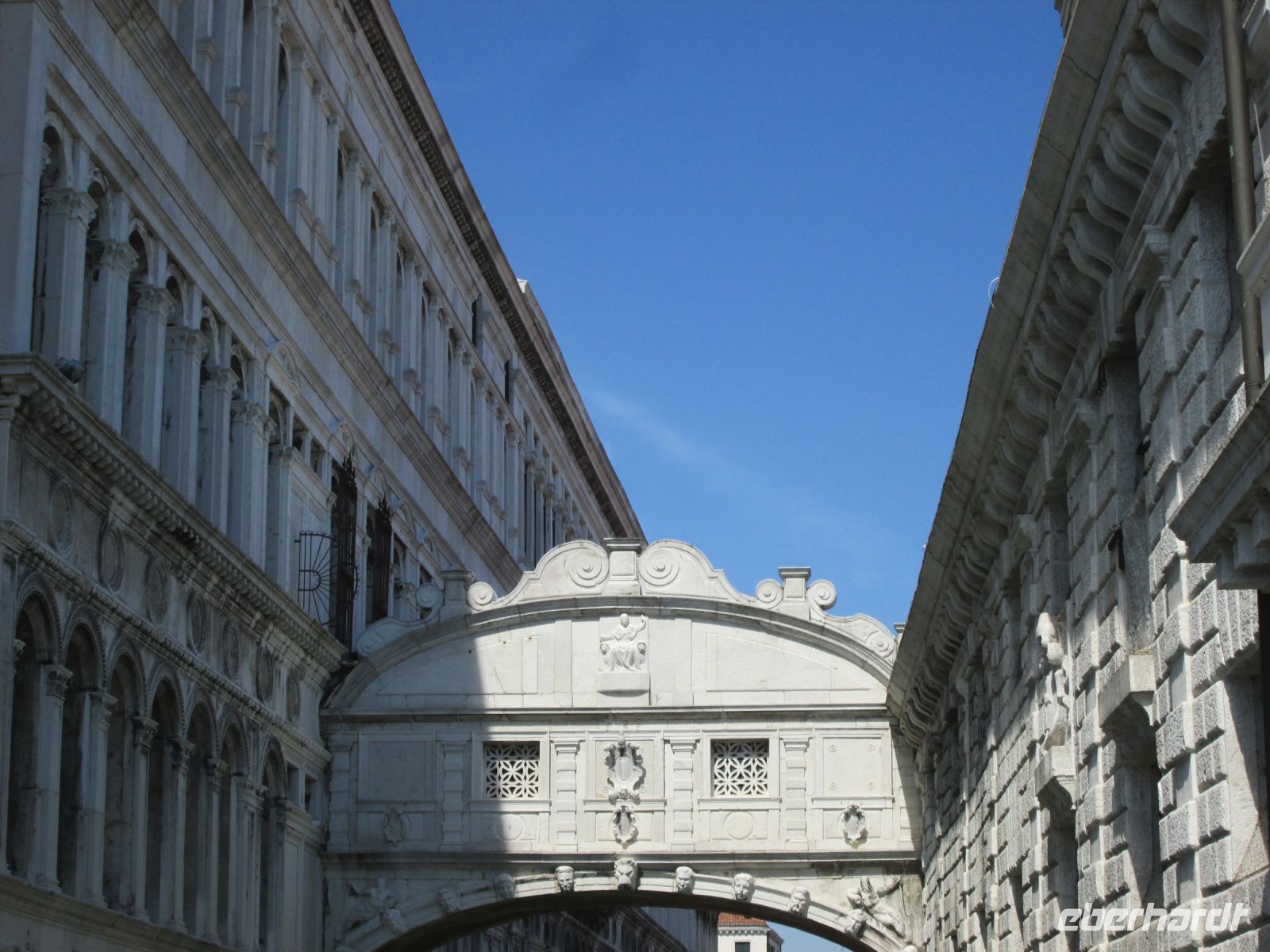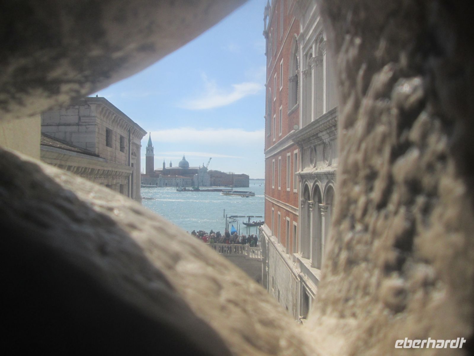 Der Dogenpalast, Palazzo Ducale genannt, war unser heutiges Ziel. Keine Zeit vergeudeten wir, ohne anstehen zu müssen, waren wir schnell im Innenhof des Komplexes. Der Produktmanager von Eberhardt Travel, Herr Fritzsche, hatte auch hier, wie bei den Sehenswürdigkeiten zuvor und auch bei denen, die noch folgten, alle Tickets im Voraus gebucht, ausgedruckt und mir übergeben. Ein zügiges Austeilen der Tickets und schon befanden wir uns an der reich verzierten Scala d' Oro, der Goldenen Treppe. Diese führte uns in das Obergeschoss und alsbald folgten viele interessante Informationen unserer charmanten Stadtführerin zu den Appartements der Dogen, den berühmt berüchtigten Bleikammern und natürlich dem Großen Saal. In diesem haben sich Veronese und Tintoretto verewigt. Letzterer durch sein gewaltiges "Paradies" an der Stirnseite des Sala del Maggior Consiglio.