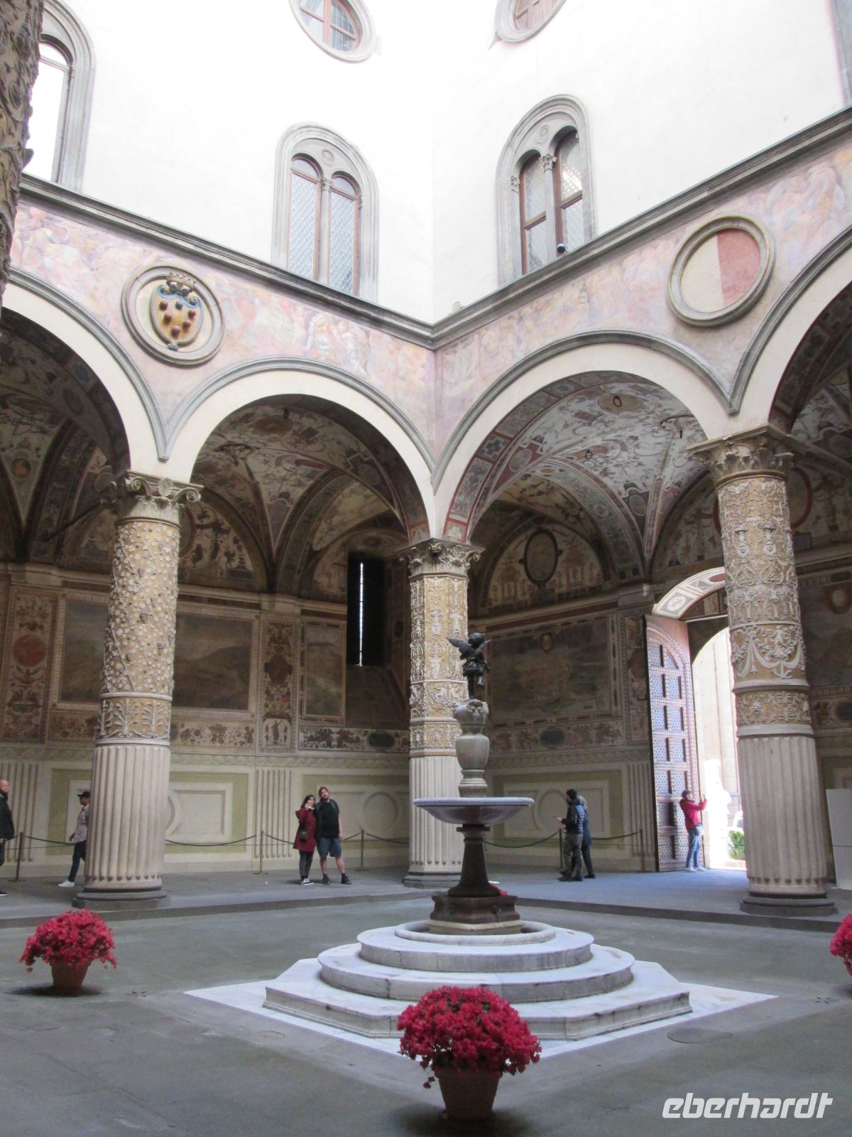Einst Sitz der Zünfte, dann Amtssitz der Ratsherren, später Wohnsitz der Medici und heute Rathaus, eine lange Geschichte ab dem 13 .Jahrhundert bis heute. Der Saal der Fünfhundert gilt als das Prunkstück dieser festungsartigen Anlage. Giorgio Vasari hat sich in ihm mit 39 Fresken, die der Verherrlichung Cosimo de' Medici dienten, verewigt.