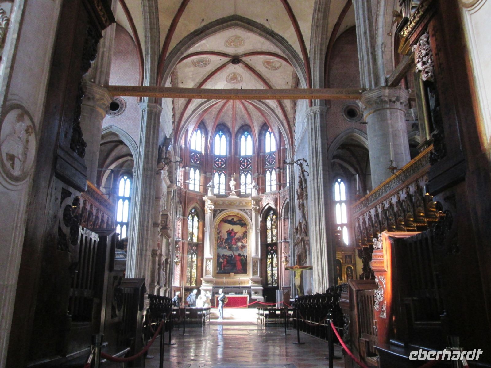 Ihr klangvoller Name: Santa Maria Gloriosa dei Frari. Wieder einmal hatte ein Doge ein Stück Land zur Verfügung gestellt, auf dem man ab dem 13. Jahrhundert begann, ein gewaltiges Gotteshaus zu errichten. Dies geschah in mehreren Bauabschnitten, so dass wir heute mit dem Hauptschiff einen jüngeren Teil vorfinden, und mit den Nebenkappellen ältere Teile.