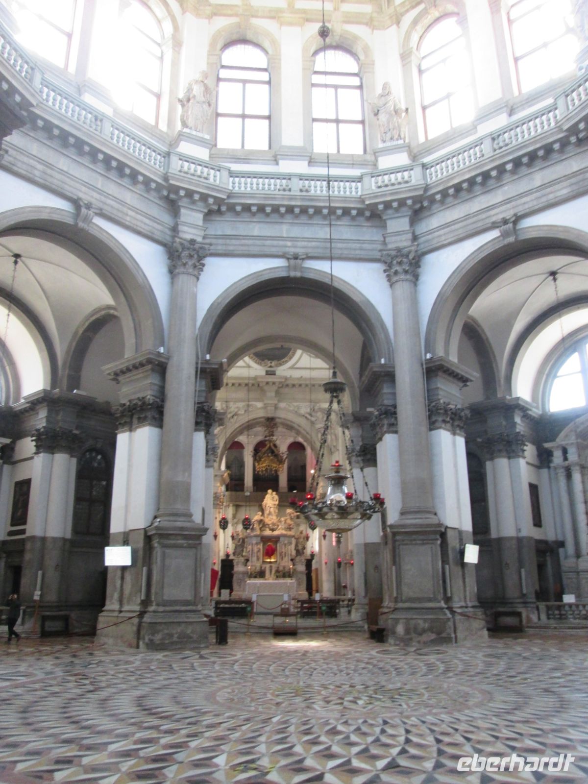 Durch den Stadtteil Dorsoduro führte uns der Weg gemütlich an der Gondelwerft San Trovaso vorbei Richtung Pestkirche, Santa Maria della Salute. Die Pest wütete in Venedig 2 Mal und jedesmal gelobte man eine Kirche zu errichten, wenn dieser mit Gottes Hilfe ein Ende gesetzt werden könne. So gibt es heute "Il Redentore" und "Santa Maria della Salute". 1630 von Longhena als Rundbau errichtet, thront sie auf einer Landspitze, an der sich Canal Grande und Canale della Giudecca berühren. Von dieser Stelle, die früher auch als Zollstätte genutzt wurde, hat man eine fantastsichen Blick Richtung Markusplatz mit all seinen Gebäuden.