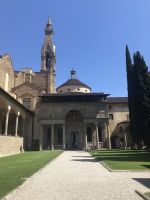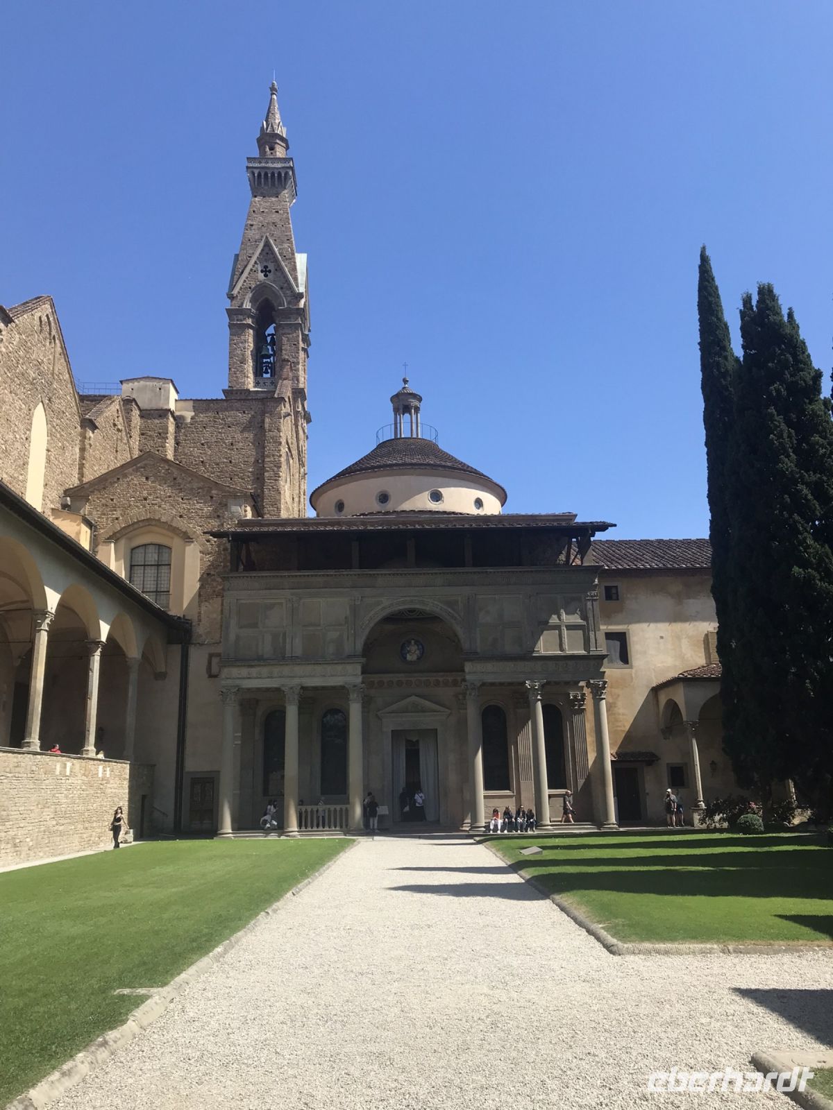 Die Nacht war kurz, die Müdigkeit steckt allen bei der Ankunft am Flughafen in Florenz noch in den Knochen. Doch die Stadt lockt und so starten wir zum ersten Spaziergang. Die Zimmer im Hotel stehen ohnehin noch nicht für uns bereit. Am Bahnhof vorbei, ein Gebäude aus den Dreißigerjahren des vergangenen Jahrhunderts, erreichen wie die weitläufige Piazza Santa Maria Novella. Zwei Obeliske auf Schildkröten gestützt schmücken den Platz, in den Rabatten blühen die ersten Rosen.Die Fassade der Dominikanerkirche mit ihrem weißen und grünen Marmor leuchtet im Sonnenlicht. Ein wunderschöner erster Eindruck. Zur Basilika gehört eine Klosteranlage der Dominikaner. Damals wurden innerhalb der Mauern Kräuter und Heilpflanzen angebaut, die noch heute in der angrenzenden Apotheke verkauft werden. Schon im Vorraum umfängt einen der wohlige Duft der Essenzen. In den geschmackvoll gestalteten Räumen stehen alte Gefäße und Gerätschaften ausgestellt und geben einen Einruck von der Produktion, die die Dominikaner bereits im 13. Jahrhundert begonnen hatten. Der Weg führt uns dann Richtung Arno und vorbei an der Kirche Ogni Santi, die mit ihrer Deckenmalerei, den Bildern von Girlandaio und einem Kruzifix von Giotto begeistet.