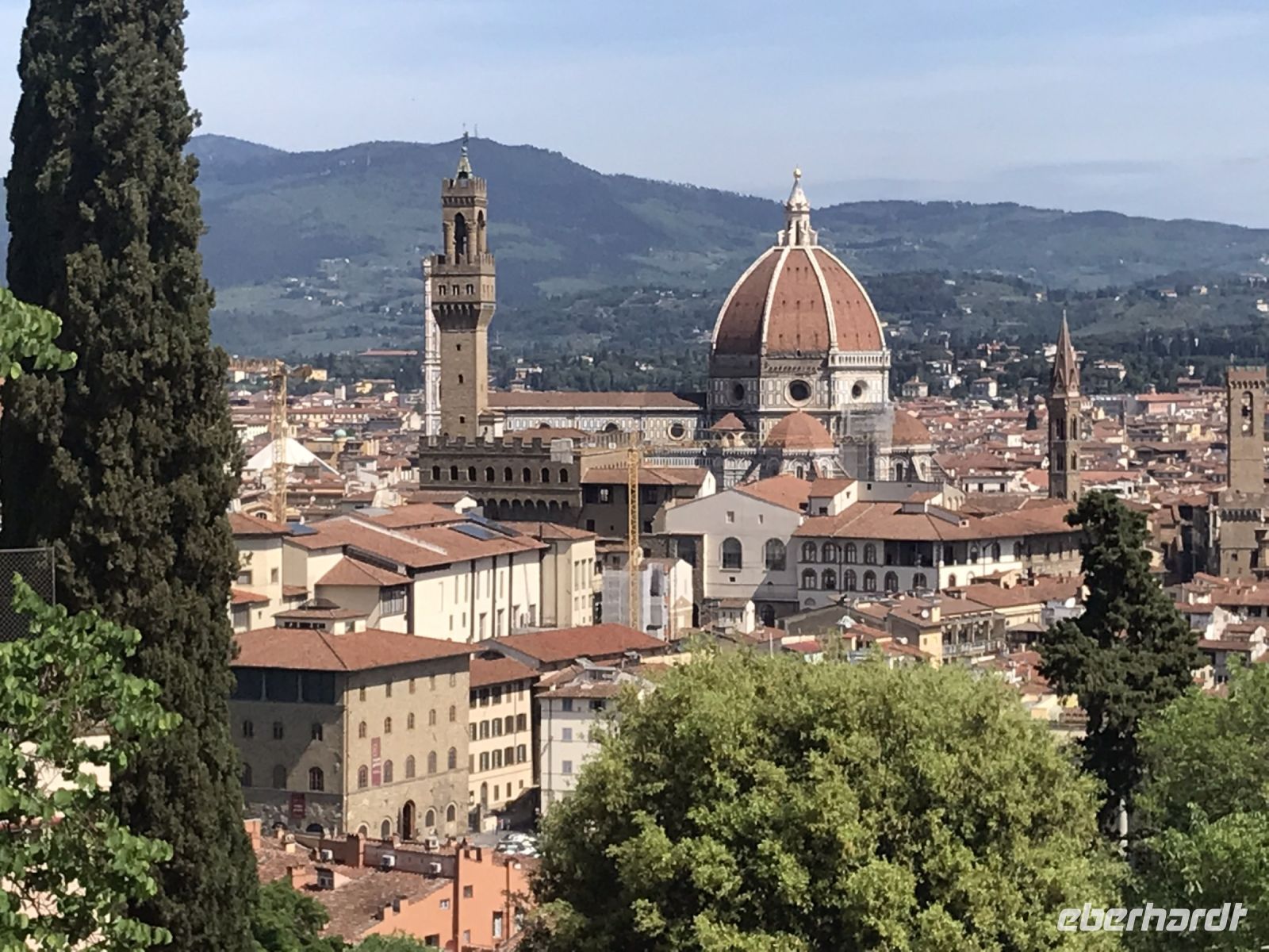 Durch das Dante-Viertel erreichen wir die Kathedrale, deren immense Kuppel sich schon mehrmals als Fotomotiv präsentiert hatte. Wir nehmen die Paradiestür in Augenschein, ehe wir über mehr als 400 Stufen auf die Domkuppel steigen. Einzigartig das Panorama, selbst der moderne Bau des Justizpalastes im Norden von Florenz bekommt da angenehme Konturen. Nach der luftigen Höhe lassen wir den Abend bodenständig in der Trattoria Ma So ausklingen.