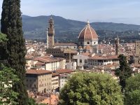 Am Nachmittag wartet unsere Stadtführerin Angela auf uns und mit ihr bummeln wir durch das Zentum, vorbei am Palazzo Strozzi, über die Ponte Vecchio durch San Niccolo und durch den Rosengarten hinauf bis auf die Piazzae Michelangelo, wo uns Florenz in aller Schönheit zu Füßen liegt. Da kann man für einen Augenblicl auch Müdigkeit und schmerzende Füße vergessen. Stundenlang könnte man schauen und staunen, doch die Zeit drängt, der Magen knurrt und in der Trattoria Centopoveri ist ein langer Tisch für uns gedeckt. Der lange Tag klingt genussvoll aus und im Hotel wartet endlich das Bett. Gute Nacht!