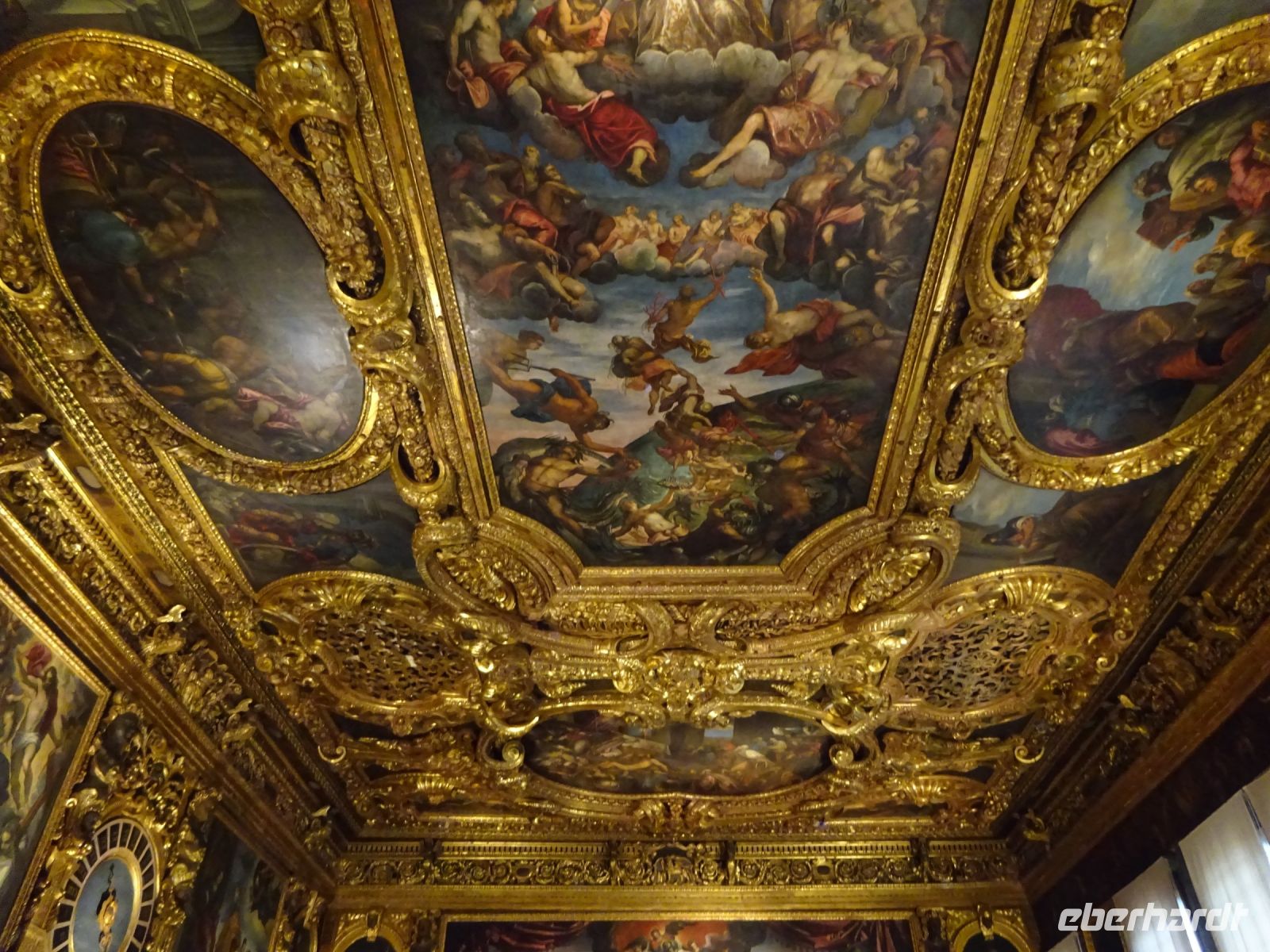 Dann treffen wir zur verabredeten Zeit Cristina, besprechen mit ihr kurz einige Einzelheiten des Programms, schon spazieren wir los. Unser erster Programmpunkt heute ist der Dogenpalast (Palazzo Ducale). Wer hier vorgebuchte und bezahlte Tickets hat, so wie wir, ist gut dran, denn er kann vorbei an der Schlange hinein, spart sehr viel Zeit und auch Kraft. Im Innenhof des Palastes gibt es erste Erklärungen durch Cristina. Dann gehen wir hinein, sehen die Treppe der Giganten und jede Menge reich geschmückter Räume. Überall hängen Originale von Tintoretto. Cristina erklärt uns immer wieder historische Hintergründe, stellt Zusammenhänge her, macht uns mit dem Inhalt der Gemälde vertraut. Und ein Foto von der Seufzerbrücke darf auf keinen Fall fehlen. Über die Brücke gingen die Gefangenen zur Hinrichtung. An den Gefängniszellen waren wir zuvor schon vorbei gekommen.