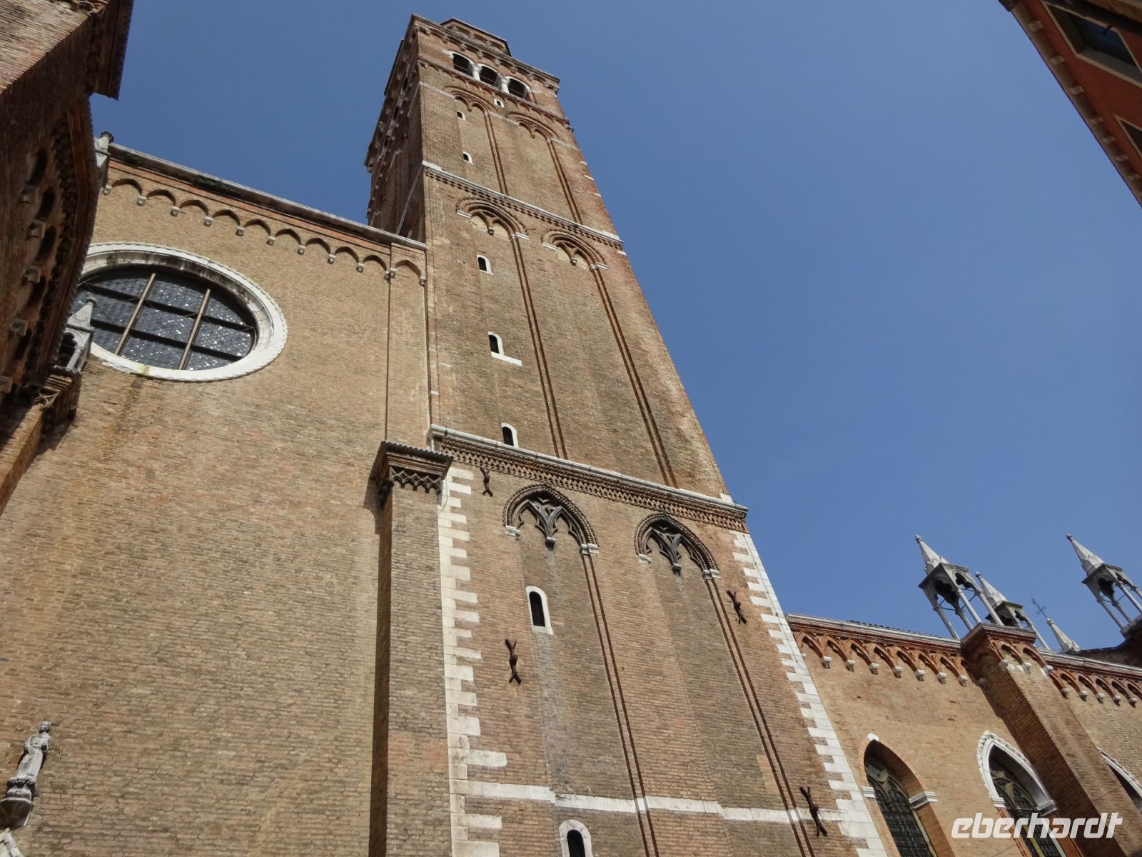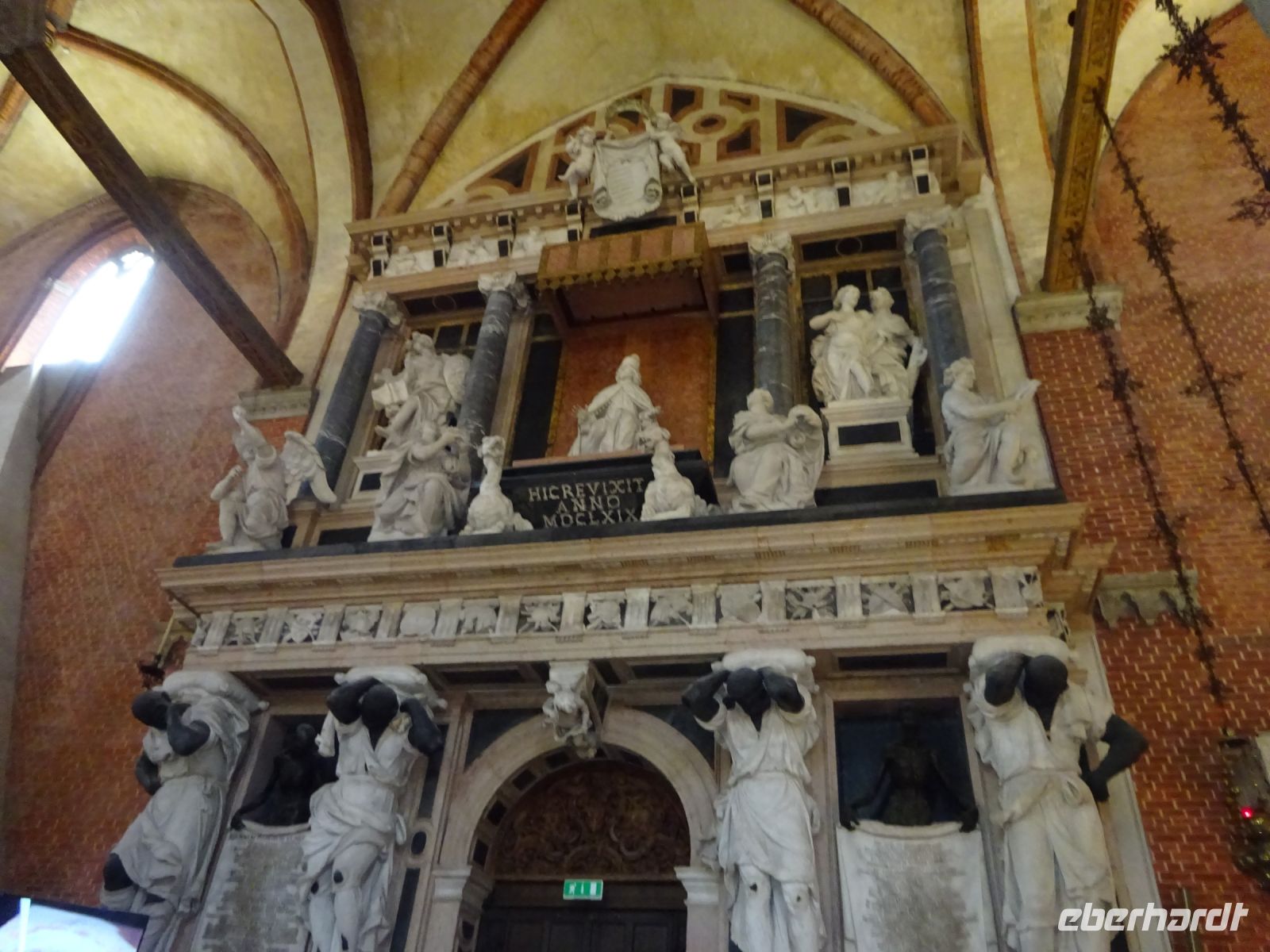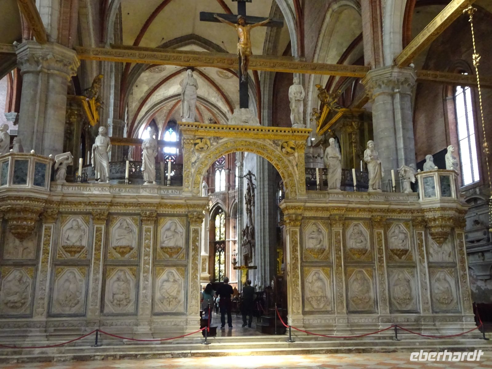 Cristina holt uns am Hotel ab, denn unser heutiges Programm beginnt ganz in der Nähe des Hotels. Wir besuchen zunächst die gotische Kirche Santa Maria Gloriosa dei Frari. Dies ist einer der größten und wichtigsten Sakralbauten Venedigs. Außen eher schlicht, innen ausgestattet mit wertvollen Kunstwerken. Gleich zwei Hauptwerke Tizians finden sich hier, dazu eine ganze Reihe von Grabstätten von Dogen und bedeutenden Künstlern.
