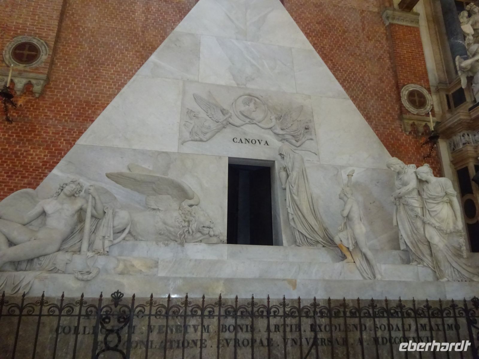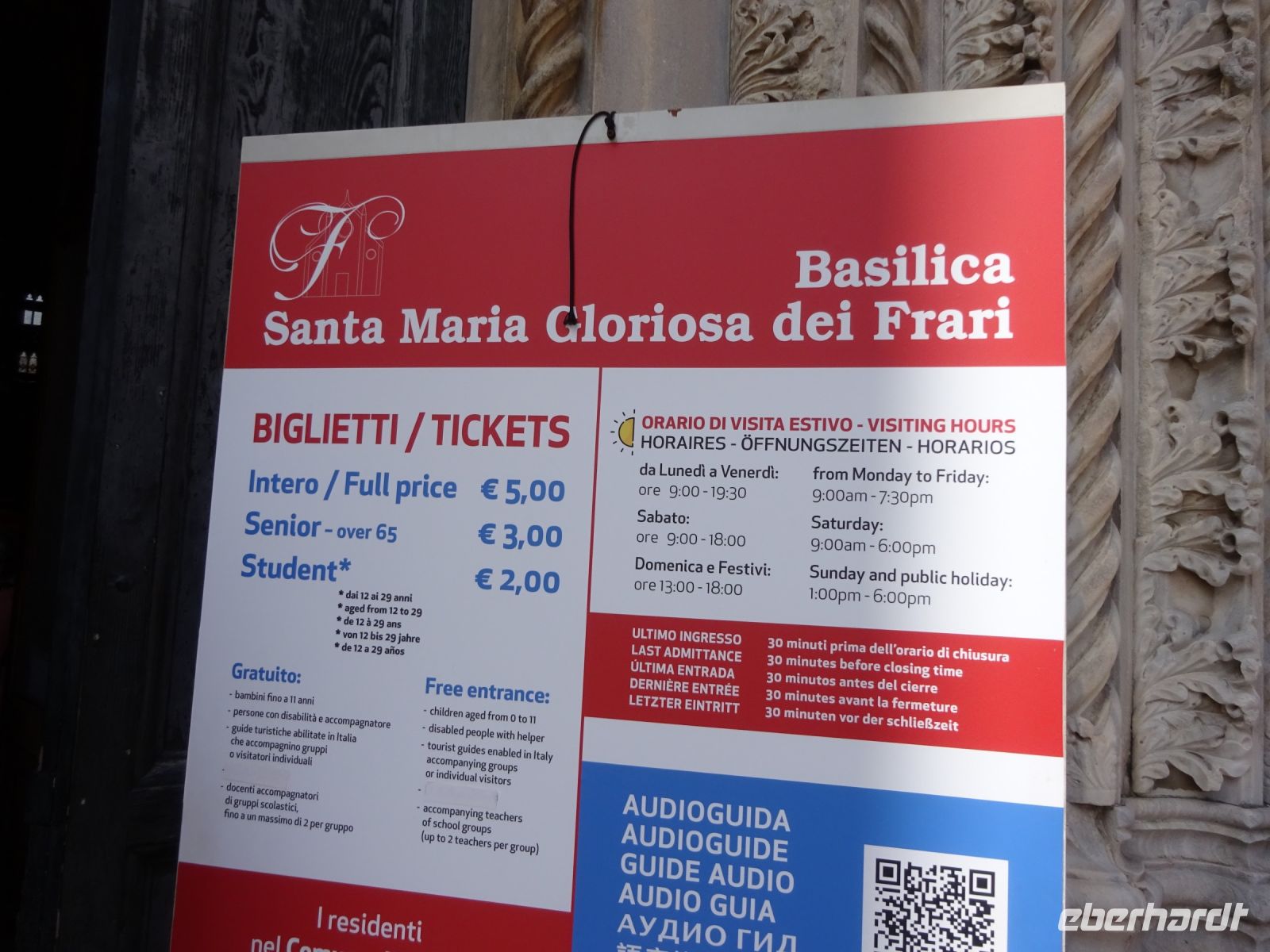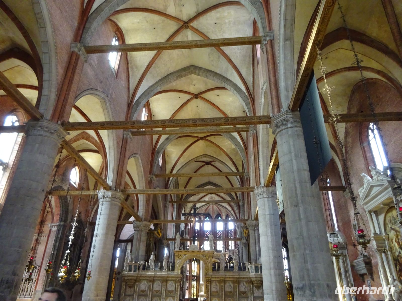 Cristina holt uns am Hotel ab, denn unser heutiges Programm beginnt ganz in der Nähe des Hotels. Wir besuchen zunächst die gotische Kirche Santa Maria Gloriosa dei Frari. Dies ist einer der größten und wichtigsten Sakralbauten Venedigs. Außen eher schlicht, innen ausgestattet mit wertvollen Kunstwerken. Gleich zwei Hauptwerke Tizians finden sich hier, dazu eine ganze Reihe von Grabstätten von Dogen und bedeutenden Künstlern.