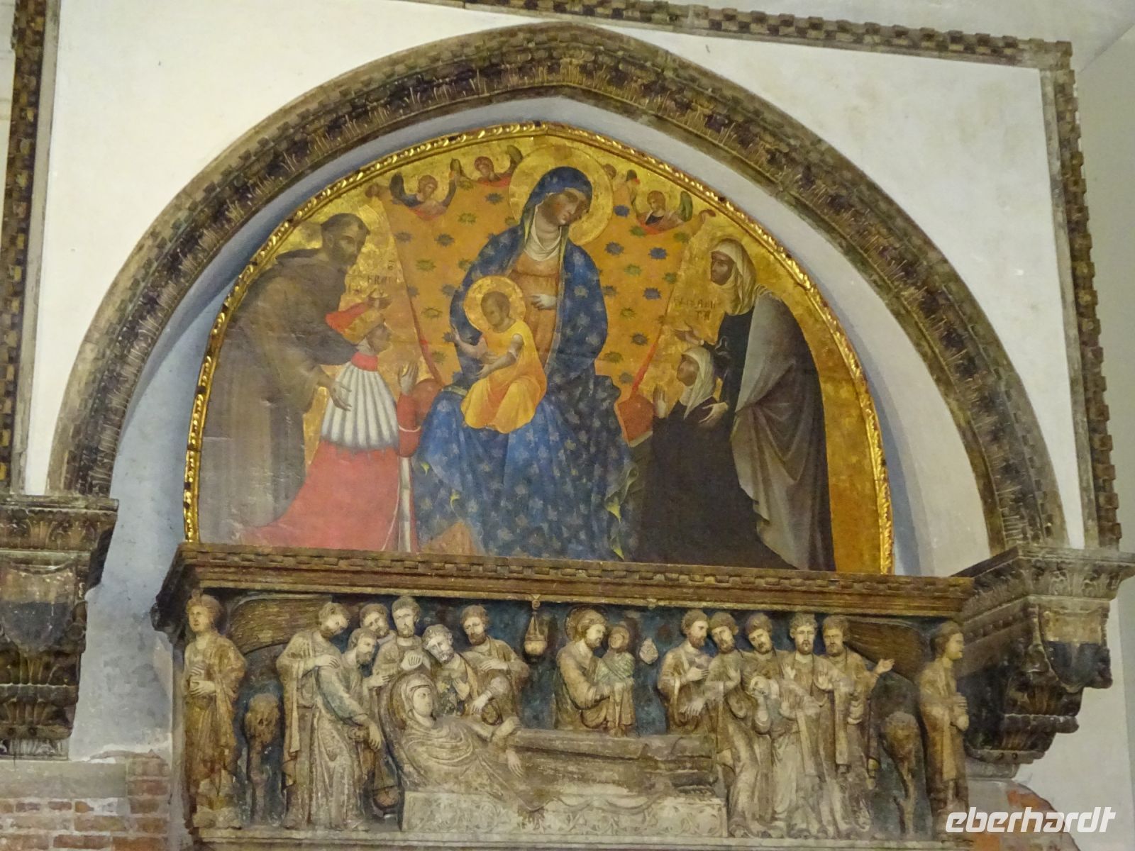 Vom Hotel ging es durch verwinkelte Gassen, vorbei an architektonischen Schmuckstücken, zuerst zur Kirche Ogni Santi [deutsch: Allerheiligen]. Eigentlich ist die Kirche ganz selten geöffnet, hörten wir unterwegs von Angela, aber wir hatten eben Glück und kamen hinein. Angela erklärte, machte aufmerksam, bot jede Menge Hintergrundwissen zu den Kunstwerken. Wir sahen herrliche Deckenmalereien, ein wertvolles und ganz frisch restauriertes Kruzifix von Giotto, dann gleich noch die äußerst schlicht gestaltete Grabstätte von Botticelli, alles große Namen.