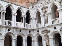 Gut gestimmt und gestärkt machen wir uns auf den Weg mit dem Vaporetto, einem so genannten Wasserbus, zum Markusplatz. Am Dogenpalast trafen wir dann unsere heute Stadtführerin. Die Fülle an herausragenden Kunstwerken im Dogenpalast und die vielen kostbar ausgestatteten Räume überforderten uns leicht, zumal unsere Stadtführerin keinerlei Gnade verspürte für so profane Bedürfnisse wie Durst, Hunger oder Toilette. Die ‚Treppe der Giganten‘ und all die Gemälde der großen italienischen Meister wie Tintoretto ließen uns aus dem Staunen nicht herauskommen.