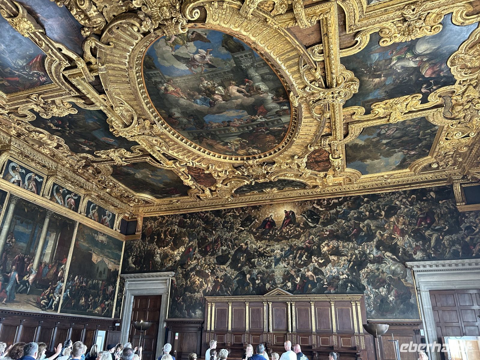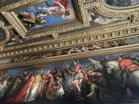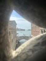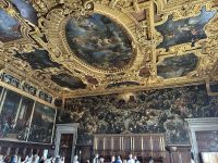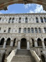 Gemütlich spazierten wir zur Wasserbus-Station San Tomá, wo wir den Vaporetto der Linie 1 bestiegen, der uns sanft und aussichtsreich zum Markusplatz brachte. Dort trafen wir unsere sympathische venezianische Gästeführerin Manuela Ilse, die uns direkt mitnahm auf eine spannende Reise durch die Geschichte und Geheimnisse des beeindruckenden Dogenpalastes. Wir betraten zunächst die prachtvollen Räume, deren beeindruckende Gemälde und vergoldete Decken uns staunen ließen. Besonders die gewaltigen Säle wie der Saal des Großen Rates mit Tintorettos monumentalem Gemälde „Das Paradies“ hinterließen einen nachhaltigen Eindruck. Ein besonderer Höhepunkt war jedoch der Gang durch die düsteren Verliese und die Seufzerbrücke, die den Dogenpalast mit dem historischen Gefängnis verbindet. Fast glaubten wir, die Seufzer der Gefangenen aus längst vergangenen Zeiten hören zu können – ein Moment voller Gänsehaut und Geschichte.