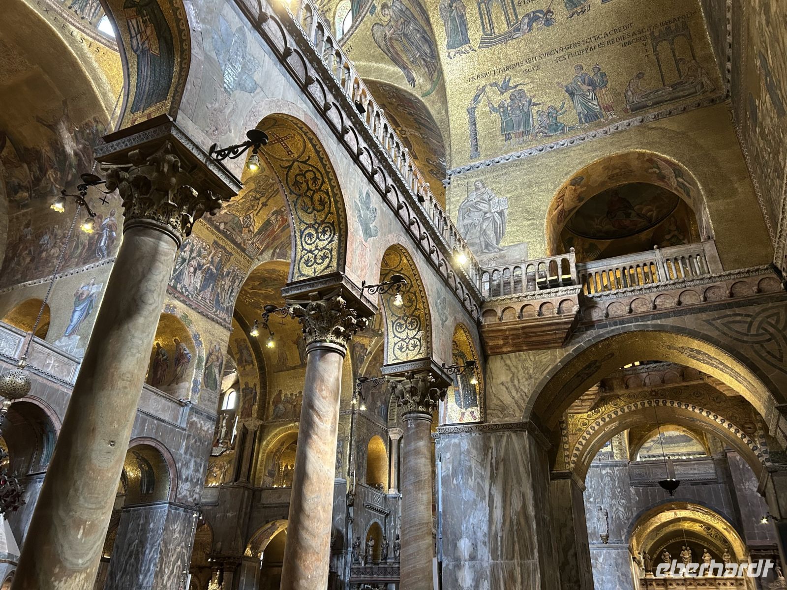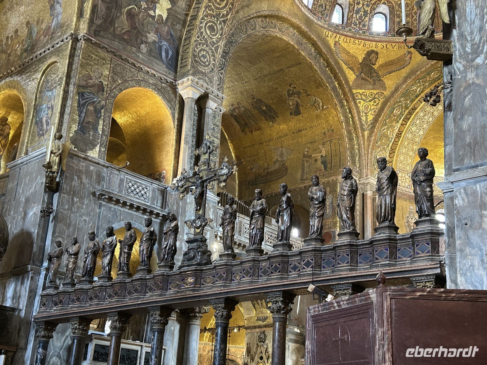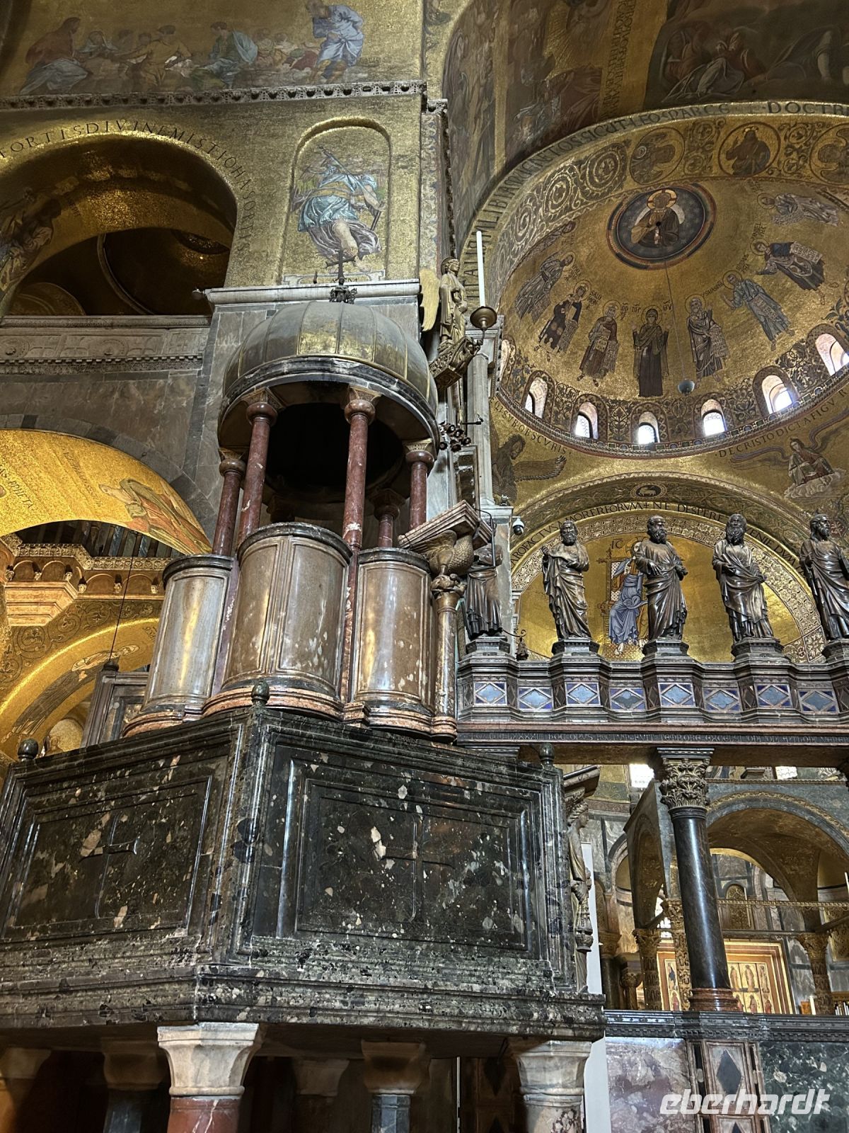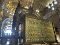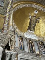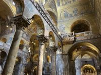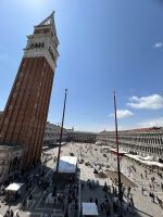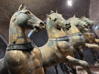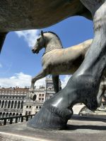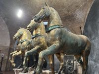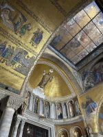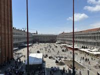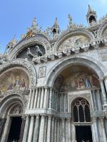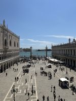Nach einer kleinen Pause auf dem lebhaften Markusplatz setzten wir unsere Erkundung im Markusdom fort. Bereits beim Betreten der Basilika waren wir überwältigt von den goldenen Mosaiken, die die gesamte Decke und Wände schmückten und im Licht funkelten wie ein himmlisches Feuerwerk. Besonders fasziniert hat uns die Pala d’Oro, die prächtige Altarwand aus massivem Gold, reich verziert mit unzähligen Edelsteinen. Im Dommuseum bewunderten wir die originalen bronzenen Pferdestatuen aus der Antike, die einst Konstantinopel schmückten, bevor sie hierher gelangten. Höhepunkt war jedoch zweifelsohne der Ausblick von der Loggia dei Cavalli, wo wir – genau wie die Protagonisten in „Inferno“ – einen atemberaubenden Blick auf den Markusplatz und das geschäftige Treiben darunter genießen konnten.