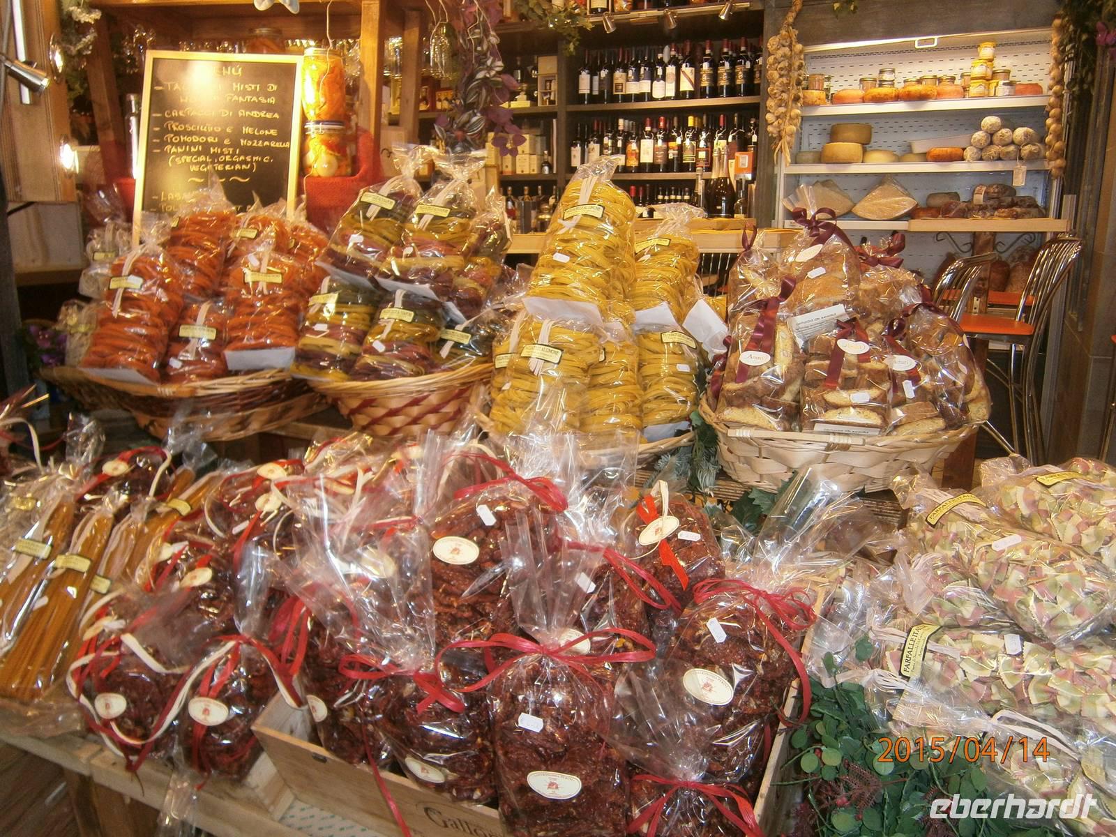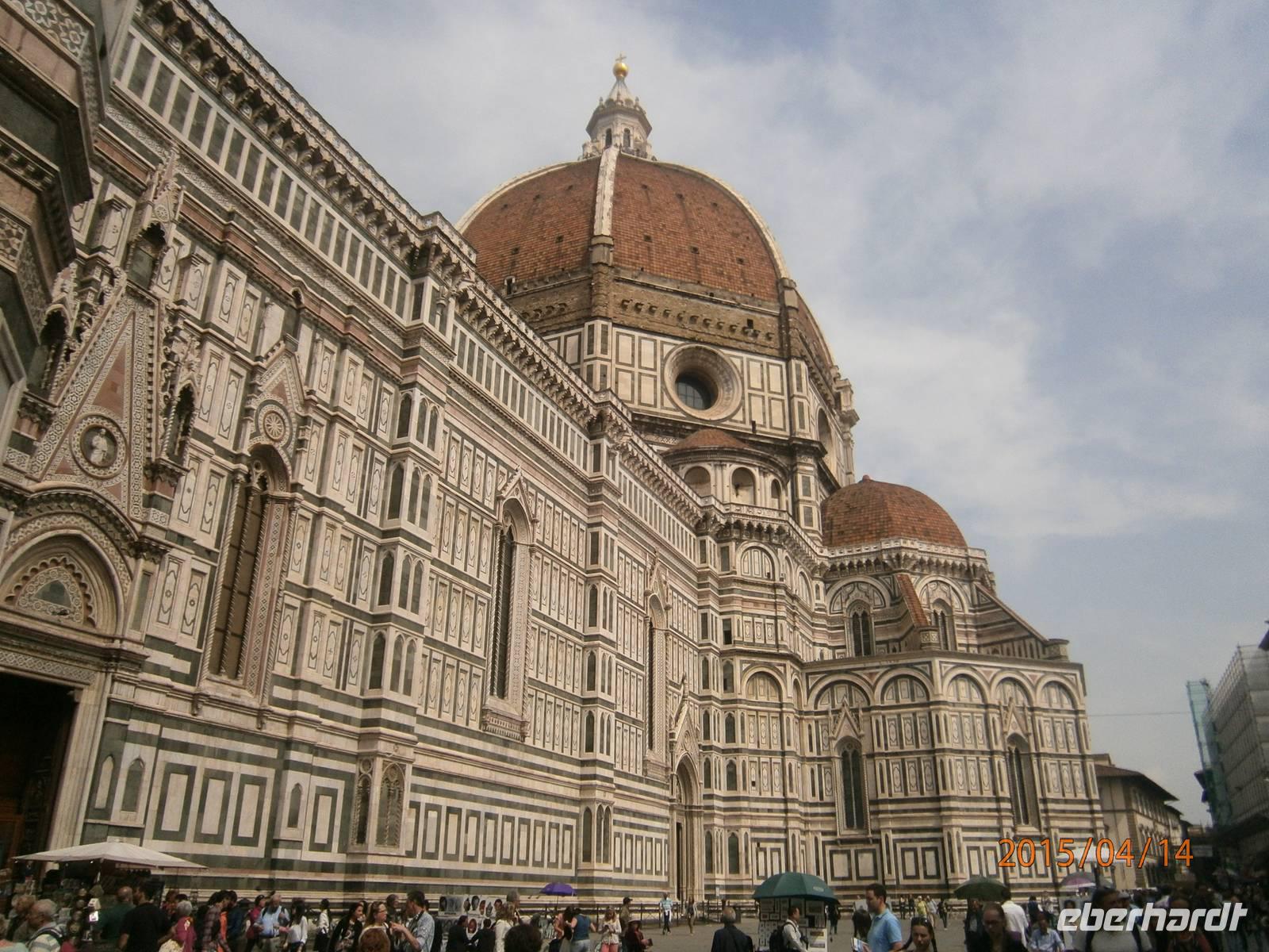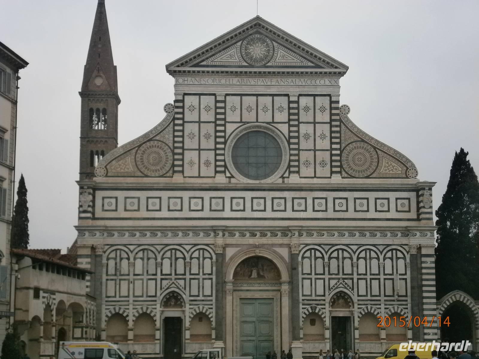 In den Tagen unseres Aufenthaltes werden wir mit unserer Gästeführerin Angela in Florenz unterwegs sein. Gemeinsam mit ihr starten wir, gut ausgerüstet mit dem Eberhardt - Reiseleiterfunk, zu unserer Stadtführung unter dem Motto „Die Kirchen von Florenz". Auf unserem Weg in die Innenstadt befindet sich an der Via della Scala eine der ältesten Apotheken der Welt. Die Officina Profumo - Farmaceutica di Santa Maria Novella. Sie wurde im 13. Jahrhundert von den Dominikanermönchen gegründet. In der heutigen Zeit werden die alten Traditionen aufrecht gehalten, man legt besonderen Wert auf die Verarbeitung von Heilpflanzen. Betritt der Besucher die Räumlichkeiten wird er von einem besonderen Duft umhüllt und man fühlt sich wie in einem Museum. Unmittelbar an der Piazza Santa Maria Novella erhebt sich die gleichnamige Kirche, ebenfalls erbaut von den Dominikanern. Die Fassade aus weißem Marmor aus Carrara und grünem Marmor aus Prato ist romanisch-gotisch. Von der Piazza aus spazieren wir weiter. Durch verwinkelte Gassen erreichen wir die Cappelle Medicee. Im Inneren führt eine Treppe von der Krypta zur Fürstenkapelle - ein mit kostbarem Steinmosaik ausgelegtem Raum für die Grabmale der Großherzöge der Toskana. Ebenfalls zum Museum gehörend ist die Neue Sakristei, die Michelangelo als Grabkapelle für das Haus der Medici erbaut hat. Die Kirche San Lorenzo, der ältesten Kirche in Florenz statten wir als nächstes einen Besuch ab. Die ursprüngliche Kirche wurde im Jahr 393 geweiht. Cosimo der Ältere ließ sie von Brunelleschi vergrößern und erweitern. Nicht weit entfernt steht die Markthalle - Mercato Centrale. Sie ist ein Beispiel für die Architektur des 19. Jahrhunderts - eine Konstruktion aus Eisen und Glas. Da es hier viele italienische Spezialitäten gibt - Gewürze, Käse, Obst, Gemüse, Nudeln und vieles mehr - nutzen wir gleich die Möglichkeit für die Mittagspause.