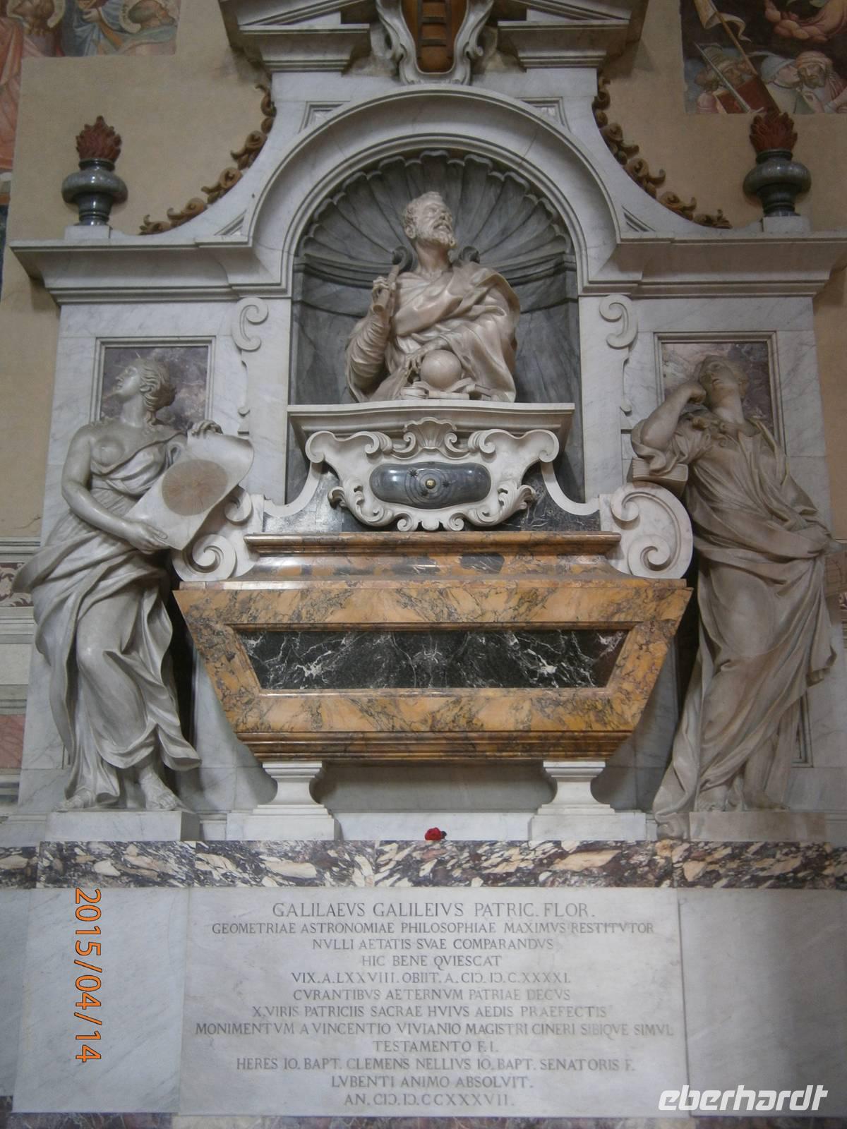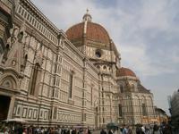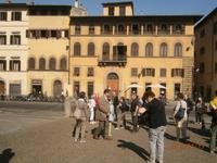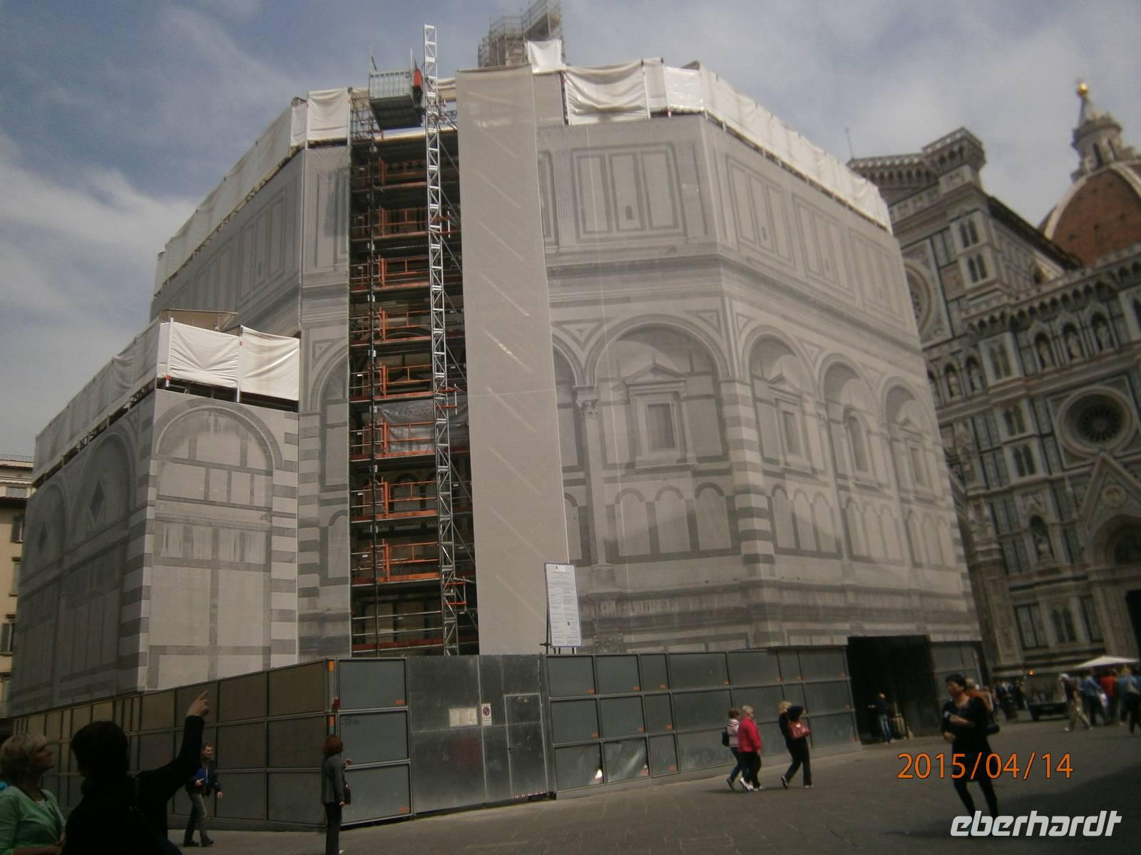 Danach spazieren wir weiter - auf den Spuren der Kirchen in Florenz - und erreichen die Piazza del Duomo. Hier erheben sich zum einen der 82 m hohe Glockenturm, den Giotto entworfen hat, zum anderen die Cattedrale di Santa Maria del Fiore (benannt nach den Lilien im Stadtwappen von Florenz) mit der achtseitigen Kuppel von Filippo Bruneleschi. Auch diese Kirche ist mit verschieden farbigem Marmor verkleidet und ihr gegenüber steht das Baptisterium - Battisterio San Giovanni. Der achteckige Kuppelbau versteckt sich seit geraumer Zeit hinter Planen und Tüchern - er wird restauriert. Dennoch bestaunen unsere Gäste eine der Bronzetüren von Andrea Pisano und Lorenzo Ghiberti - die Porta del Paradiso. Die letzte Kirche, die wir besichtigen, ist die Basilica di Santa Croce. Die Franziskanerkirche wurde Ende des 13. Jahrhunderts begonnen und beherbergt zahlreiche Kunstwerke, darunter berühmte Fresken von Giotto. Außerdem ist sie bekannt für die Grabstätten berühmter Persönlichkeiten. Darunter die Grabmale von Michelangelo, Dante Aligheri, Galileo Galilei und Rossini. Zum Abschluss des Besichtigungstages schließen sich einige unserer Gäste Angela an und spazieren zu einer Gelateria - hier gibt es das wohlverdiente Eis.