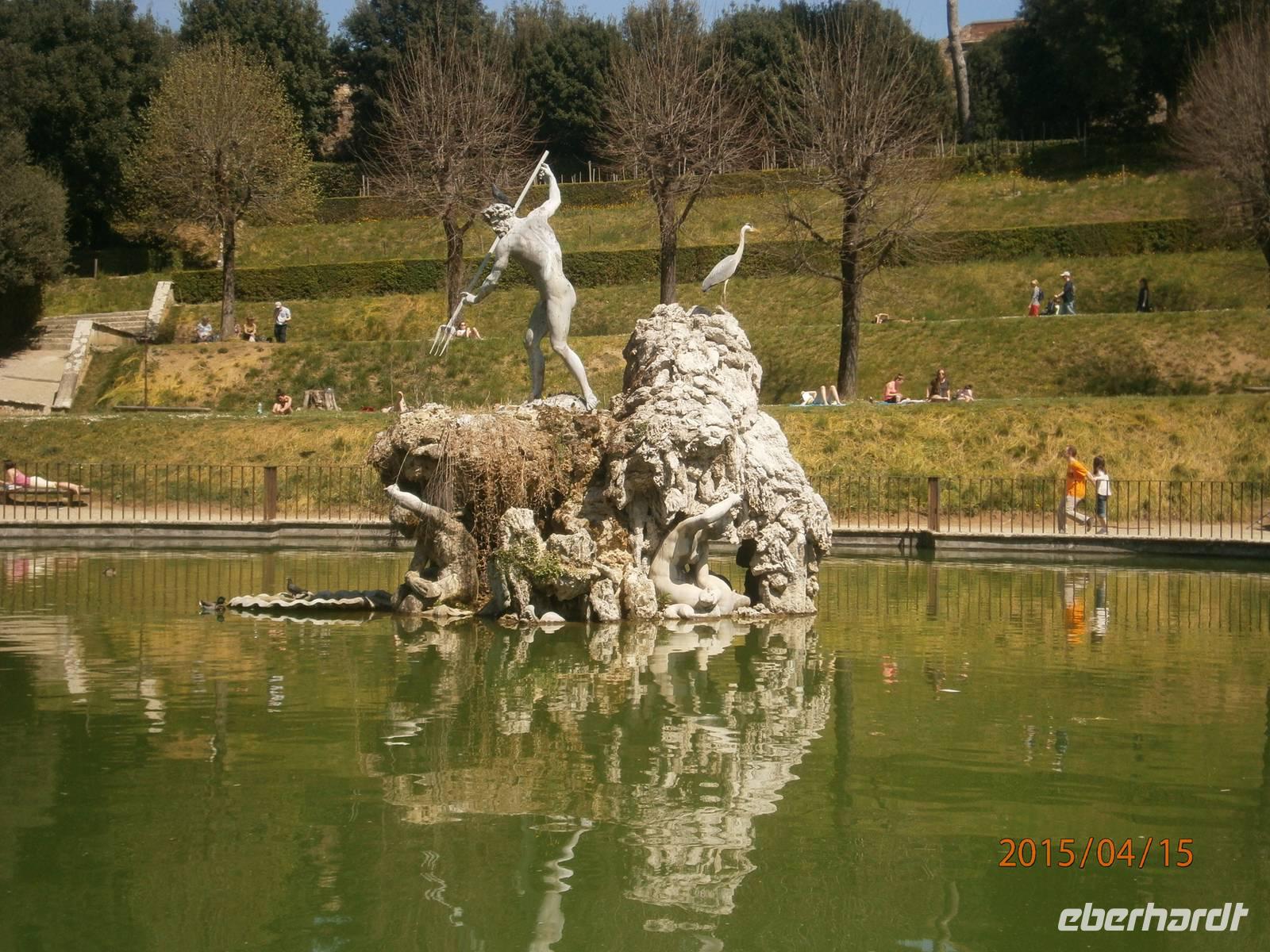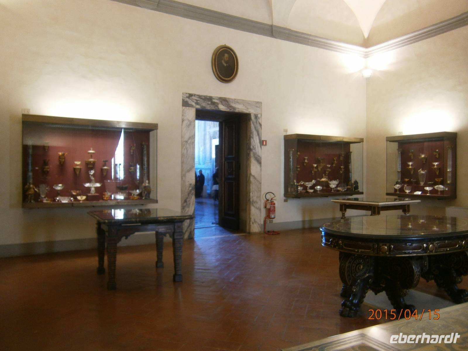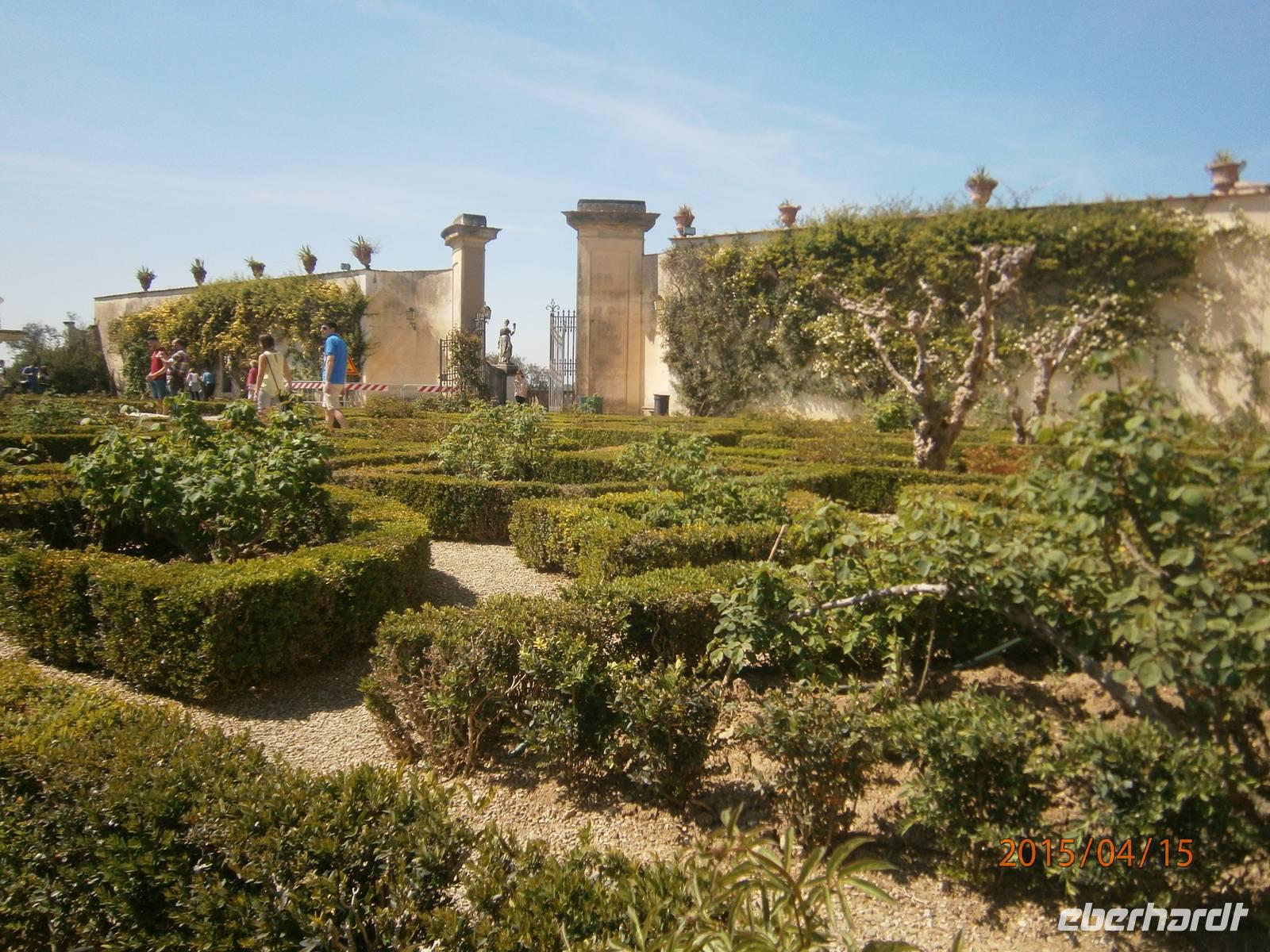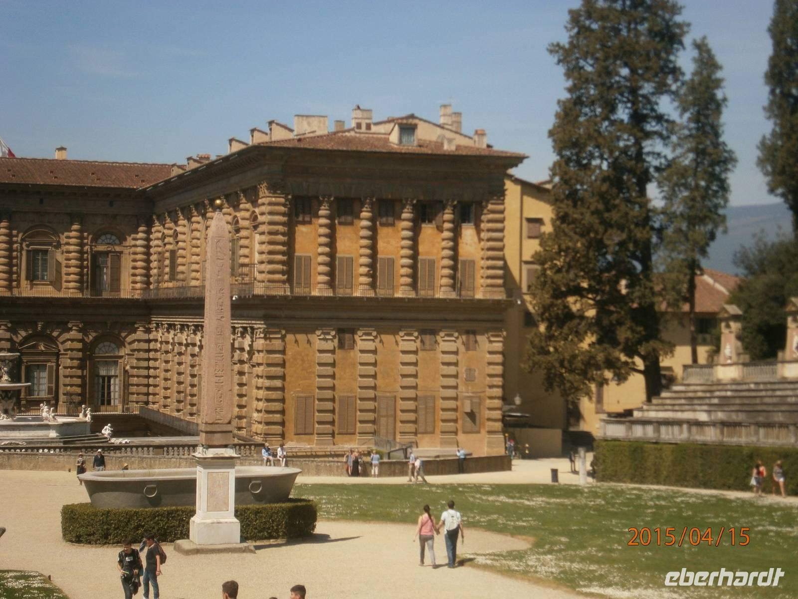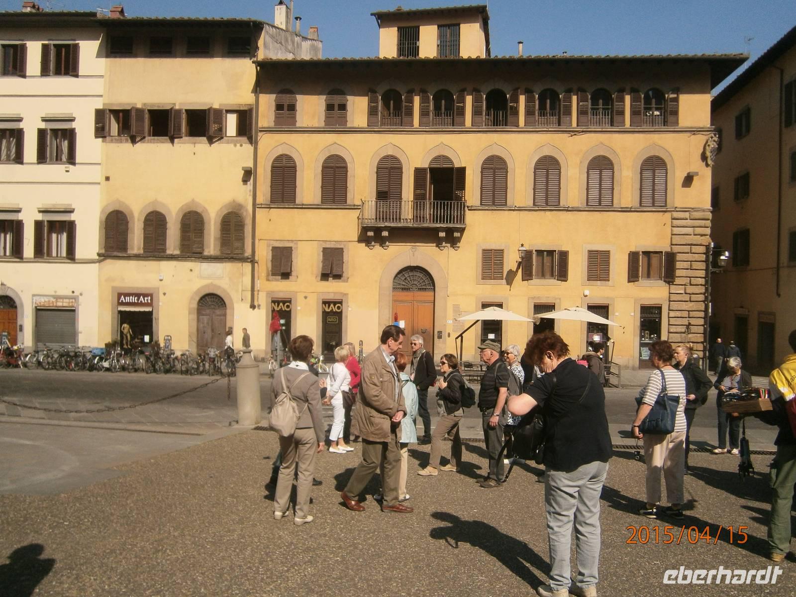 Florenz zeichnet sich nicht nur durch die zahlreichen Kirchen aus. Zu den Sehenswürdigkeiten der Stadt zählen auch der Palazzo Pitti und die sich anschließende Boboligarten. Auf dem Weg zum Palazzo überqueren wir die Ponte Vecchio. Die älteste Brücke der Stadt mit den typischen Juwelier- und Goldschmiedegeschäften wurde im 14. Jahrhundert errichtet und zählt zu den Wahrzeichen von Florenz. Von hier aus erreichen wir die Piazza die Pitti. Markanter Bau ist der Palast der im 15. Jahrhundert von Luca Pitti in Auftrag gegeben wurde. Der Palast wurde im Verlaufe der Jahrhunderte vielfach verändert und umgebaut. Heutzutage befinden sich im Palast verschiedene Museen und Galerien. Darunter auch das Silbermuseum - Museo degli Argenti. Zu sehen sind unter anderen Edelsteinvasen und Bergkristalle. Des weiteren ein Bernsteinsammlung von Maria Magdalena von Österreich und der Schmuck der letzten Medici - Herzogin Anna Maria Luisa. Auch ein Altare Portale aus dem 18. Jahrhundert des aus Dresden stammen soll, zählt zu den Ausstellungsstücken. Die verdiente Mittagspause legen wir auf der Piazza S. Spirito ein. Gut ausgeruht und gestärkt bewältigen wir den Aufstieg in die Boboli - Gärten. Der Giardino di Boboli ist eine Parkanlage mit verschiedenen Brunnenanlagen Er erstreckt sich am Hang aufwärts und bietet von seinen Terrassen immer wieder fantastische Ausblicke auf Florenz. In der Parkanlage steht die ehemalige Orangerie - heute der Palazzino del Cavaliere, beherbergt ein Porzellanmuseum mit italienischen, französischen und deutschen (Meißner Porzellan) Ausstellungsstücken. Wir spazieren weiter, an der Festung Forte Belvedere vorbei, hinüber zu den Bardini - Gärten. Nach längerer Vernachlässigung erwarb ein Antiquitätenhändler die Anlage und ließ sie wieder herrichten. Vom Belvedere aus eröffnen sich auch hier wieder Ausblicke auf die Stadt. Angela meint es an diesem Tag zu gut mit uns und ermuntert unsere Gäste mit ihr weiter zu spazieren - durch den Giardino delle Rose zur Piazzale Michelangelo. Der Platz wurde 1869 angelegt und bietet den Besuchern einen einmaligen Blick auf die Altstadt von Florenz und den Arno. Im Zentrum des Platzes steht eine Bronzekopie des David von Michelangelo. Über eine große Freitreppe steigen wir wieder hinab und erreichen die Ponte alle Grazie. Von hier ist es nur ein kurzer Weg und unsere Gäste sind wieder in der Altstadt.
