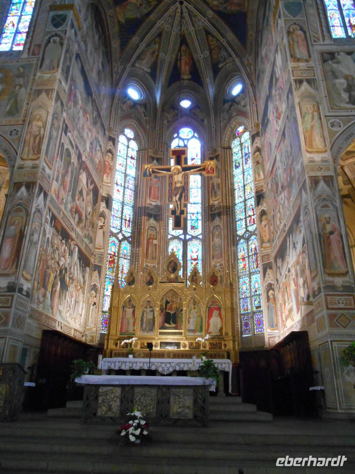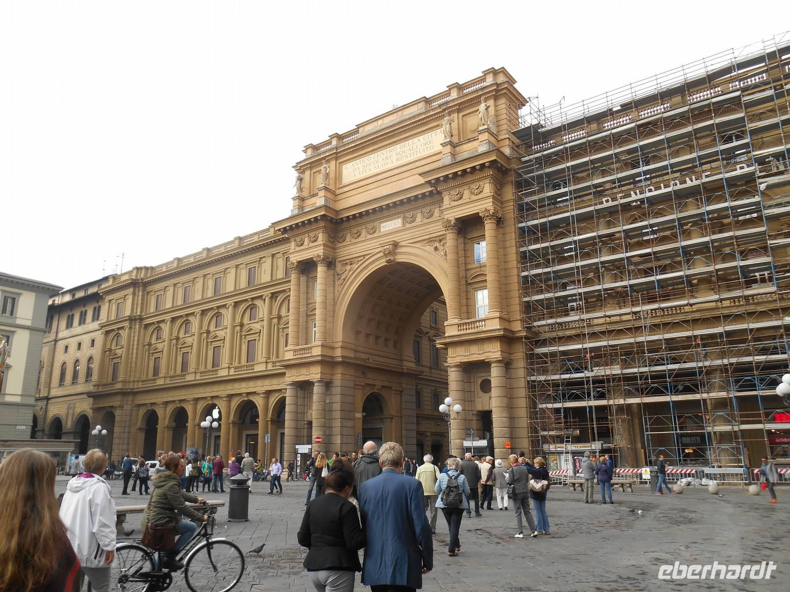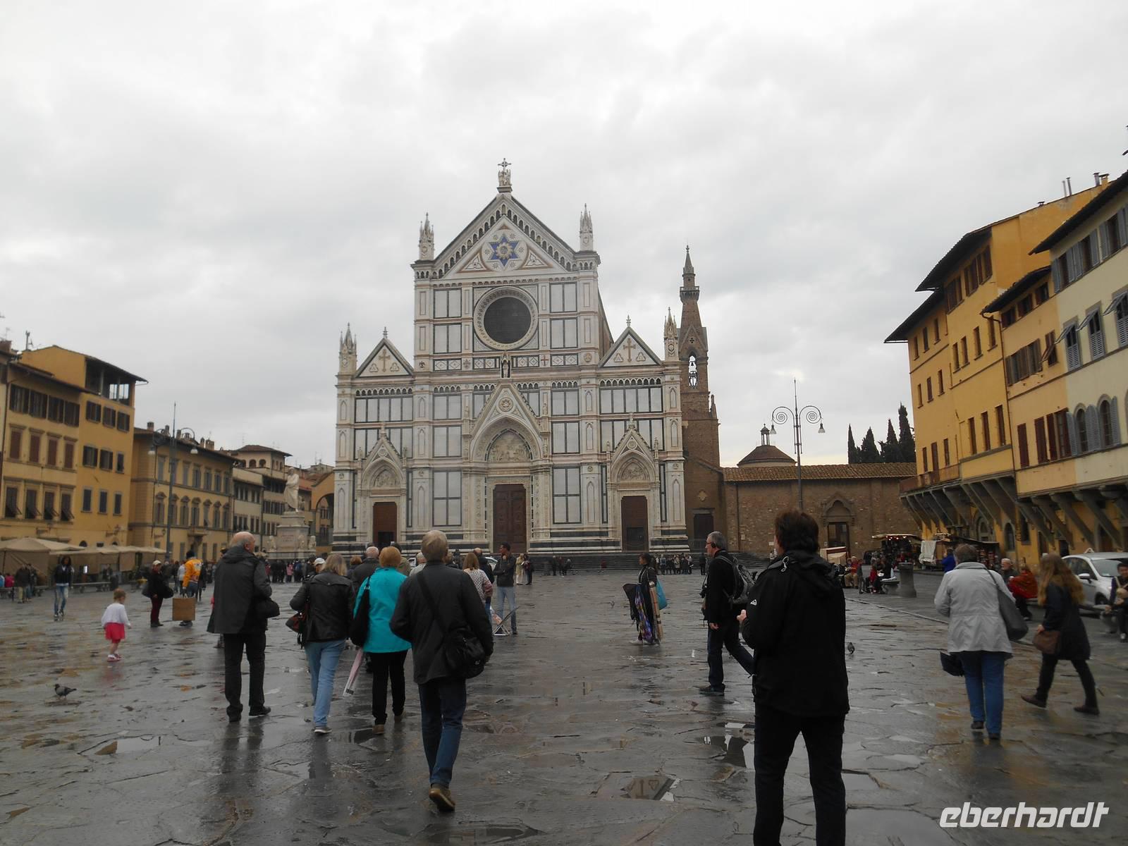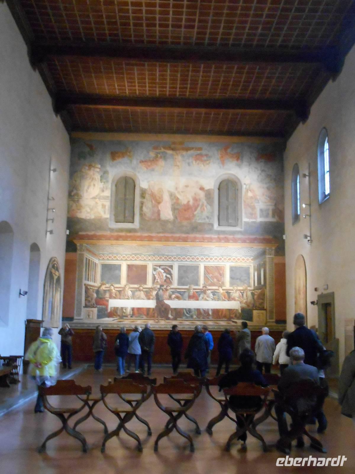 Kloster San Apollonia. Das erste Refektorium der Renaissance in Florenz ist jenes der Benediktinernonnen von „S. Apollonia", das um 1445, zur Zeit des größten Glanzes des Klosters, geschaffen wurde. Die hintere Wand des Refektoriums (9,75 x 9,10 m) war damals von Fresken bedeckt, doch die strenge Klausur der Nonnen bewirkte, daß man für lange Zeit nichts von diesen Werken wußte, so dass erst die Auflösung des Klosters im Jahre 1860 die Existenz lediglich des Freskos des „Ultima Cena" (Letztes Abendmahl) zu Tage brachte - der obere Bereich war übertüncht worden -, welches zuerst Paolo Uccello, dann aber seinem wahren Autor zugeordnet wurde, Andrea del Castagno (1421-1457), der daran nach seiner Rückkehr aus Venedig im Jahre 1444 arbeitete. Oberhalb davon wurden später weitere drei Fresken entdeckt: die „Resurrezione" (Auferstehung), die „Crocefissione" (Kreuzigung) und die „Seppellimento di Cristo" (Grablegung Christi), die bei der Restauration 1952 aus Gründen der Erhaltung abgelöst wurden, wodurch darunter aber die wundervollen Entwurfszeichnungen zum Vorschein kamen. Voller Eindrücke erreichten wir die zentrale Markthalle von Florenz. Das zweistöckige Gebäude wurde im Jahr 1874 eröffnet und obwohl das Design sehr modern für seine Zeit war, passt es dank der traditionellen Gestaltung der Steinfassade des Erdgeschosses und den Arkadenfenstern sehr gut zum Rest des Stadtbilds. Die obere Etage mit ihrem roten Eisenrahmen und grünen Fensterwerk wirkt etwas auffälliger. Die Fenster gleich unter dem hellen, wasserfarbenen Dach bringen ein natürliches Licht in die Mitte der Markthalle. Der Mercato Centrale befindet sich im Zentrum vom San Lorenzo Markt. Der große Freiluft-Markt befindet sich zwischen den Straßen und Plätzen rund um die Basilica di San Lorenzo. Hier verkaufen viele Händler ihre Produkte an die Passanten - meist Lederwaren, Kleidung und Souvenirs. Im Mercato Centrale findet man auch Lebensmittel. Die Läden im Erdgeschoss bieten Fisch, Fleisch, Käse und typisch toskanische Snacks wie „lampredotto" und „budelline", beides lokale Kuttel-Spezialitäten. Gemüse und Blumen werden auf der oberen Etage der Markthalle verkauft. Anschließend besichtigten wir die benachbarte Basilica di San Lorenzo, die ehemalige Pfarrkirche der Medici Familie. Mitglieder dieser reichen und mächtigen Familie wurden hier begraben. Die Kirche, die ursprünglich von Filippo Brunelleschi im 15. Jahrhundert entworfen wurde, ist ein frühes Beispiel der kirchlichen Architektur der Renaissance. Von hier aus flanierten wir weiter - die Besichtigung des Domes stand nunmehr auf unserem Programm! Der Dom von Santa Maria del Fiore wurde 1434 vollendet und ist die bedeutendste Sehenswürdigkeit von Florenz sowie die viertgrößte Kirche der Welt. Er ist auch weltbekannt für seine riesige Kuppel, eine technische Meisterleistung der Renaissance und ist von jedem Hügel und Aussichtspunkt aus sichtbar. Die riesige Kuppel des Doms mit einer Höhe von 114 m ragt meterhoch über die Häuserdächer hinaus. Der florentinische Dom wurde übrigens der Muttergottes geweiht, daher das „Santa Maria". Der Zusatz „del Fiore" bedeutet „der Blume" und bezieht sich auf das Stadtwappen, die Lilie, von Florenz. Die Mittagspause verbrachten wir in der Nähe des Domes und voller neuer Energie besuchten wir am Nachmittag die Orsanmichele, einen ursprünglichen Getreidemarkt. Heutzutage wird die untere Etage als Kirche benutzt, während die oberen Etagen ein kleines Museum beherbergen. Unser Spaziergang führte uns weiter über die Piazza della Signoria zur Kirche Santa Croce. Sie wurde im Jahr 1294 nach einem Entwurf des berühmten Architekten Arnolfo di Cambio gegründet und ist eine der großartigsten und ältesten Franziskanerkirchen der italienischen Gotik. Die Basilika wurde zum letzten Ruheort berühmter Persönlichkeiten erkoren und birgt die so genannten „Urne dei Forti" (die Gräber der Mächtigen), darunter auch das Grab des Michelangelo. Erst nach der Beisetzung des Dichters Ugo Foscolo im Jahr 1871 wurde Santa Croce erst richtig für die Beerdigung berühmter Persönlichkeiten gewählt. Doch in Wirklichkeit ruhen hier bereits seit Jahrhunderten die Gebeine von fast fünfzehntausend Vertretern aller Kunstrichtungen wie Gioacchino Rossini, Leon Battista Alberti, Vittorio Alfieri, Galileo Galilei, Machiavelli und Enrico Fermi. Hier endete auch unser heutiges Besichtigungsprogramm und jeder kehrte individuell zum Hotel zurück - mittlerweile kannten wir uns ja alle auch ziemlich gut in der Stadt aus.