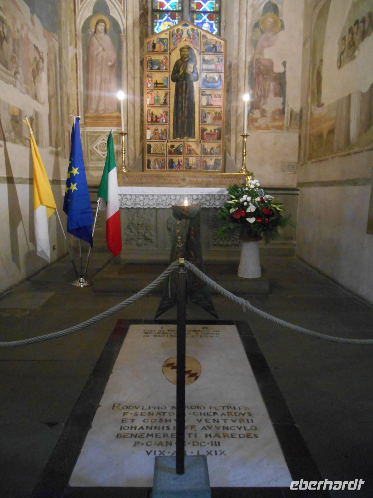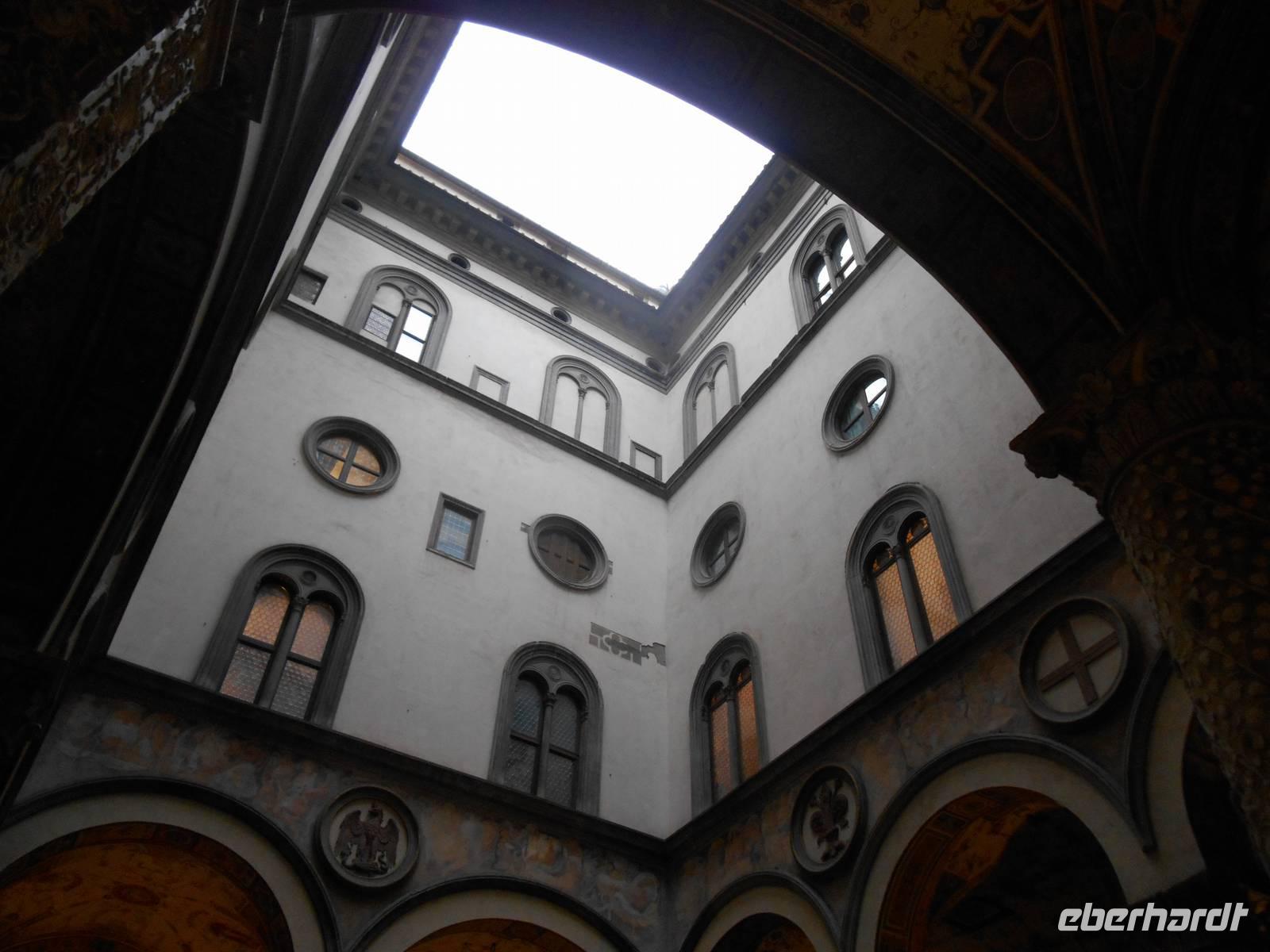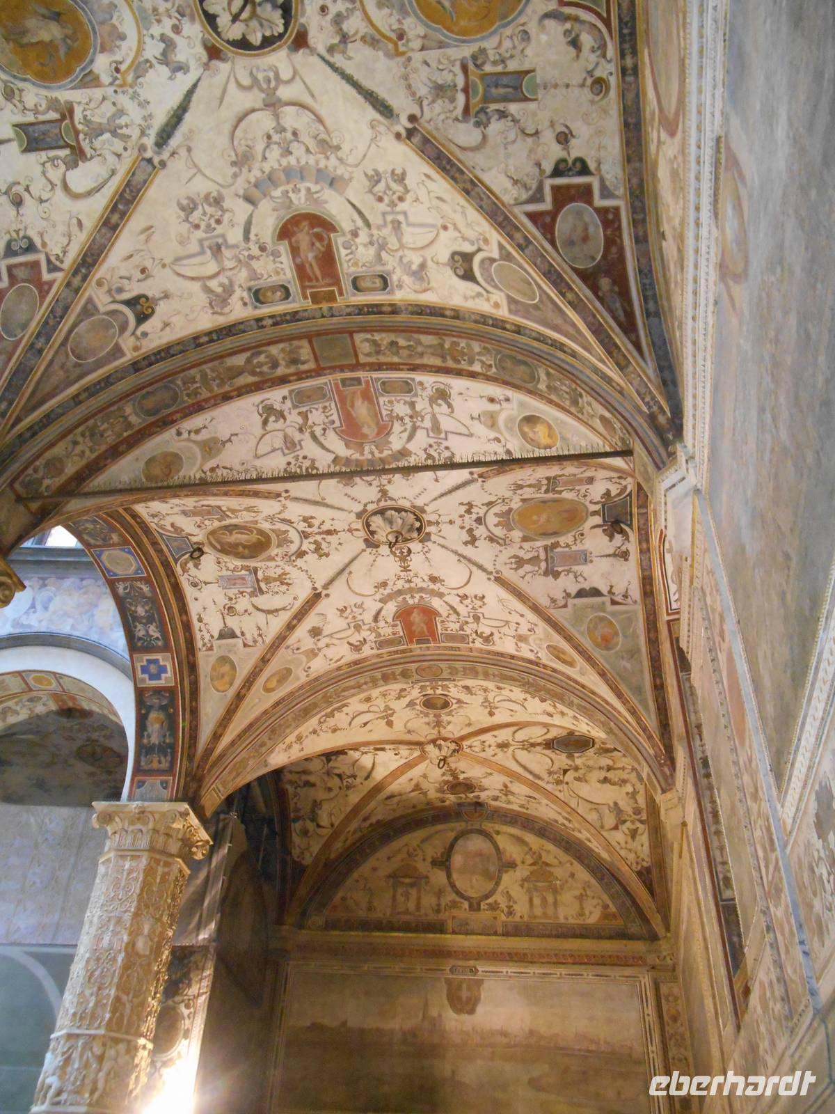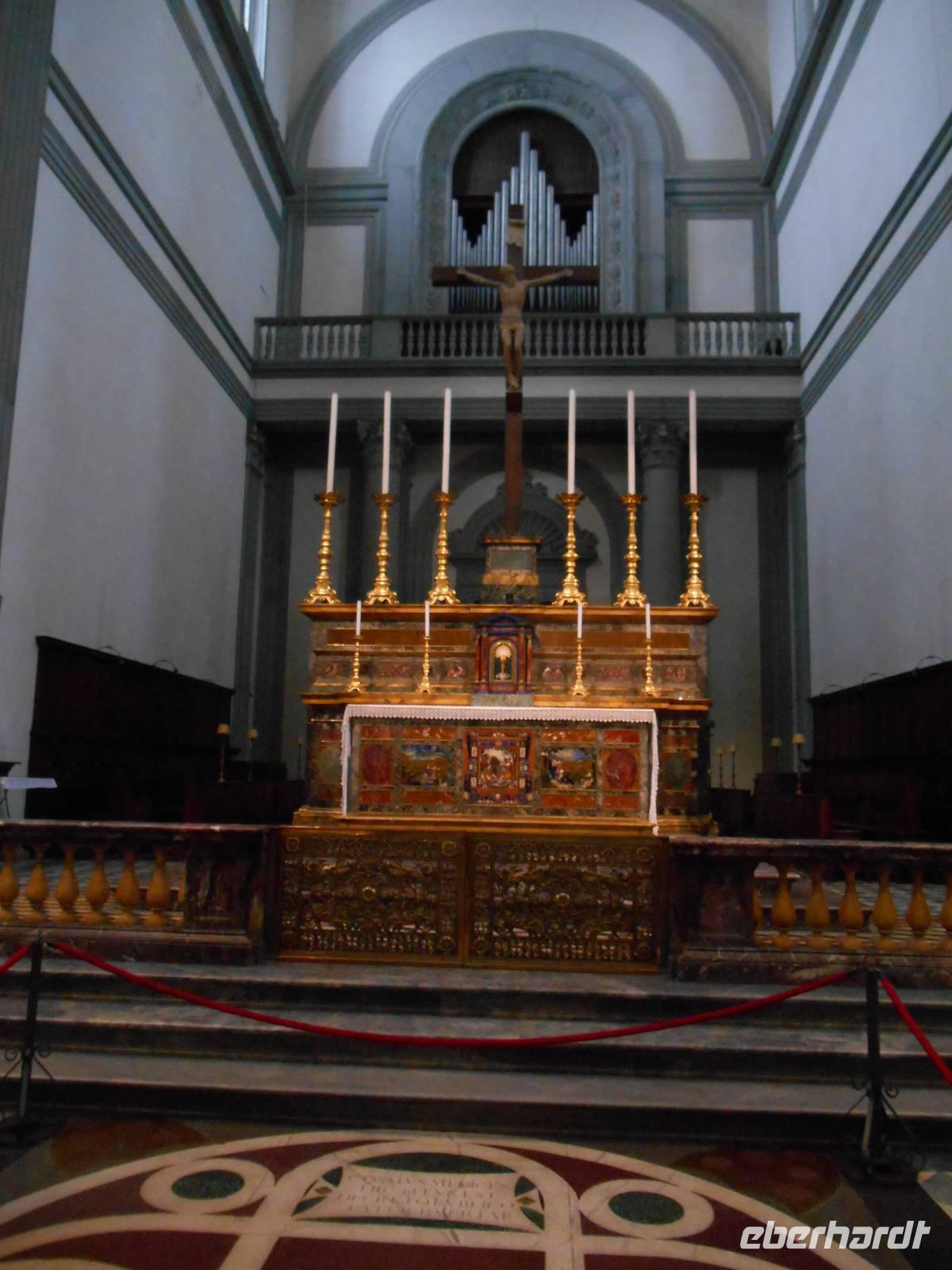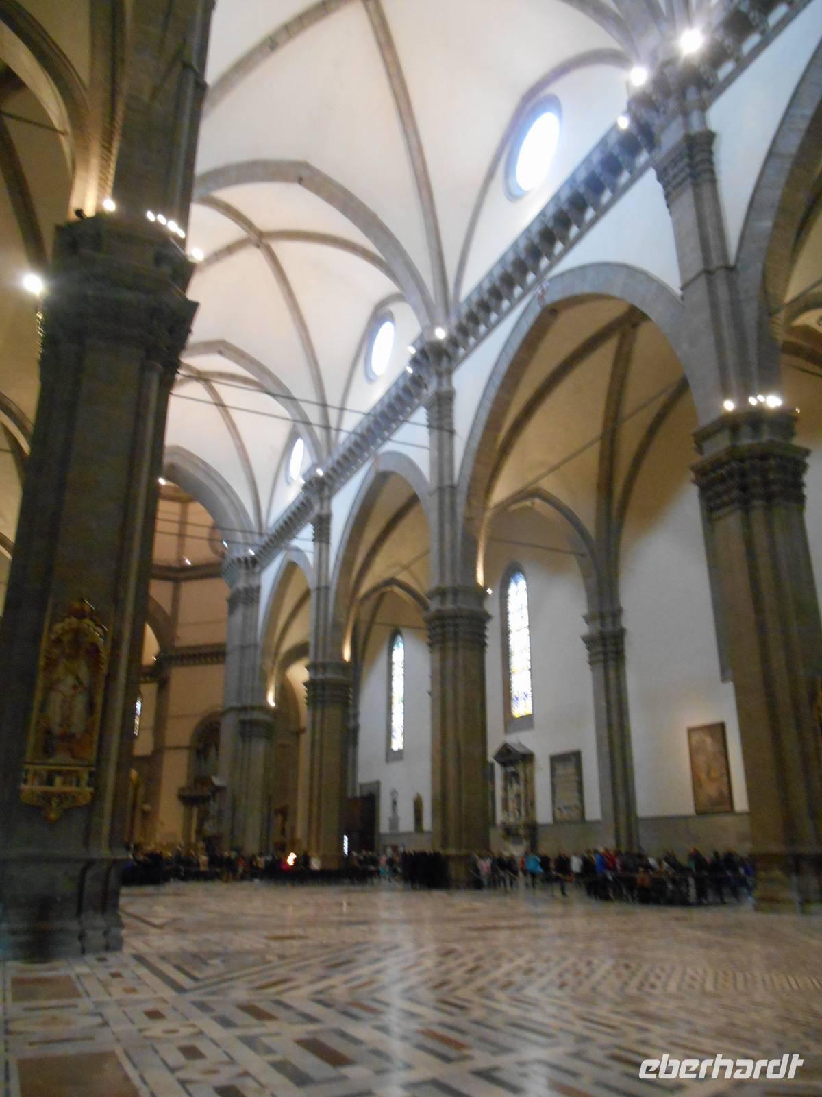 Kloster San Apollonia. Das erste Refektorium der Renaissance in Florenz ist jenes der Benediktinernonnen von „S. Apollonia", das um 1445, zur Zeit des größten Glanzes des Klosters, geschaffen wurde. Die hintere Wand des Refektoriums (9,75 x 9,10 m) war damals von Fresken bedeckt, doch die strenge Klausur der Nonnen bewirkte, daß man für lange Zeit nichts von diesen Werken wußte, so dass erst die Auflösung des Klosters im Jahre 1860 die Existenz lediglich des Freskos des „Ultima Cena" (Letztes Abendmahl) zu Tage brachte - der obere Bereich war übertüncht worden -, welches zuerst Paolo Uccello, dann aber seinem wahren Autor zugeordnet wurde, Andrea del Castagno (1421-1457), der daran nach seiner Rückkehr aus Venedig im Jahre 1444 arbeitete. Oberhalb davon wurden später weitere drei Fresken entdeckt: die „Resurrezione" (Auferstehung), die „Crocefissione" (Kreuzigung) und die „Seppellimento di Cristo" (Grablegung Christi), die bei der Restauration 1952 aus Gründen der Erhaltung abgelöst wurden, wodurch darunter aber die wundervollen Entwurfszeichnungen zum Vorschein kamen. Voller Eindrücke erreichten wir die zentrale Markthalle von Florenz. Das zweistöckige Gebäude wurde im Jahr 1874 eröffnet und obwohl das Design sehr modern für seine Zeit war, passt es dank der traditionellen Gestaltung der Steinfassade des Erdgeschosses und den Arkadenfenstern sehr gut zum Rest des Stadtbilds. Die obere Etage mit ihrem roten Eisenrahmen und grünen Fensterwerk wirkt etwas auffälliger. Die Fenster gleich unter dem hellen, wasserfarbenen Dach bringen ein natürliches Licht in die Mitte der Markthalle. Der Mercato Centrale befindet sich im Zentrum vom San Lorenzo Markt. Der große Freiluft-Markt befindet sich zwischen den Straßen und Plätzen rund um die Basilica di San Lorenzo. Hier verkaufen viele Händler ihre Produkte an die Passanten - meist Lederwaren, Kleidung und Souvenirs. Im Mercato Centrale findet man auch Lebensmittel. Die Läden im Erdgeschoss bieten Fisch, Fleisch, Käse und typisch toskanische Snacks wie „lampredotto" und „budelline", beides lokale Kuttel-Spezialitäten. Gemüse und Blumen werden auf der oberen Etage der Markthalle verkauft. Anschließend besichtigten wir die benachbarte Basilica di San Lorenzo, die ehemalige Pfarrkirche der Medici Familie. Mitglieder dieser reichen und mächtigen Familie wurden hier begraben. Die Kirche, die ursprünglich von Filippo Brunelleschi im 15. Jahrhundert entworfen wurde, ist ein frühes Beispiel der kirchlichen Architektur der Renaissance. Von hier aus flanierten wir weiter - die Besichtigung des Domes stand nunmehr auf unserem Programm! Der Dom von Santa Maria del Fiore wurde 1434 vollendet und ist die bedeutendste Sehenswürdigkeit von Florenz sowie die viertgrößte Kirche der Welt. Er ist auch weltbekannt für seine riesige Kuppel, eine technische Meisterleistung der Renaissance und ist von jedem Hügel und Aussichtspunkt aus sichtbar. Die riesige Kuppel des Doms mit einer Höhe von 114 m ragt meterhoch über die Häuserdächer hinaus. Der florentinische Dom wurde übrigens der Muttergottes geweiht, daher das „Santa Maria". Der Zusatz „del Fiore" bedeutet „der Blume" und bezieht sich auf das Stadtwappen, die Lilie, von Florenz. Die Mittagspause verbrachten wir in der Nähe des Domes und voller neuer Energie besuchten wir am Nachmittag die Orsanmichele, einen ursprünglichen Getreidemarkt. Heutzutage wird die untere Etage als Kirche benutzt, während die oberen Etagen ein kleines Museum beherbergen. Unser Spaziergang führte uns weiter über die Piazza della Signoria zur Kirche Santa Croce. Sie wurde im Jahr 1294 nach einem Entwurf des berühmten Architekten Arnolfo di Cambio gegründet und ist eine der großartigsten und ältesten Franziskanerkirchen der italienischen Gotik. Die Basilika wurde zum letzten Ruheort berühmter Persönlichkeiten erkoren und birgt die so genannten „Urne dei Forti" (die Gräber der Mächtigen), darunter auch das Grab des Michelangelo. Erst nach der Beisetzung des Dichters Ugo Foscolo im Jahr 1871 wurde Santa Croce erst richtig für die Beerdigung berühmter Persönlichkeiten gewählt. Doch in Wirklichkeit ruhen hier bereits seit Jahrhunderten die Gebeine von fast fünfzehntausend Vertretern aller Kunstrichtungen wie Gioacchino Rossini, Leon Battista Alberti, Vittorio Alfieri, Galileo Galilei, Machiavelli und Enrico Fermi. Hier endete auch unser heutiges Besichtigungsprogramm und jeder kehrte individuell zum Hotel zurück - mittlerweile kannten wir uns ja alle auch ziemlich gut in der Stadt aus.