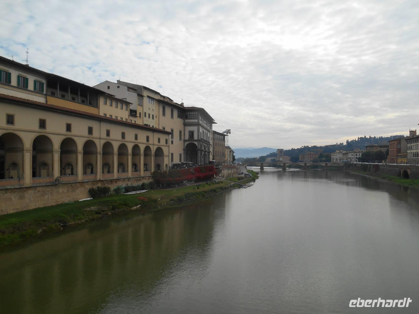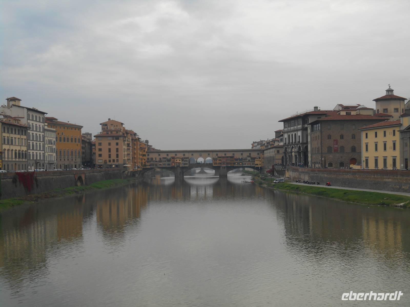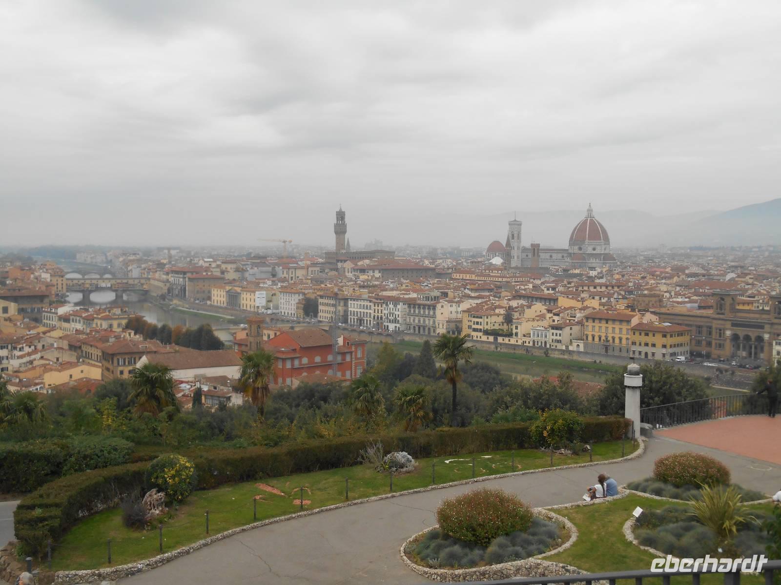 Ausgestattet mit Audio-Guides starteten wir zu Fuß gemeinsam mit Matthias, unserem Stadtführer. Innerhalb von nur 15 Gehminuten erreichten wir bereits den Domplatz und weiter über die Piazza della Repubblica die älteste Brücke von Florenz, die Ponte Vecchio. Es wird angenommen, dass eine Brücke hier schon während der Römerzeit existierte. Ihr heutiges Aussehen geht zurück auf das Jahr 1345, als sie gebaut wurde, um eine Brücke zu ersetzen, welche durch eine Flut zerstört wurde. Häuser wurden auf der Brücke gebaut, was eine gängige Praxis in großen europäischen Städten im Mittelalter war. Die Ponte Vecchio war die einzige Brücke in Florenz, welche den Zweiten Weltkrieg unbeschadet überstanden hat. Die Häuser auf der Brücke wurden zunächst als Werkstätten und von einer Vielfalt von Ladenbesitzern, wie zum Beispiel Metzgern genutzt und Gerber machten hier ihre Geschäfte. Im Jahr 1593 beschloß Herzog Ferdinand I. sie durch Goldschmiede zu ersetzen, angeblich, weil die Läden zu viel Müll produzierten und einen fauligen Gestank verursachten. Heute werden die Häuser als Läden verwendet, welche ein breites Sortiment an Schmuck verkaufen, angefangen von günstigem modernem Schmuck, hin zu teuren Antiquitäten. Anschließend ging es weiter zum Palazzo Pitti, welcher sich unterhalb des Boboli-Hügels erstreckt. Er wurde Mitte des 15. Jahrhunderts für den Bankier Luca Pitti nach Plänen von Brunelleschis gebaut und erfuhr später von den Medici eine Vergrößerung. In ihm residierte Cosimo de Medici und er beherbergte auch italienische Könige bzw. diente den Herrschern von Florenz als Wohnsitz. Wir wurden von Matthias durch das hiesige Silbermuseum geführt. Die Sammlungen des Museo degli Argenti bestehen aus dem Schatz der Medici und der Habsburg-Lothringer, darunter die berühmten Vasen Lorenzos des Prächtigen, Kameen Cosimos I., Bergkristalle von Franz I., Bernsteine Maria Magdalenas von Österreich, Elfenbeinarbeiten von Matthias de' Medici, Schmuck von Anna Maria Luisa, der letzten Repräsentantin des Hauses Medici, der Schatz Ferdinands III. (Sammlungen der Erzherzöge von Salzburg) und eine bedeutende Sammlung von Schmuckstücken, die von deutschen Goldschmieden Ende des 16. und im 17. Jahrhundert angefertigt wurden, sowie chinesisches und japanisches Porzellan. Sehr beeindruckend! Nach einer stärkenden Mittagspause ging unser Besichtigungsprogramm weiter... Hinterm Palazzo erstreckt sich am Hang der Boboli Garten, in ihm können wir bei angenehmen Temperaturen lustwandeln. Im Garten sind Brunnen, Grotten und herrliche Wasserspiele zu sehen. Von den schattigen Terrassen genießen wir die herrliche Aussicht auf die Stadt und die toskanische Landschaft. Zum Schluss bummeln wir noch durch den Bardini Garten und mit einigen Gästen zum Piazza Michelangelo, wo wir einen traumhaften Blick auf die gesamte Stadt genießen können.