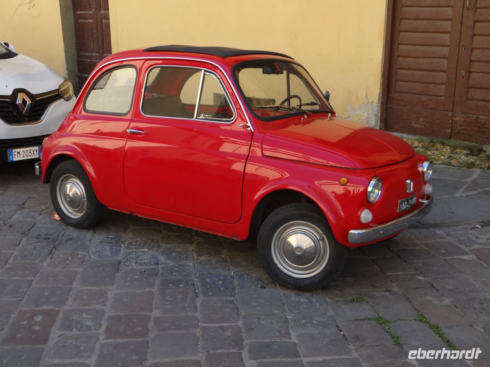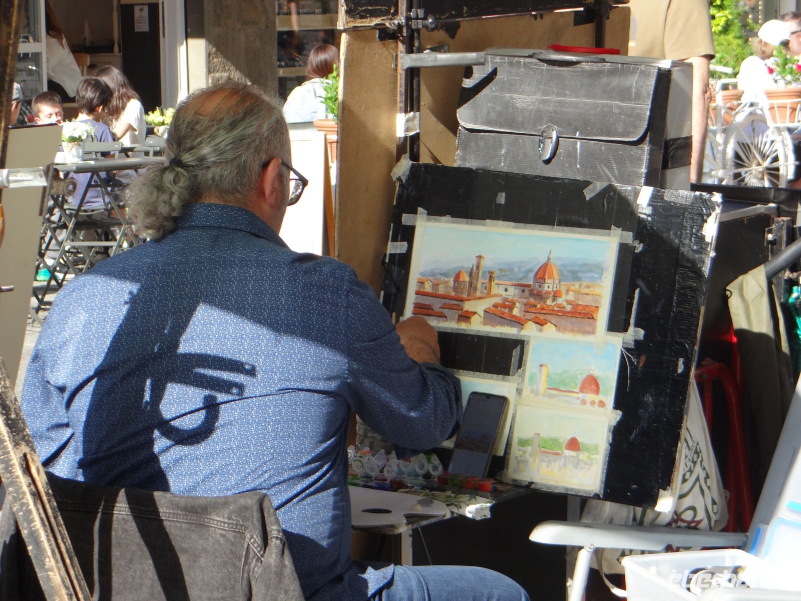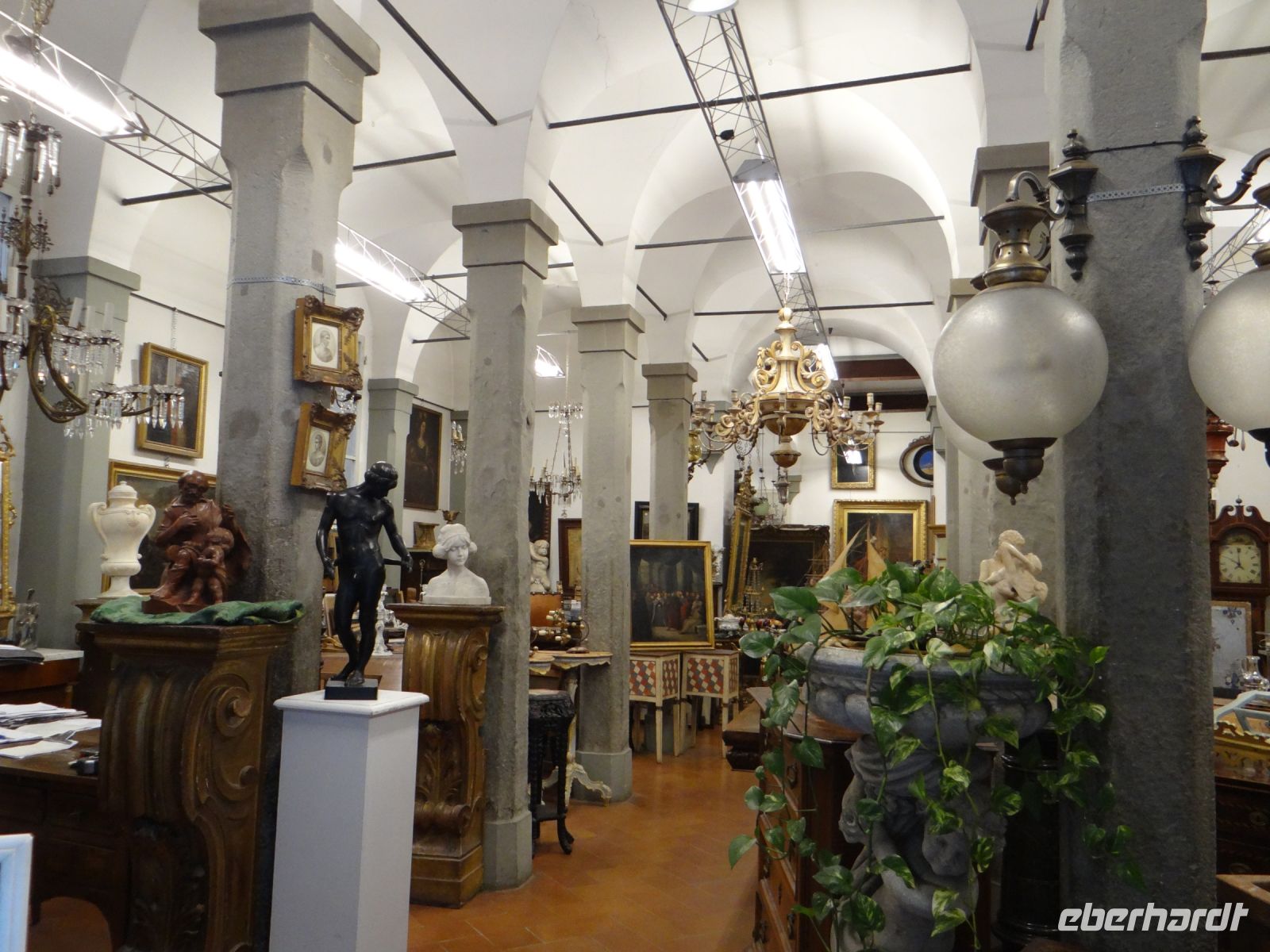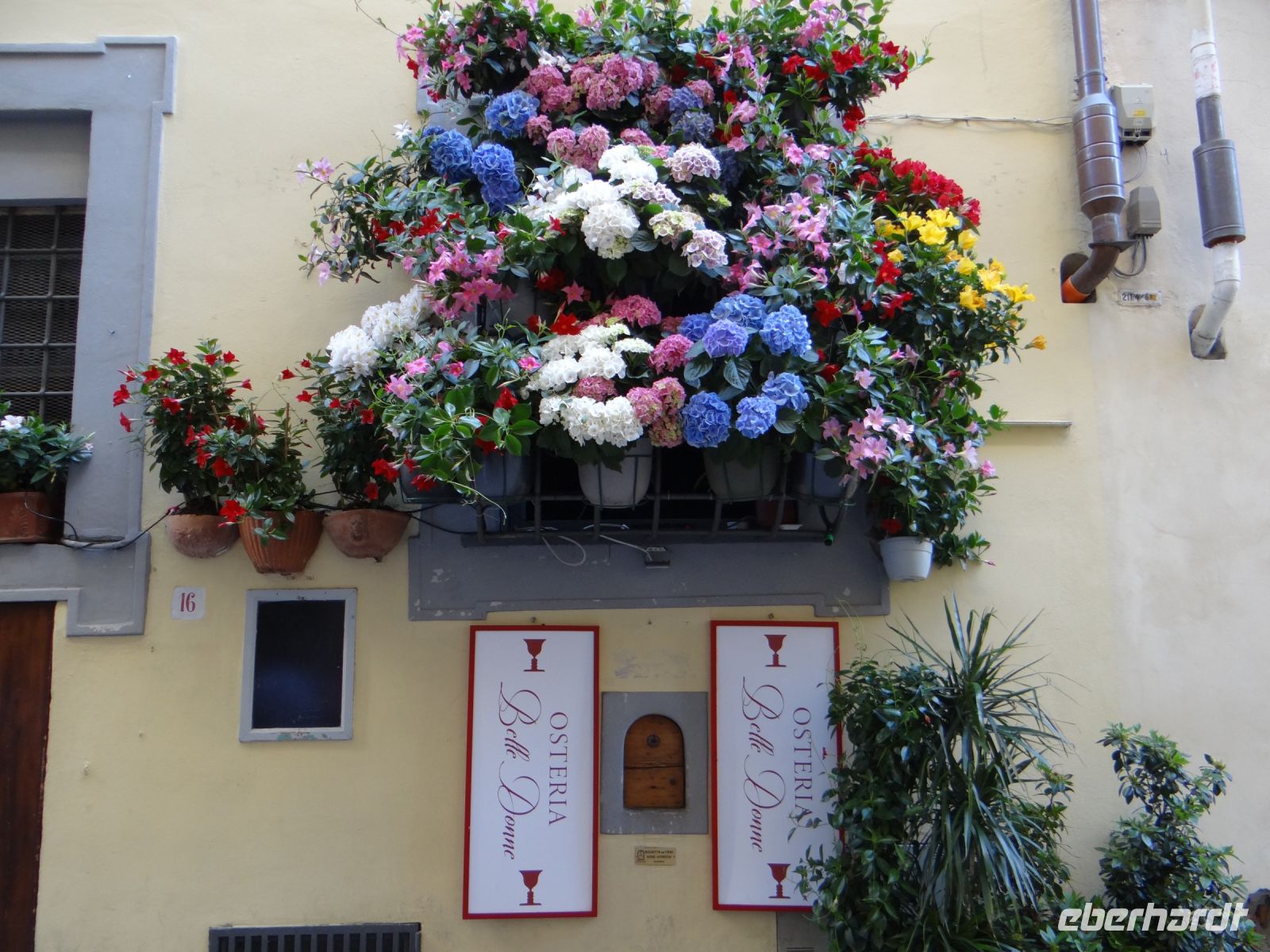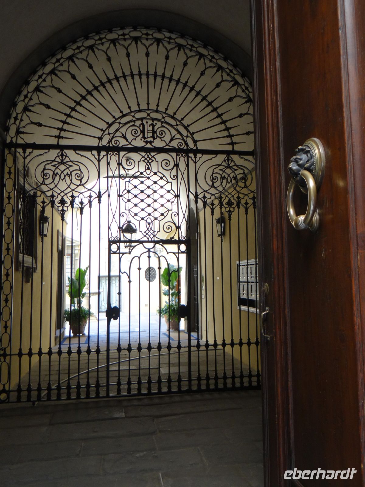 Wie ist die Stadt prächtig und alles lebt in den Straßen. Wir laufen zunächst zur Grabkapelle der Medici, die Michelangelo entworfen hat. Hier entscheiden sich schon die ersten, ihr Kulturprogramm zu beginnen und reihen sich in die kurze Schlange, die in die Kapelle führt. Der Rest läuft weiter zum Dom und zerstreut sind. Ich kümmere mich um unsere Straßenbahntickets für die nächsten Tage – 96 Tickets, die Verkäuferin freut es. Dann weiter zu einem Lokal für den Abend an der Piazza Santa Maria Novella. Auch das gelingt. Dann runter zum Arno. Eine schmale Gasse mit einer Autowerkstatt, die gerade für zwei Fiat 500 reicht – übereinander auf einer Hubbühne wohlgemerkt. Hier steht ein Tor offen, schnell hindurch in einen Hof mit Hortensien und üppigem Zitronenbusch. Da hängen doch tatsächlich mehrere große Zitronen. Eine reizende Frauenskulptur mit Tauben in der Hand schmückt die Hofseite. Weiter geht es, an Antiquitätenläden vorbei. Dort eine winzige Werkstatt, in der Holzrahmen mit Blütenschmuck in Handarbeit hergestellt werden, um dann vergoldet oder mit anderem Farbauftrag einem Bild den richtigen Rahmen zu geben.