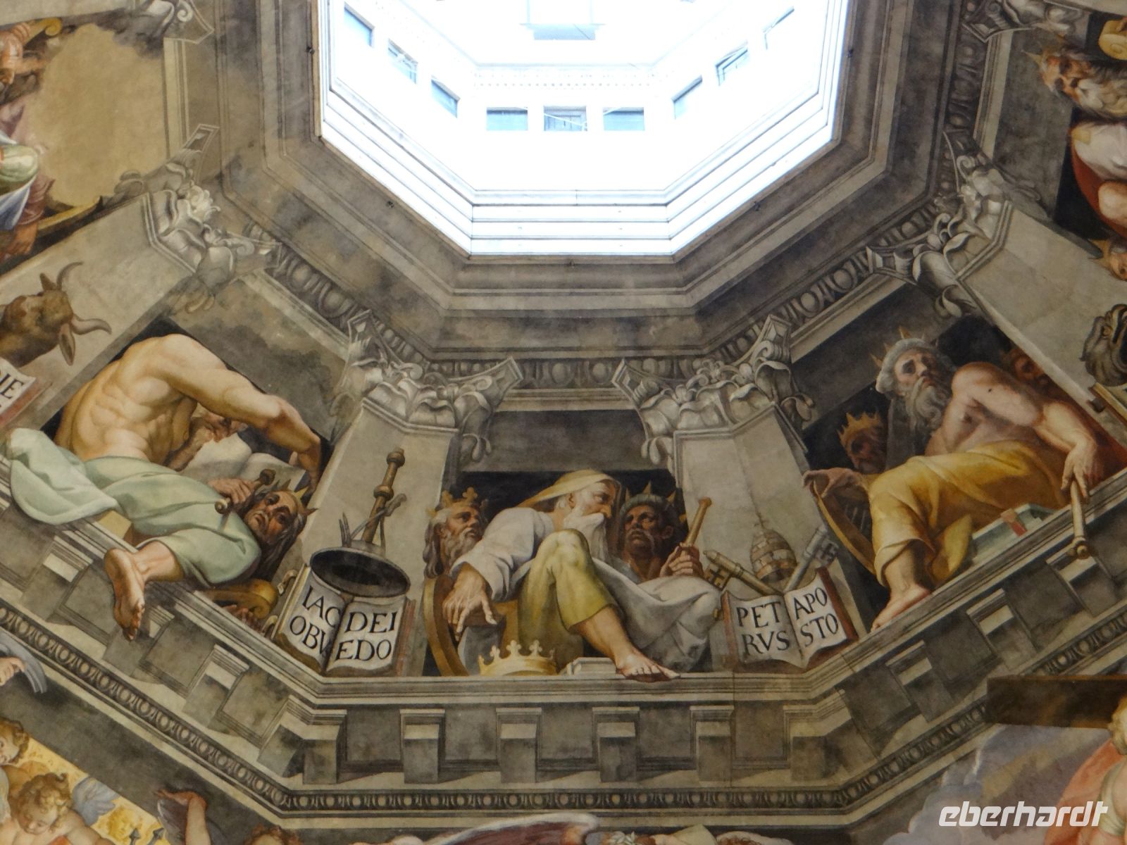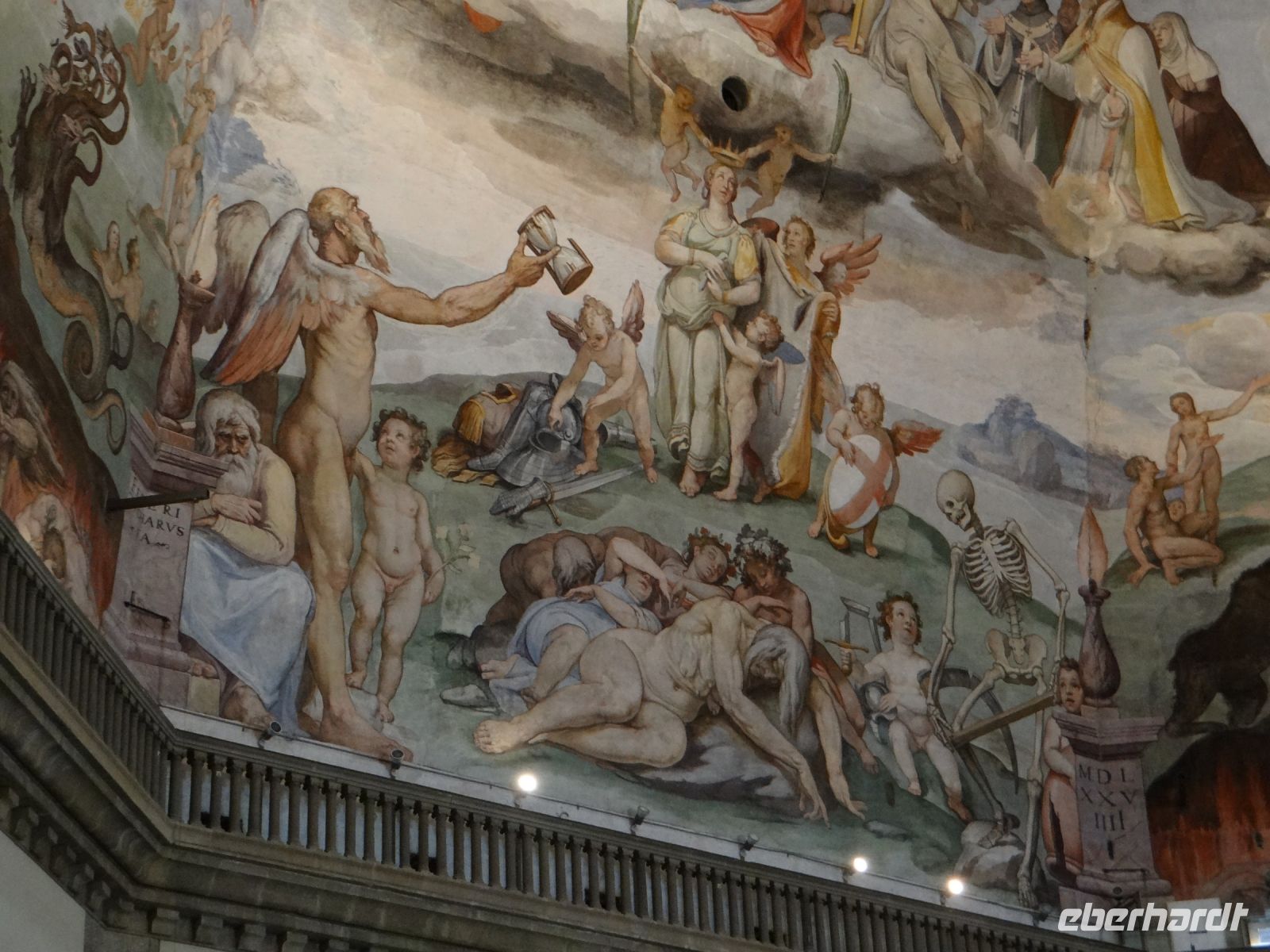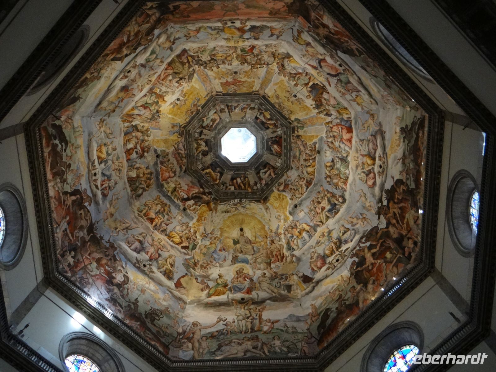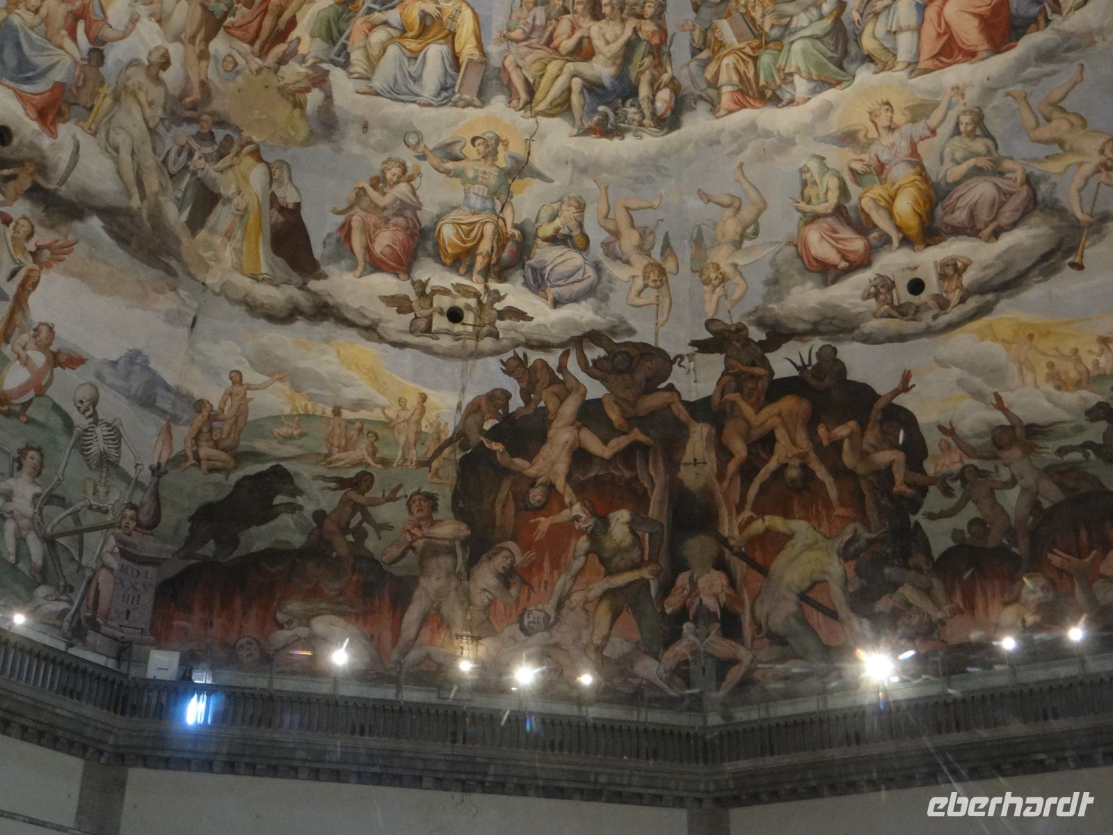 Die Sonne scheint, ein Wind geht und Florenz liegt uns zu Füßen. Einfach großartig. Nach einiger Zeit müssen wir wieder runter, die nächste Gruppe wartet auf ihren Aufstieg. Nun gelangen wir auf die Galerie, die unmittelbar unterhalb des Kuppelfreskos entlangläuft und nun stehen wir so gut wie mit einem Bein selbst in der Hölle, die dort dargestellt ist. Den vielen Akteuren in Himmel und Hölle so nahe zu sein, ist sehr beeindruckend.