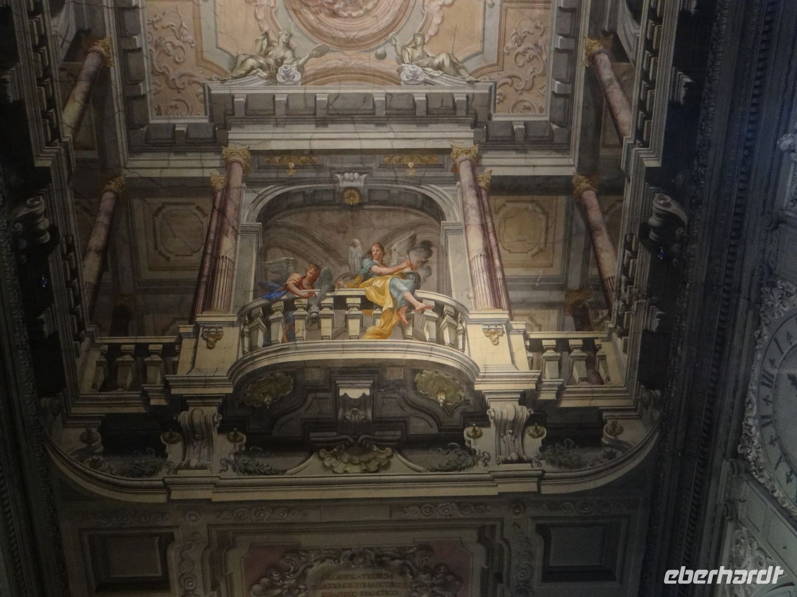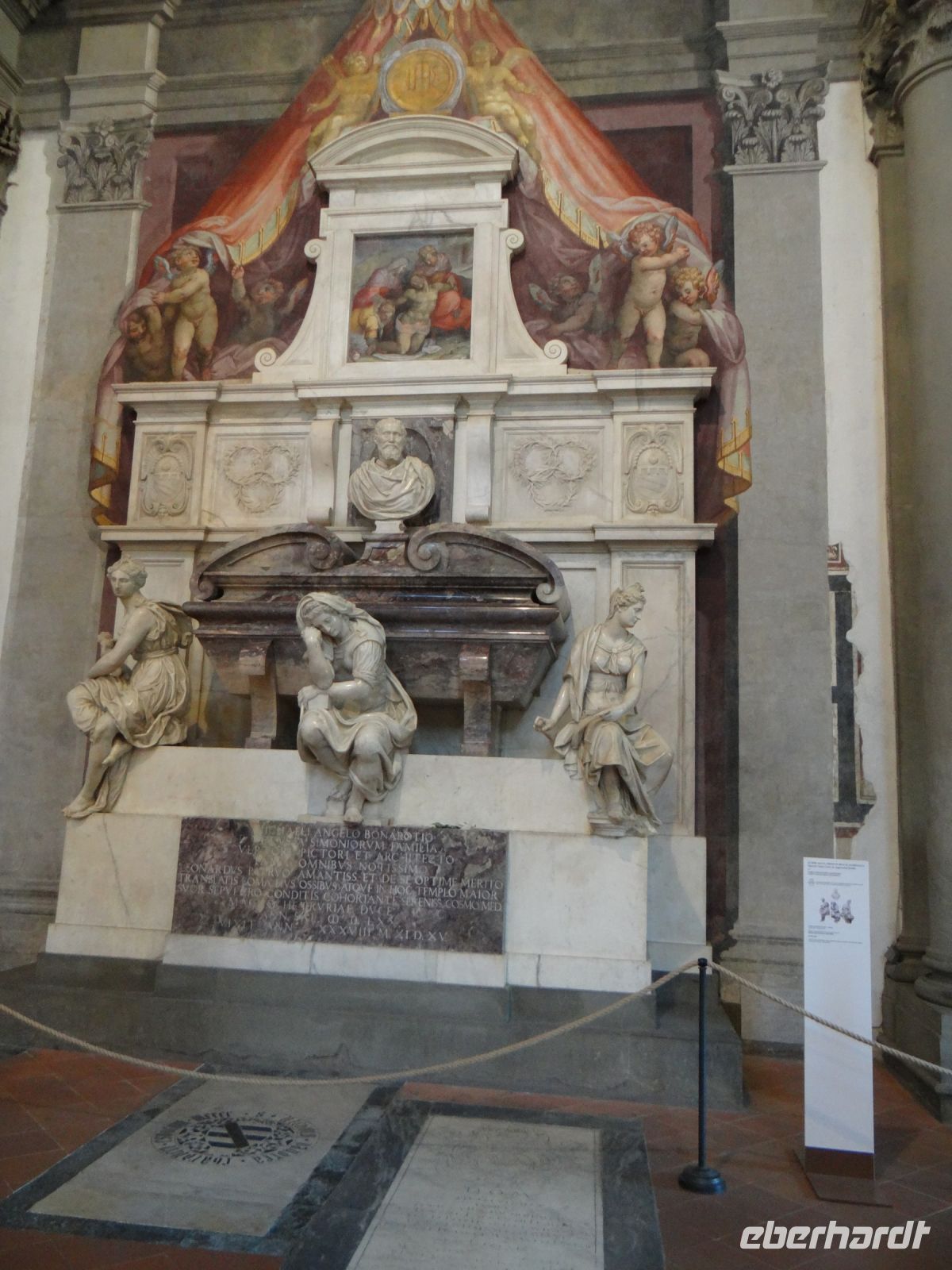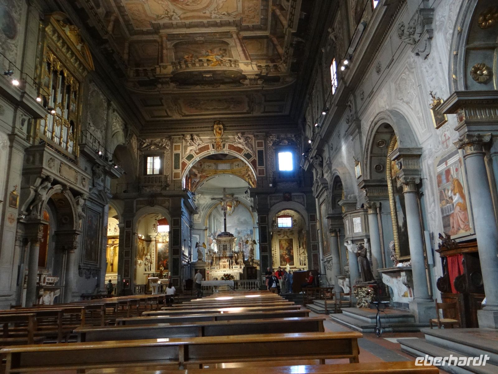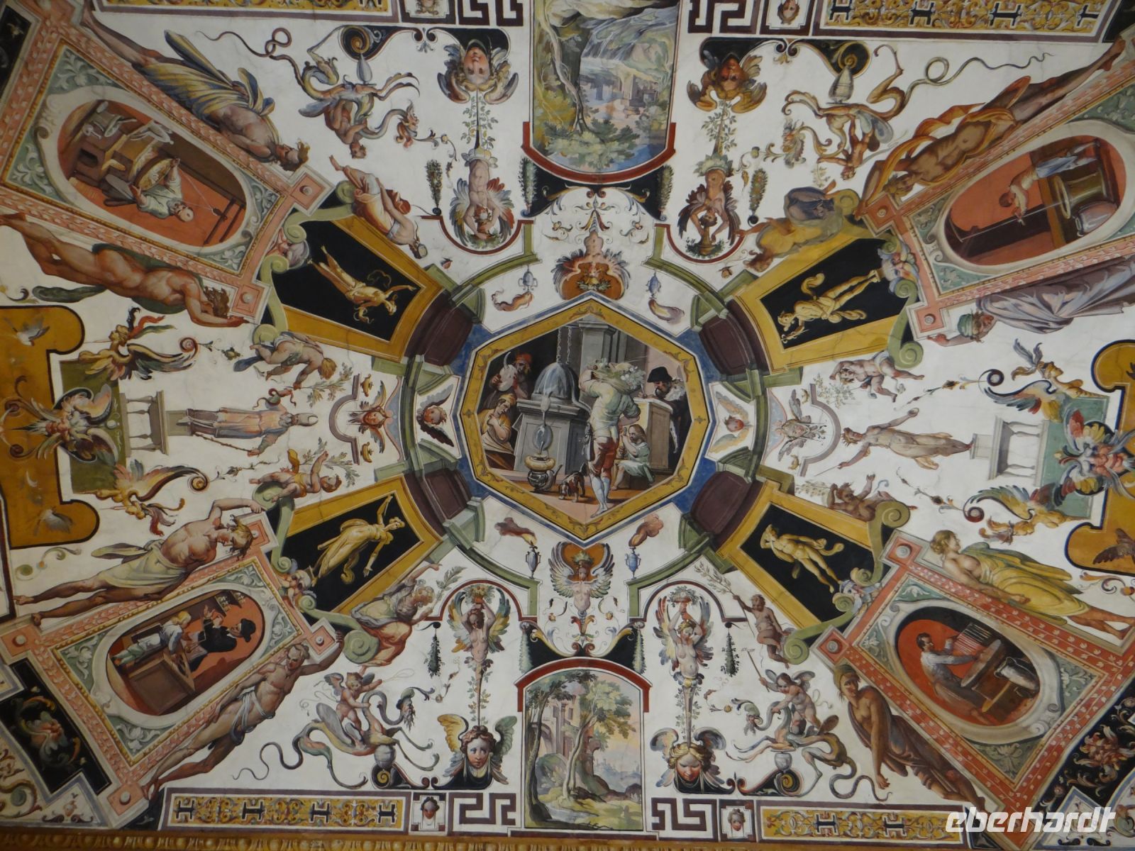 Die Sonne scheint, ein Wind geht und Florenz liegt uns zu Füßen. Einfach großartig. Nach einiger Zeit müssen wir wieder runter, die nächste Gruppe wartet auf ihren Aufstieg. Nun gelangen wir auf die Galerie, die unmittelbar unterhalb des Kuppelfreskos entlangläuft und nun stehen wir so gut wie mit einem Bein selbst in der Hölle, die dort dargestellt ist. Den vielen Akteuren in Himmel und Hölle so nahe zu sein, ist sehr beeindruckend.