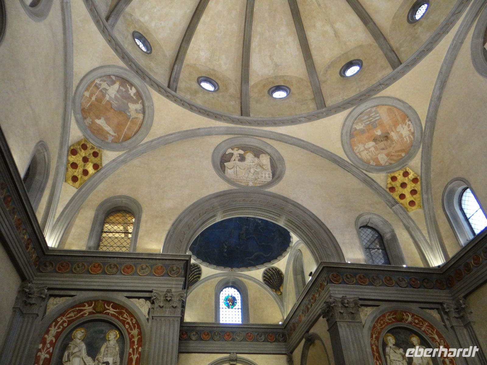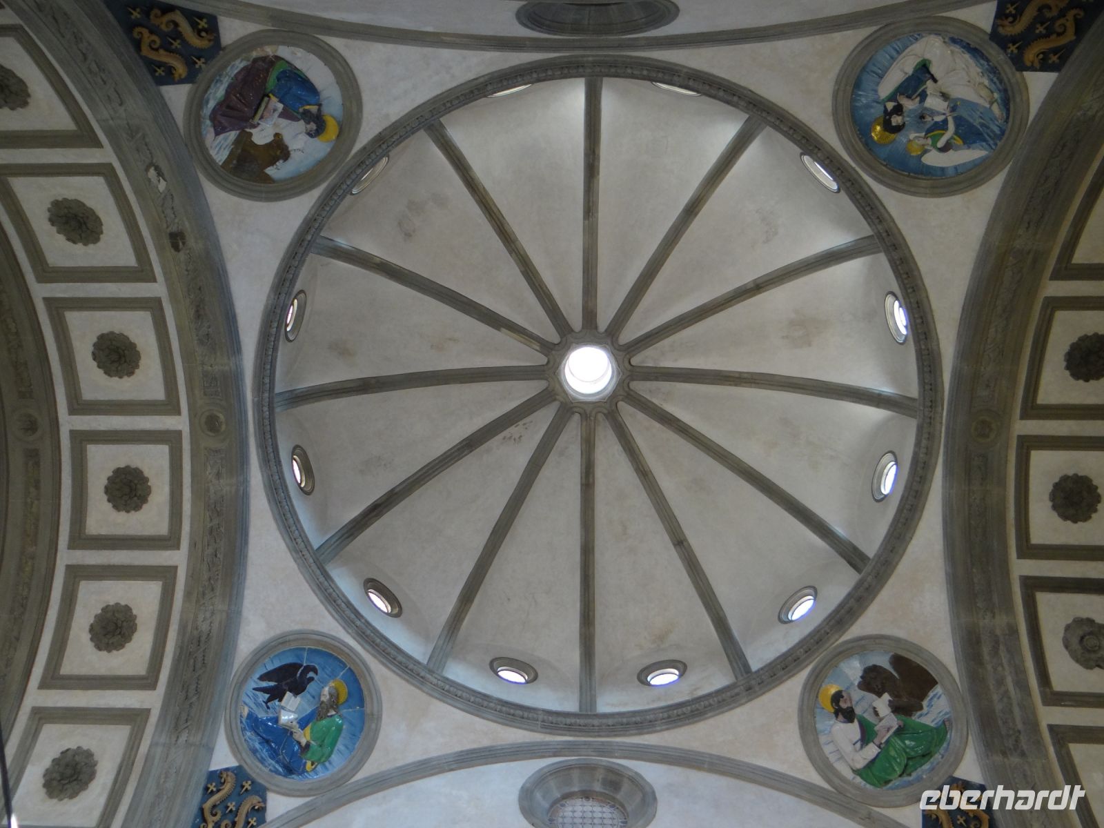 Nein, wir schonen uns nicht und wollen hoch hinaus. Flügel sind uns heute keine gewachsen und so laufen wir auf die Kuppel des Doms. Im Museum hat uns Angela anhand von Modellen erklärt, was das Besondere von ihr ist. Lange war die Apsis nicht geschlossen bis der talentierte Baumeister Brunelleschi auftrat. Wir laufen in Etappen nach oben: erst bis zur ersten Galerie unterhalb des mächtigen Kuppelfreskos hoch, innen entlang und dann der Kuppelbiegung folgend nach oben.