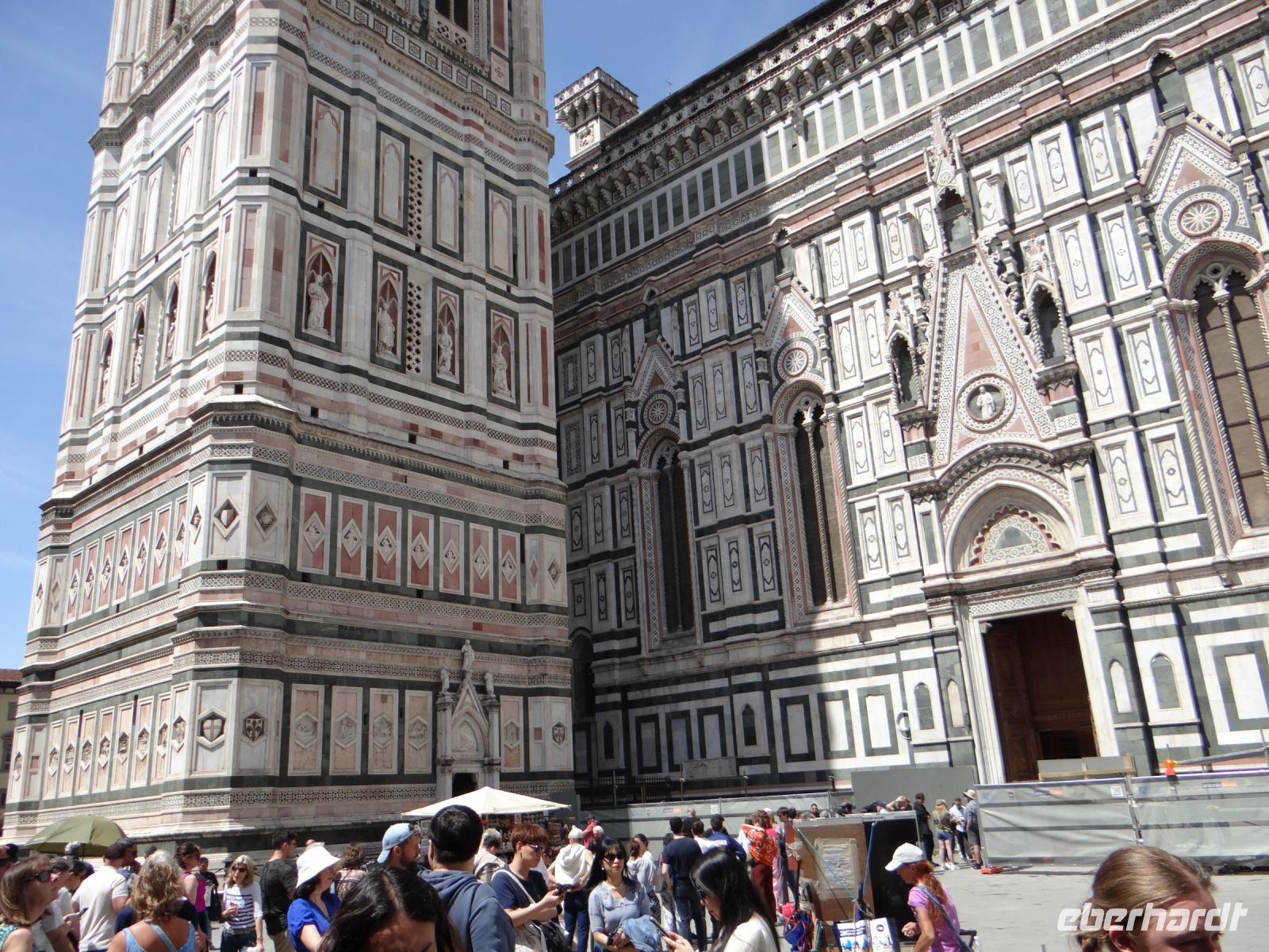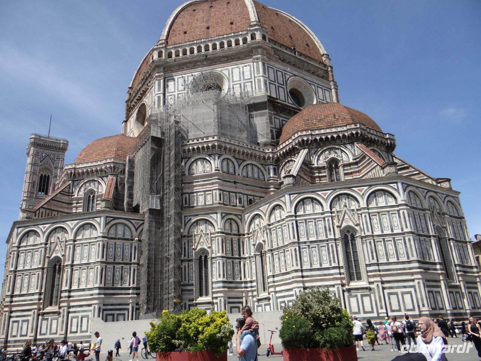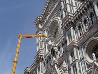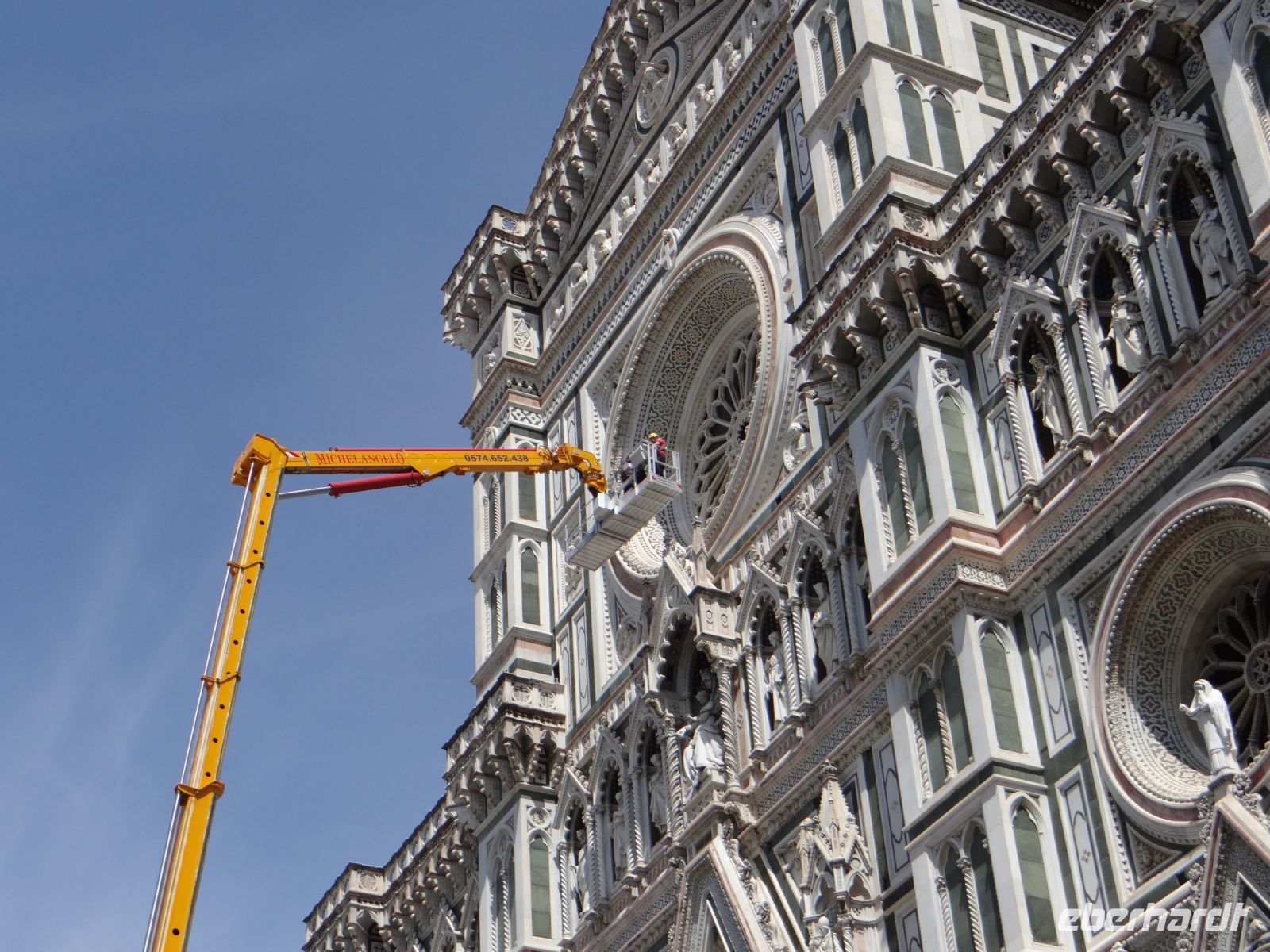 Der Dom sieht aus wie eine übergroße Hochzeitstorte – weiße Marmorverkleidung mit farbigen Einlegearbeiten, Vorsprüngen, Säulen. Das Auge hat viel zu gucken. Und die Pflege des Baus geht nie zu Ende. Vor der Fassade steht ein Kran mit Hebetribüne. Passenderweise heißt die Firma „Michelangelo“, der Namenszug steht am Kranarm.