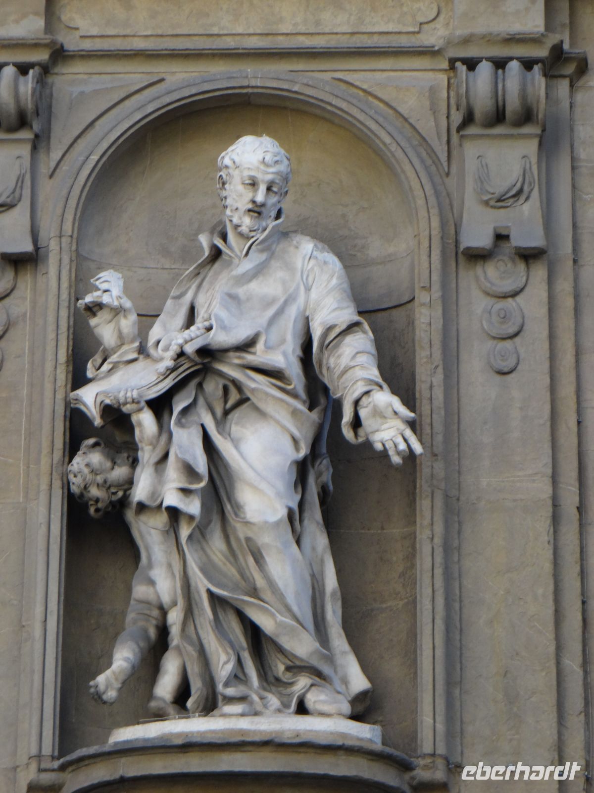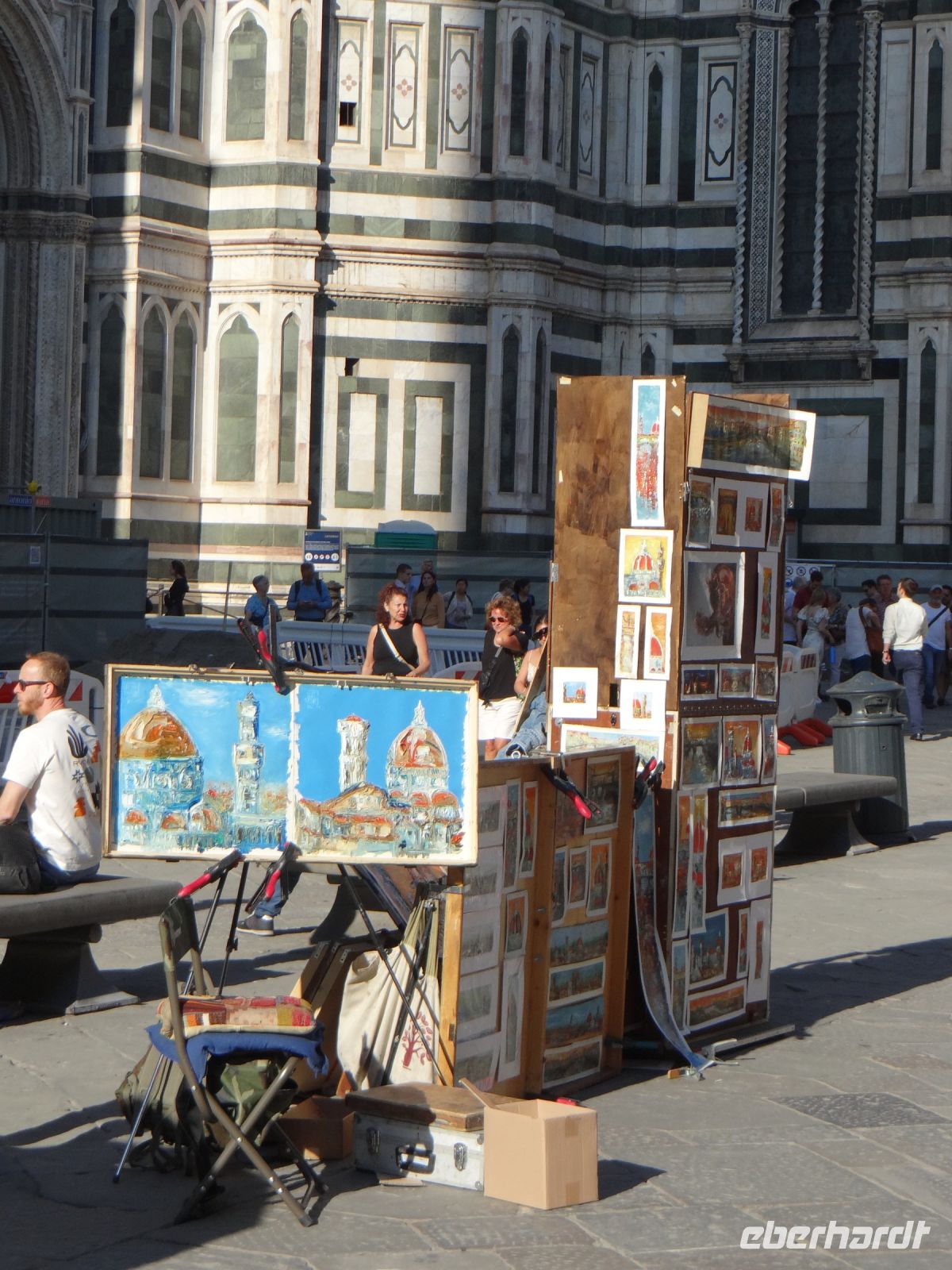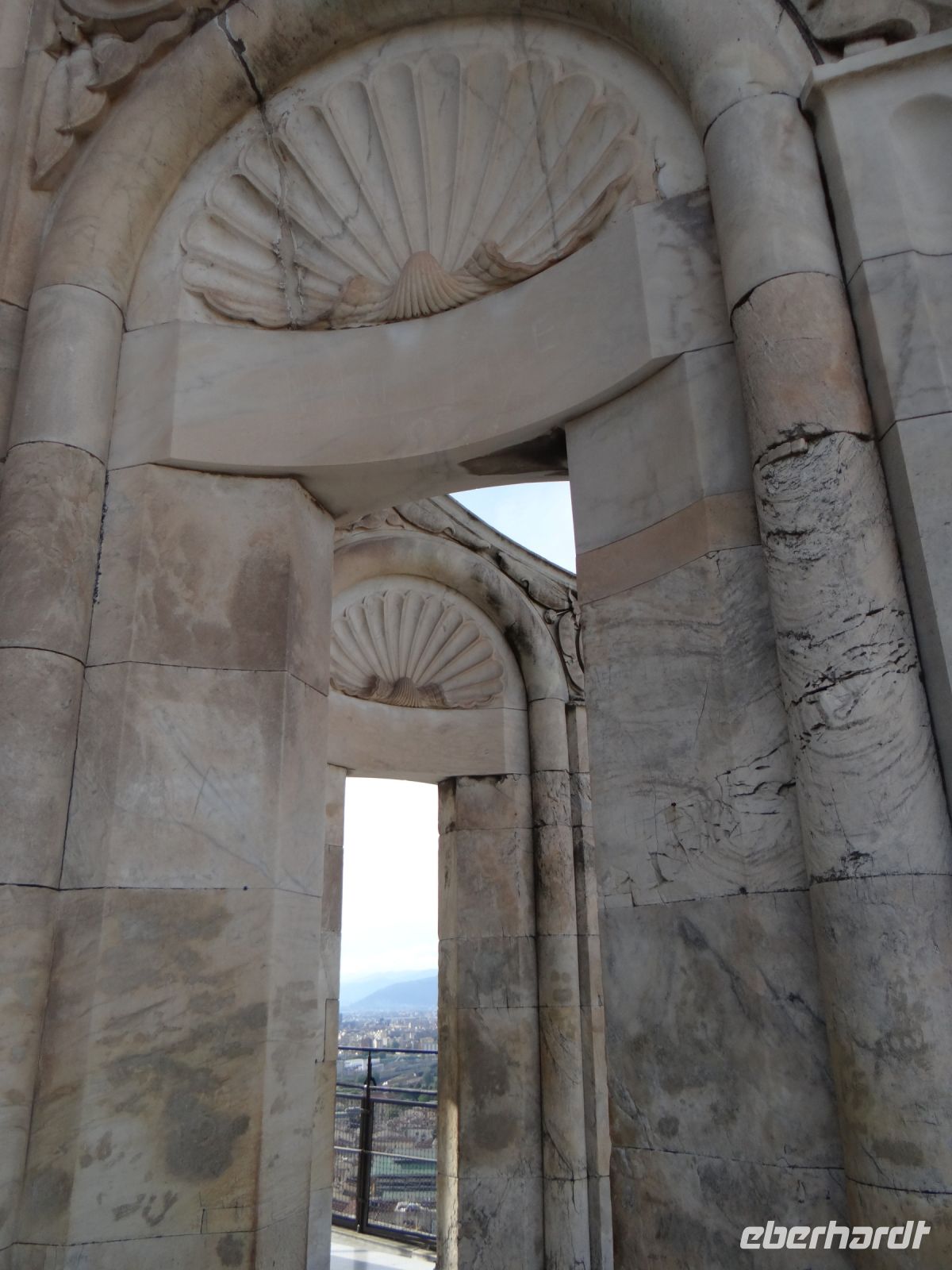 Der Dom sieht aus wie eine übergroße Hochzeitstorte – weiße Marmorverkleidung mit farbigen Einlegearbeiten, Vorsprüngen, Säulen. Das Auge hat viel zu gucken. Und die Pflege des Baus geht nie zu Ende. Vor der Fassade steht ein Kran mit Hebetribüne. Passenderweise heißt die Firma „Michelangelo“, der Namenszug steht am Kranarm.