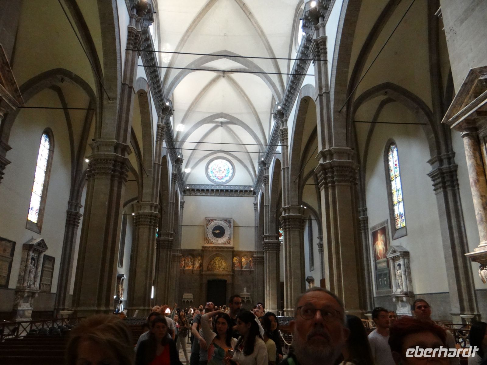 Dann brauchen wir erst einmal eine Pause. Danach besichtigen wir den Dom von innen mit den zwei legendären Reiterdarstellungen, dem Bild mit Dante. Und wir gehen auch einen Stock tiefer, wo die Grundmauern des Vorgängerbau des Doms zu sehen sind. Die neu gebaute Taufkirche war größer als die Kirche, so dass die Entscheidung fiel, eine in den Proportionen zum Baptisterium passende neue Kirche zu bauen. Das ist gelungen.