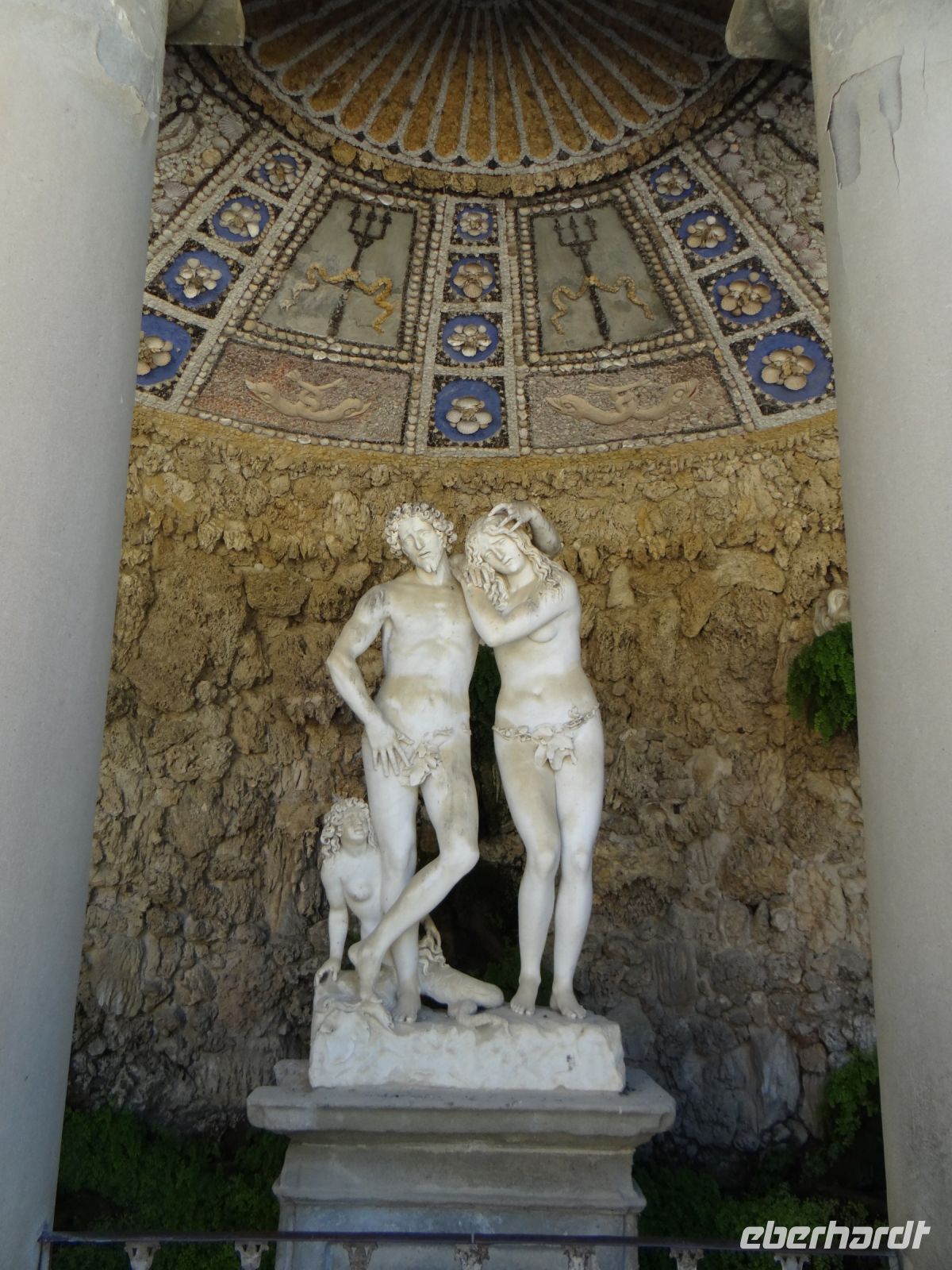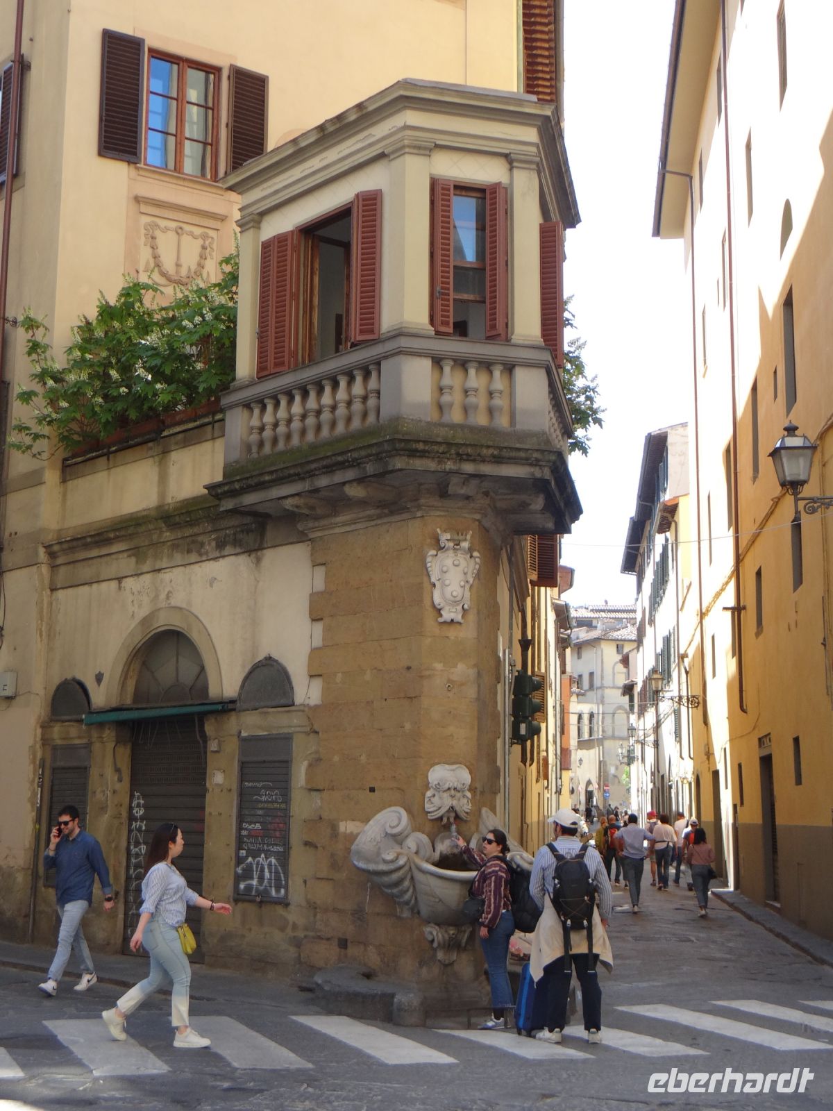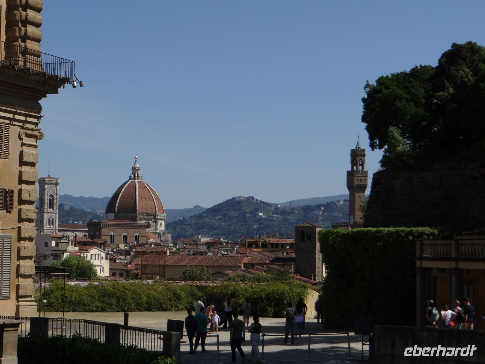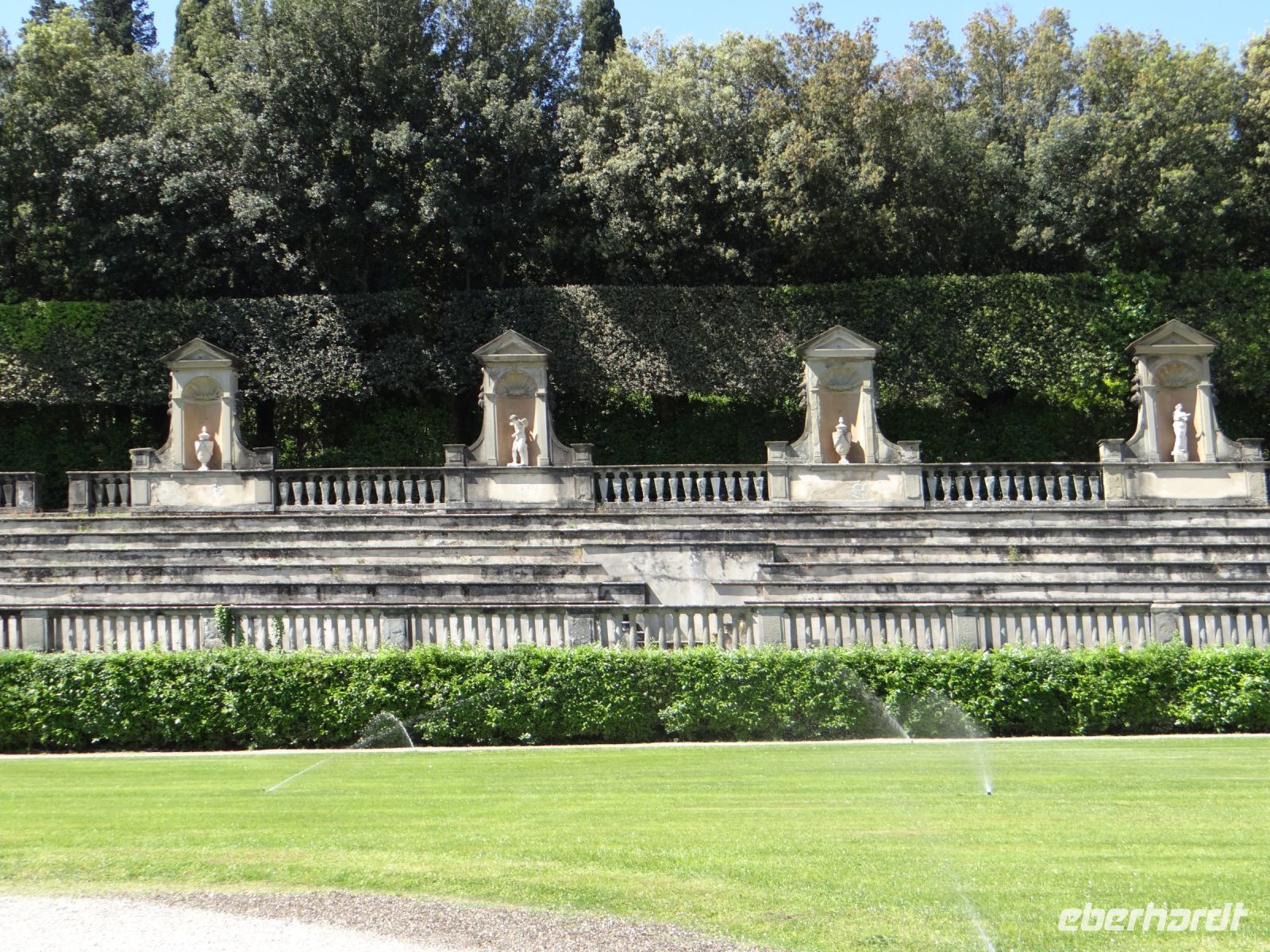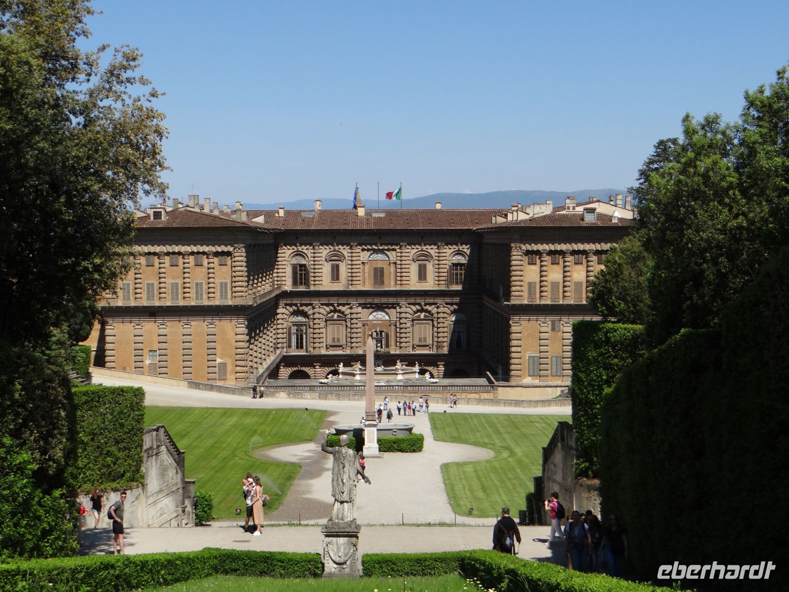 Angela führt uns kreuz und quer durch das Gassengewirr weiter über die Ponte Vecchio. Hier reiht sich Schmuckladen an Schmuckladen. Hinauf zum Palazzo Pitti, die Straße gesäumt von attraktiven Einzelhandelsläden. Der Palazzo ist ein Koloss, eine Fassade in einer Proportion, die die Frage aufkommen lässt, ob hier Giganten gewohnt haben. Man liebte es halt ein bisschen größer. Den dahinterliegenden Boboli-Garten aus der Renaissancezeit durchmessen wir unter einem strahlend blauen Himmel. Hier wurden grüne Räume angelegt, Zimmer, umgeben von schmalen, hochgewachsenen Lorbeerbäumen und anderen immergrünen Pflanzen. Skulpturen der Antike schmücken die Wege.