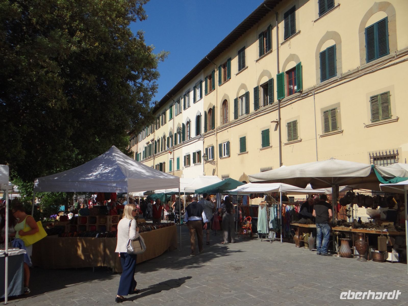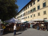 Über die Ponte Vecchio geht es zum Palazzo Pitti. Hier biegen wir rechts ein zur Chiesa di S. Spirito. Vor der Kirche liegt ein hübscher Platz, von Bäumen bestanden, in der Mitte ein Brunnen, den man heute nicht sieht, da Flohmarkt ist und alle schon ihre Stände aufgebaut haben. Wir verstreuen uns zwischen den Ständen, nehmen dies und das in den Blick, trinken noch einen letzten Café in der Bar und fahren dann ins Hotel zurück. Hier holt uns der Bus gegen Mittag ab und wir fahren die erste Etappe Richtung Heimat.