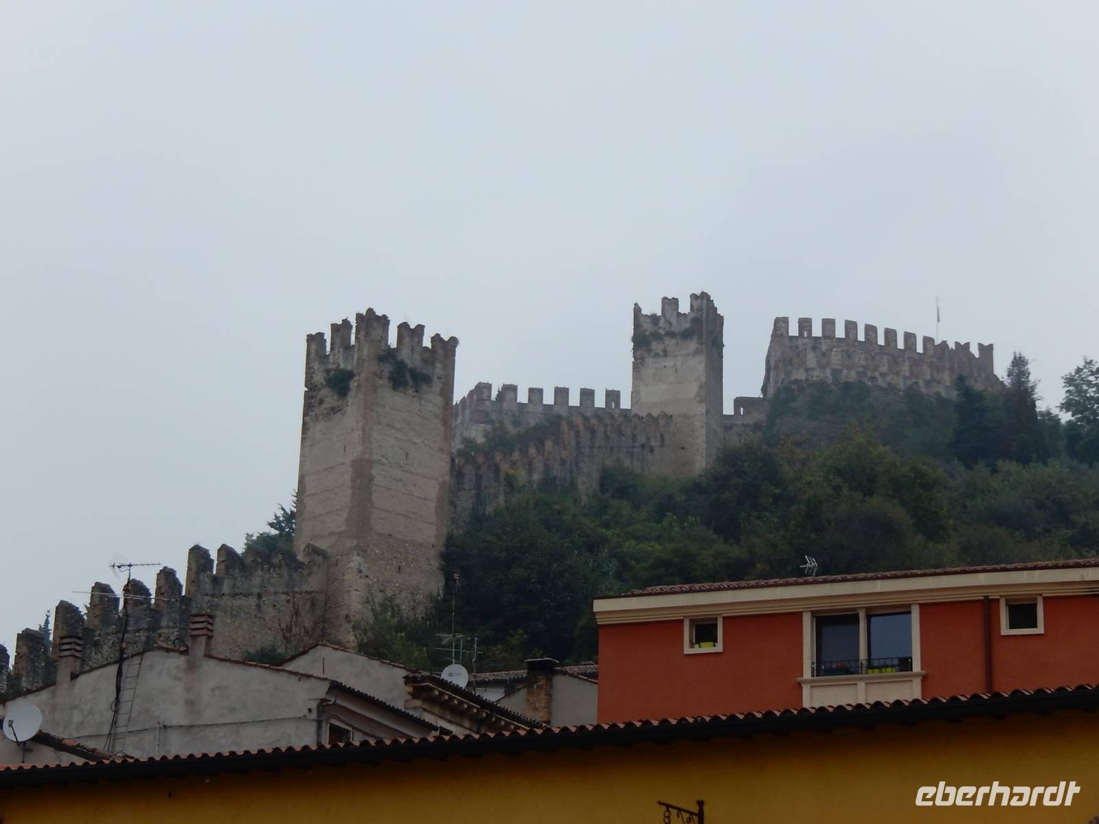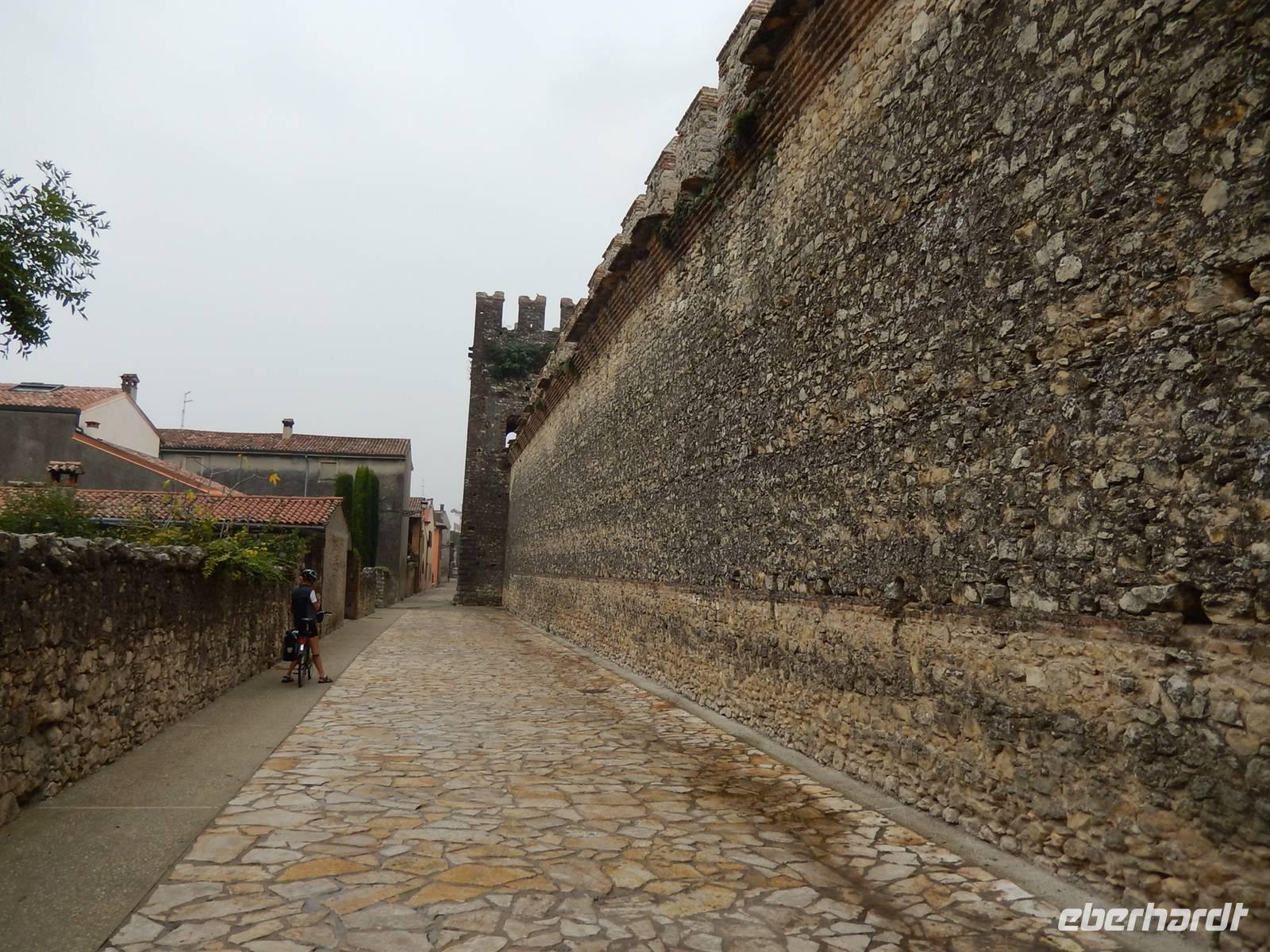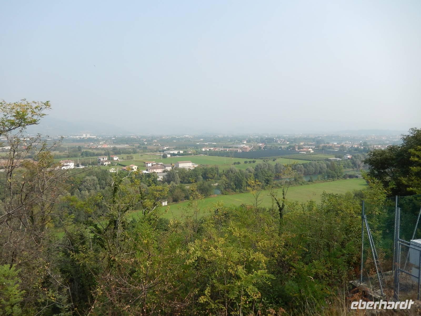 Heute steht die "Königsetappe" auf dem Plan. Wir starten direkt ab Hotel mit den Rädern. Leider meint es der Wettergott nach den letzten sehr sonnigen Tagen nicht so gut. Schon bei der Abfahrt nieselt es leicht und der Regen verstärkt sich über den Vormittag immer weiter. Aber wir lassen uns davon nicht entmutigen und testen ausgiebig unsere Regenbekleidung. Kurz vor dem Erreichen von Soave hört der Regen auf, so dass wir einigermaßen trocken in dem kleinen Ort ankommen. Raimond, unser Radguide, hat für uns eine kleine Führung in einer Weinkelterei organisiert. Denn schließlich ist Soave die Heimat des gleichnamigen Weins. Bei einem Schoppen des herrlichen Rebensaftes fachsimpeln wir über den "Classico". Und nun haben wir Appetit! Wir kehren in ein kleines Bistro ein und laben uns an Bigoli mit herrlichen Soßen! So gestärkt, verlassen wir den hübschen kleinen Ort und radeln weiter Richtung Vicenza. Leider fängt es erneut an zu regnen und so sehen wir von der landschaftlichen Schönheit, die uns umgeben soll, relativ wenig. Erst als der Niederschlag nachlässt und wir tapfer einige Höhenmeter bergauf gestrampelt sind, werden wir mit einem eindrucksvollem Blick in das unter uns liegende Tal belohnt. Vom Monte Berico haben wir einen umfassenden Blick auf Vicenza. Wir fahren mit den Rädern direkt bis zum Hotel. Ist zwar etwas wuselig durch die Straßen aber wir sind da als Gruppe schon ziemlich versiert. Nach der langen Tour freuen wir uns auf eine Dusche und das Menü zu unserem Abendessen kann sich wirklich sehen lassen.