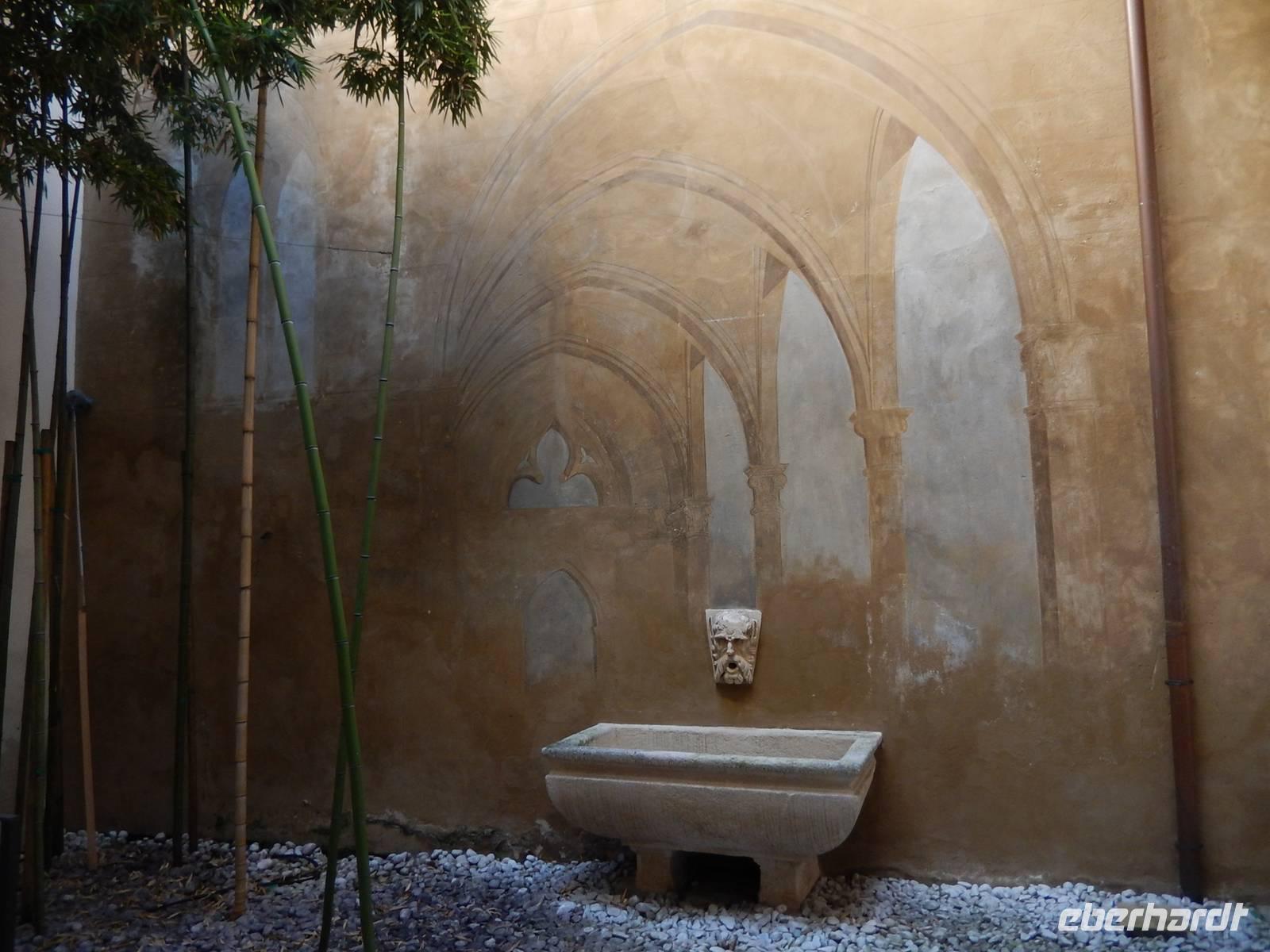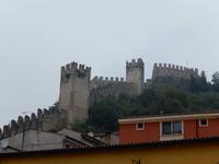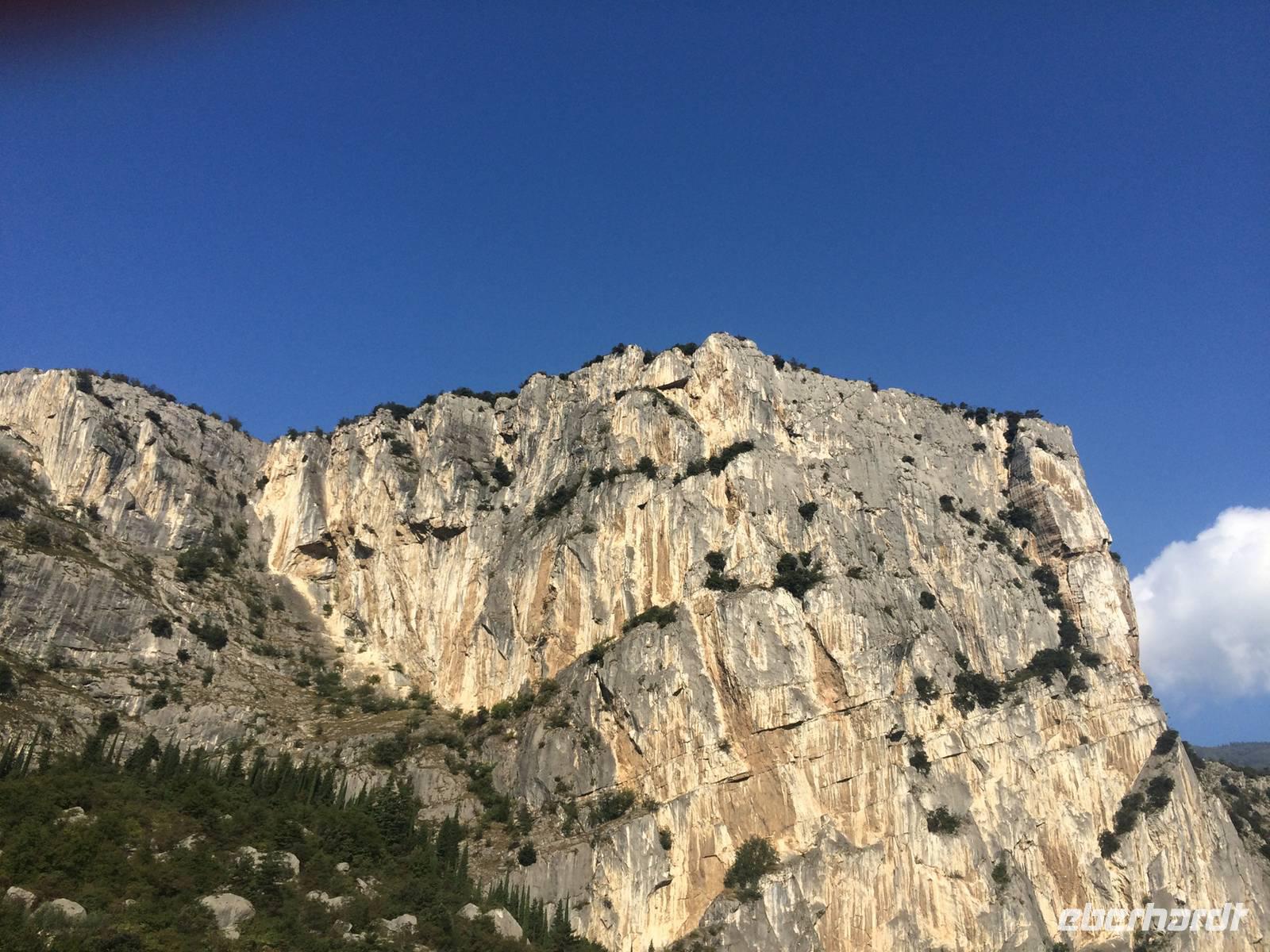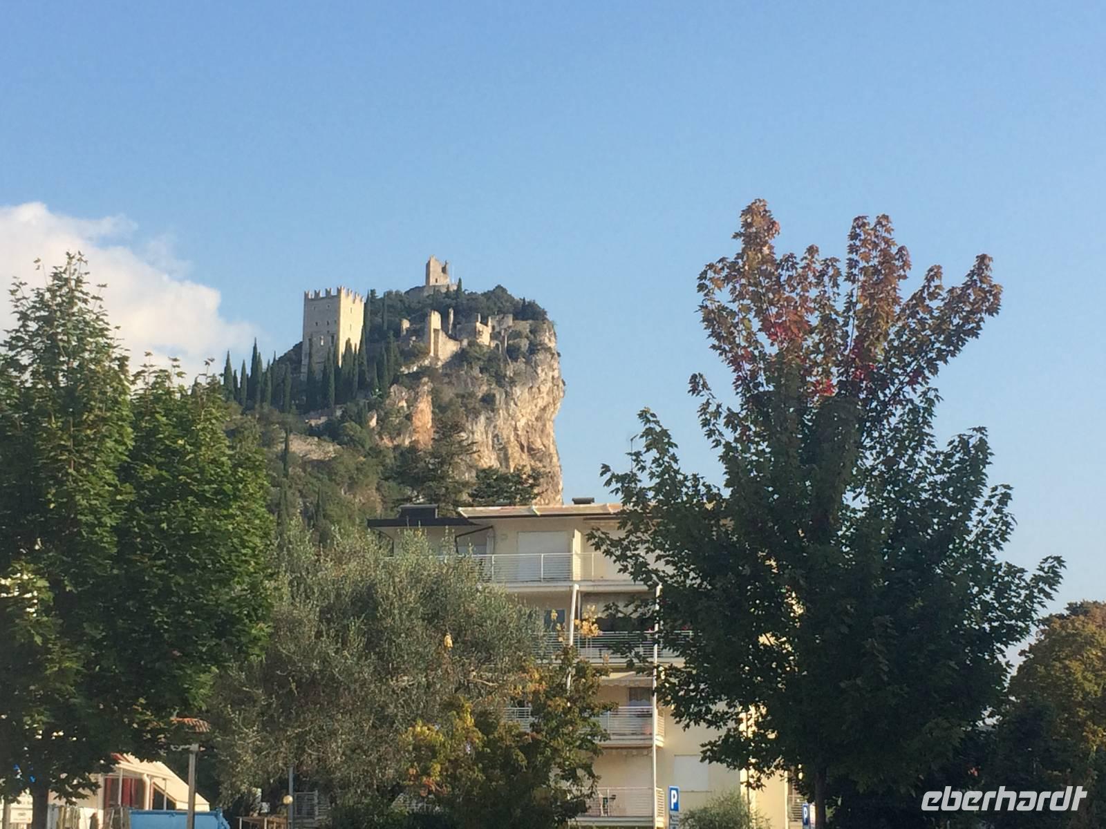 Nach unserem gehaltvollen Frühstück laden wir in froher Erwartung unsere Räder aus und bereiten uns auf unsere erste Tour vor. Diese führt uns von Riva aus gen Norden entlang des Flüsschen Sarca. Schroff aufragende Felswände links und rechts des Tales begleiten uns. Ein Paradies für Kletterer! Auf dem gut ausgebauten Radweg kommen wir zügig voran. Zwischendurch schlendern wir kurz durch Arco, sehen später die Burg Dreja hoch oben und erreichen schließlich nach dem alten Wasserwerk Fies ein altes Kastell aus dem 12. Jahrhundert.