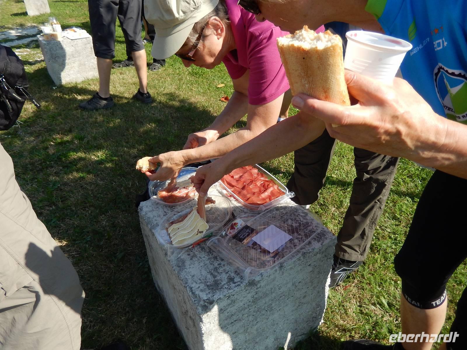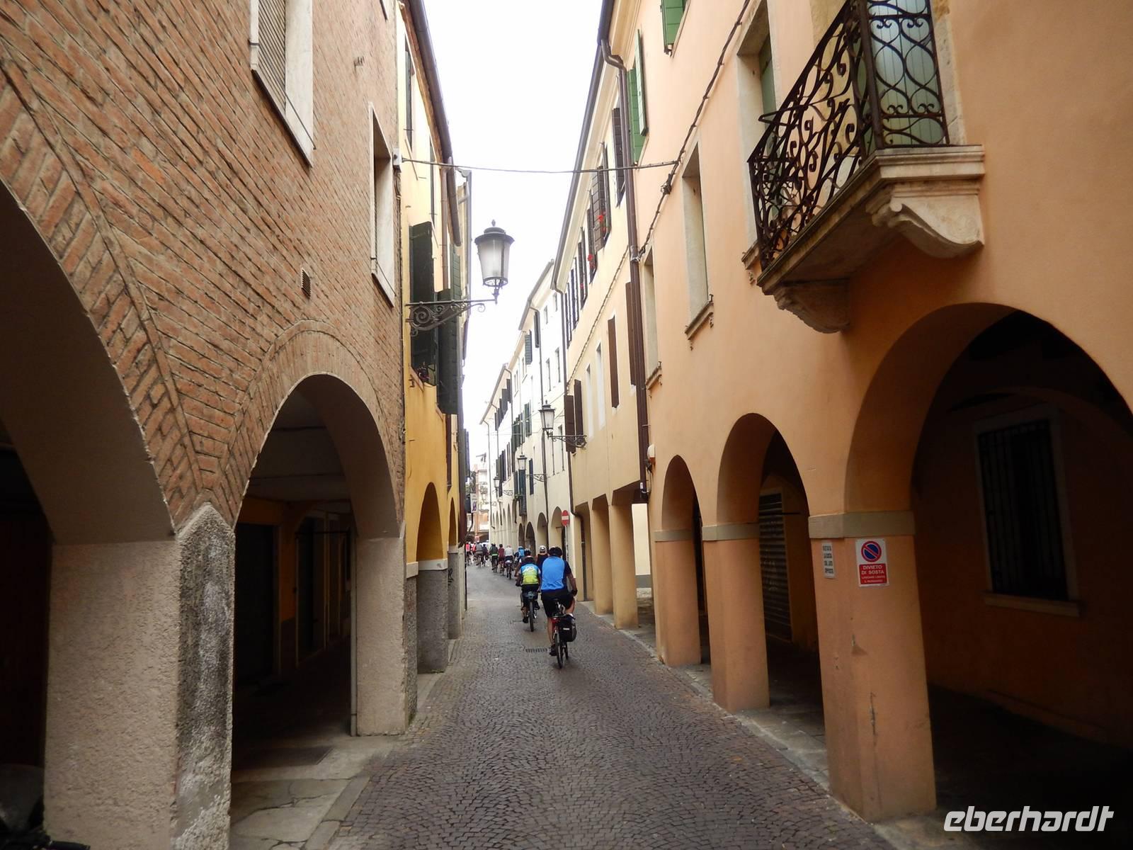 Heute machen wir uns auf den Weg nach Venedig. Wir starten wieder ab Hotel mit den Fahrrädern. Zunächst kommen wir nach Padua. Dort legt Raimond mit uns einen Stopp an der wunderschönen Basilika Santa Giustuina ein. Wir besichtigen dieses monumentale Bauwerk und das macht Lust auf mehr. So fahren wir noch weiter in das Stadtzentrum und nehmen uns ein wenig Freizeit rings um die Basilika des Heiligen Antonius. Zeit durch die Gassen zu schlendern und einen Cappucino zu trinken. Ein toller und unerwarteter Aufenthalt in de alterwürdigen Stadt. Gern wären wir noch länger geblieben! Wieder außerhalb der Stadt radeln wir entlang eines kleinen Flusses weiter Richtung Venedig. Wir kommen durch kleine Ortschaften und erhalten mit der einen oder anderen venzianische Villa einen Vorgschmack auf unser Reiseziel. Als uns gegen Mittag langsam der Magen knurrt, gibt es diesmal keinen Besuch einer Pastaria. Vielmehr überraschen uns Ingo und Jens mit einem Picknick. So sitzen wir bei herrlichem Sonnenschein am Fluss, lassen uns Schinken, Käse, Baguette, Oliven und Tomaten schmecken und trinken dazu leckeren "Traubensaft" und Kaffee. Einfach herrlich!