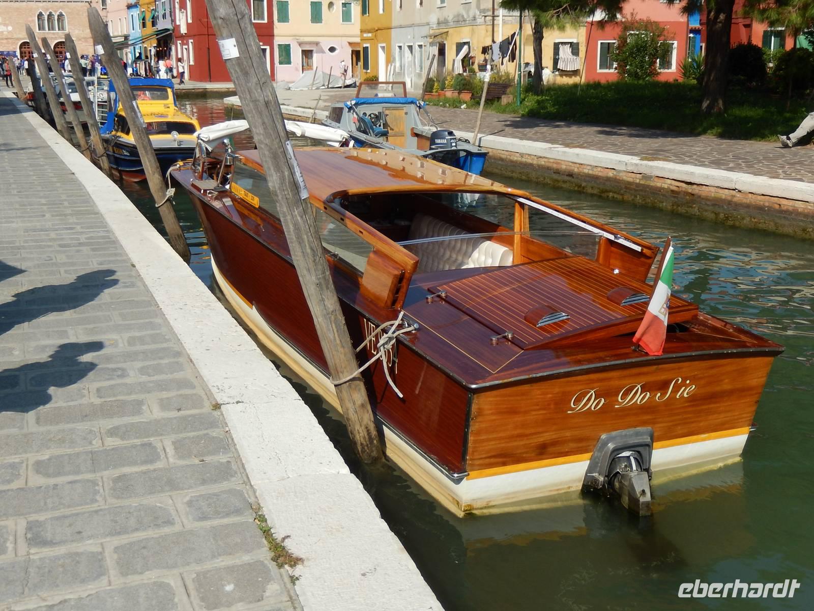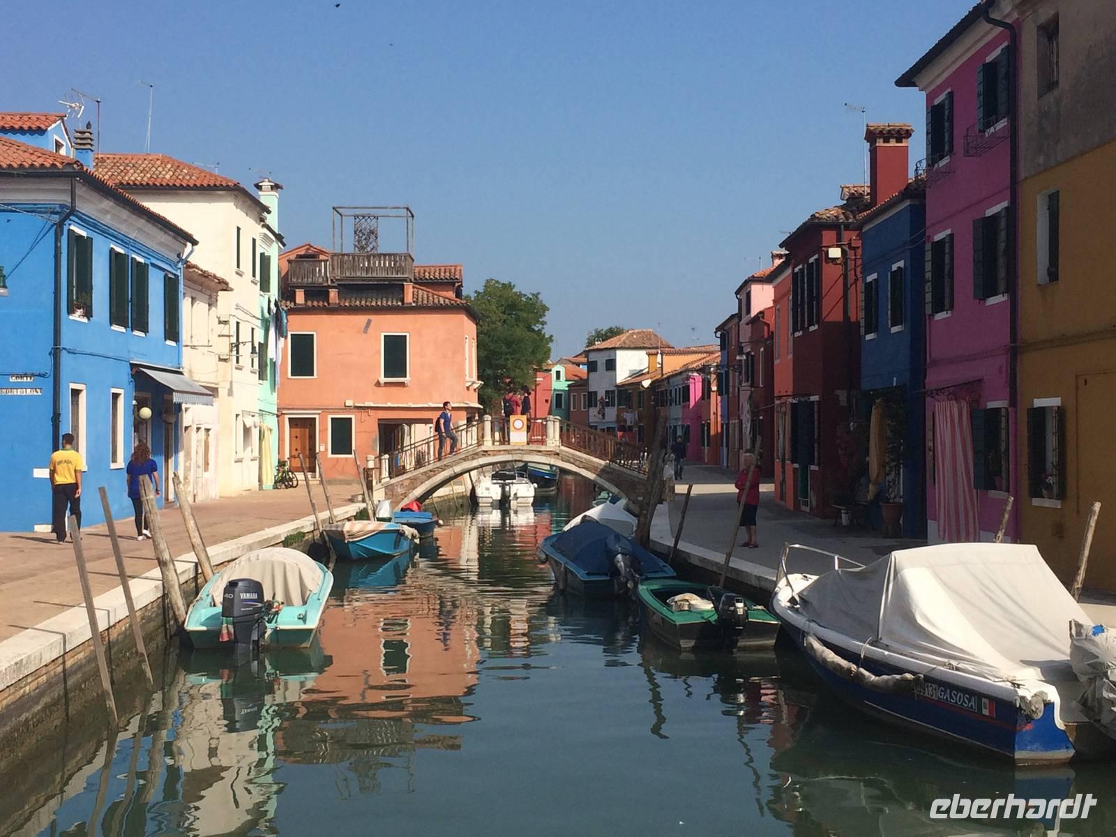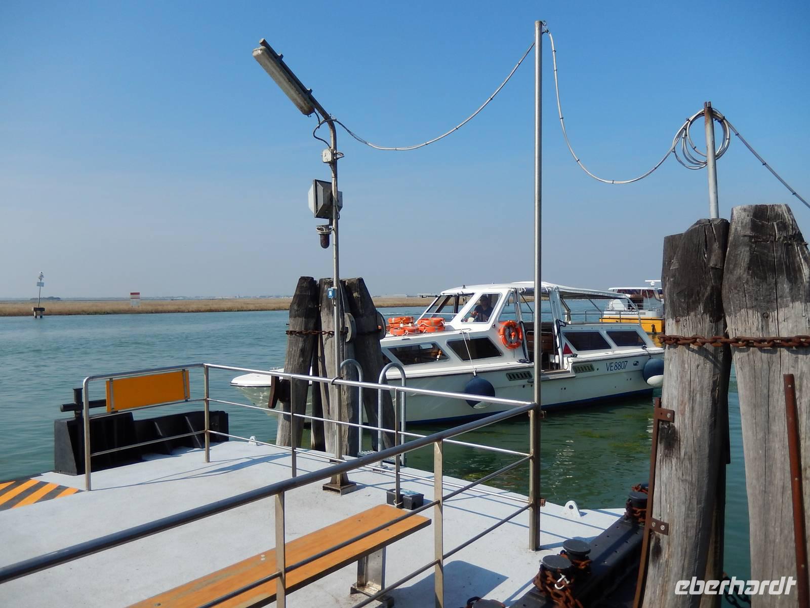 Heute nun kann man seinen eigenen freien Tag gestalten oder einen fakultativen Ausflug zu den Inseln der Lagune unternehmen. Letztlich entschließt sich jeder Teilnehmer, den Ausflug mitzumachen. Und so treffen wir uns wieder mit Alessia in Venedig am Hauptbahnhof und besteigen dort unser Ausflugsboot, welches wir ganz für uns haben. Und so sehen wir auf der Fahrt zu unserer ersten Insel das Zentrum Venedigs rund um den Markusplatz von der Wasserperspektive aus. Zuerst steuern wir die Insel Torcello im Norden der Lagune an. Ein ruhiges Fleckchen Erde, dass sowohl Natur als auch Beschauliches zu bieten hat. Wir gehen ein Stück zu Fuss über die Insel bis zum altehrwürdigen Dom Santa Maria Assunta mit seinen byzantinischen Mosaiken. Der Dom rührt aus der Zeit, als die Insel noch Bischofssitz war. Joachim nimmt auf dem "Thron des Atilla" (hat aber nichts mit dem Hunnenkönig zu tun), einem aus einem Stück Stein gehauenen Sitz, Platz. Weiter führt uns unsere Erkundungsfahrt durch die Lagune zur Insel Burano. Sie ist eine der größten und am frühesten besiedelten Inseln in der Lagune. Ein besonderes Merkmal sind die besonders farbenfrohen Fischerhäusschen. Geprägt wurde die Insel über Jahrhunderte von der Fischerei und der Spitzenstickerei. So gibt es bei einem kleinen Rundgang Einiges zu entdecken und auch die Möglichkeit eines kleinen Imbiss in einem der zahlreichen Lokale auf der Piazza Galuppi.