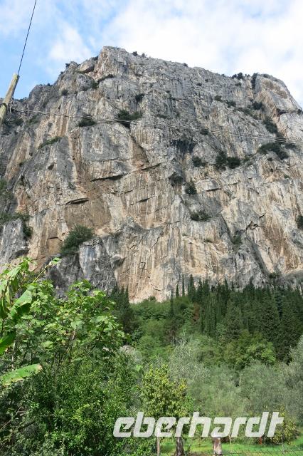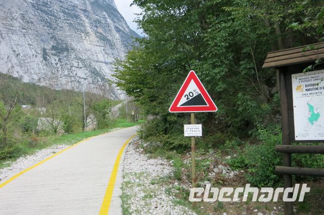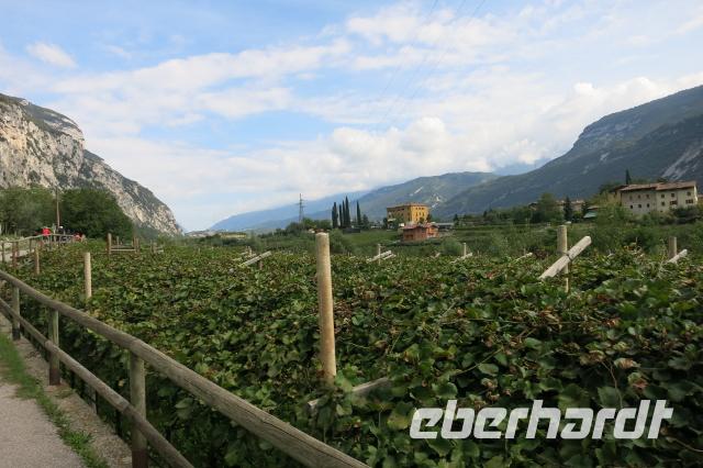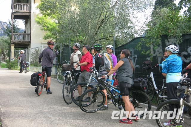 Es war kühl am morgen als wir die Räder inEmpang nehmen durften. Pünktlich kam unser Guide Roberto und machte uns mit sich und der Strecke bekannt. Direkt neben dem Hotel ging es auf einem gut ausgebauten Radweg in die Stadt. Nach einer kleinen Rundtour im Hafen ging es am See entlang nach Torbole und von der Mündung der Sarca in das gleichnamige Tal hinein. Trotz des frühen Sonntag morgens trafen wir schon einige andere Radgruppen, meist Mountainbiker. Durch Olivenhaine, Obst - und Weingüter ging es nach Arco. Dieses schöne Städtchen musste man zu Fuß durchstreifen und dafür hatten wir auch cgenügend Zeit. Die Weiterfahrt führte uns auf einer kleinen Nebenstrasse in Richtung Dro. Immer wieder hielten wir an um zu schauen und natürlich auch zum fotografieren. Es war auch beeindruckend wie nahe die liebliche Landschaft und der schroffe, steile Fels nebeneinander lagen. Immer wieder gab es Kletterer in der Wand zu bestaunen und natürlich die tolle Landschaft. Hin und wieder weckte auch eine Kiwi Zucht unser Interesse.