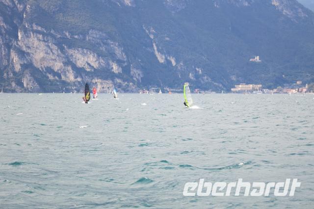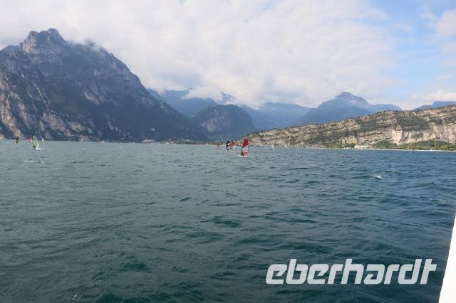 Gerade richtig meldete sich auch Ingo, unser Busfahrer um seinen Standplatz durchzugeben. Bald hatten wir ihn gefunden und die Räder konnten eingeladen werden. Am Hafen von Riva verabschiedete sich Roberto und wir bestiegen das Schiff nach Limone. Zum Glück fuhren wir diesen Abschnitt mit dem Bus, denn auf dem Boot war der Ora heftig zu spüren. Jetzt war auch der Gardasee bevölkert mit Surfern die kreuz und quer über den See zogen.