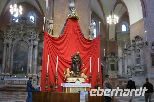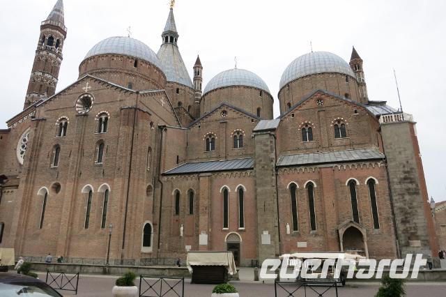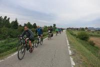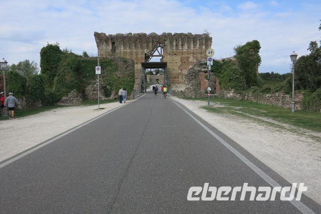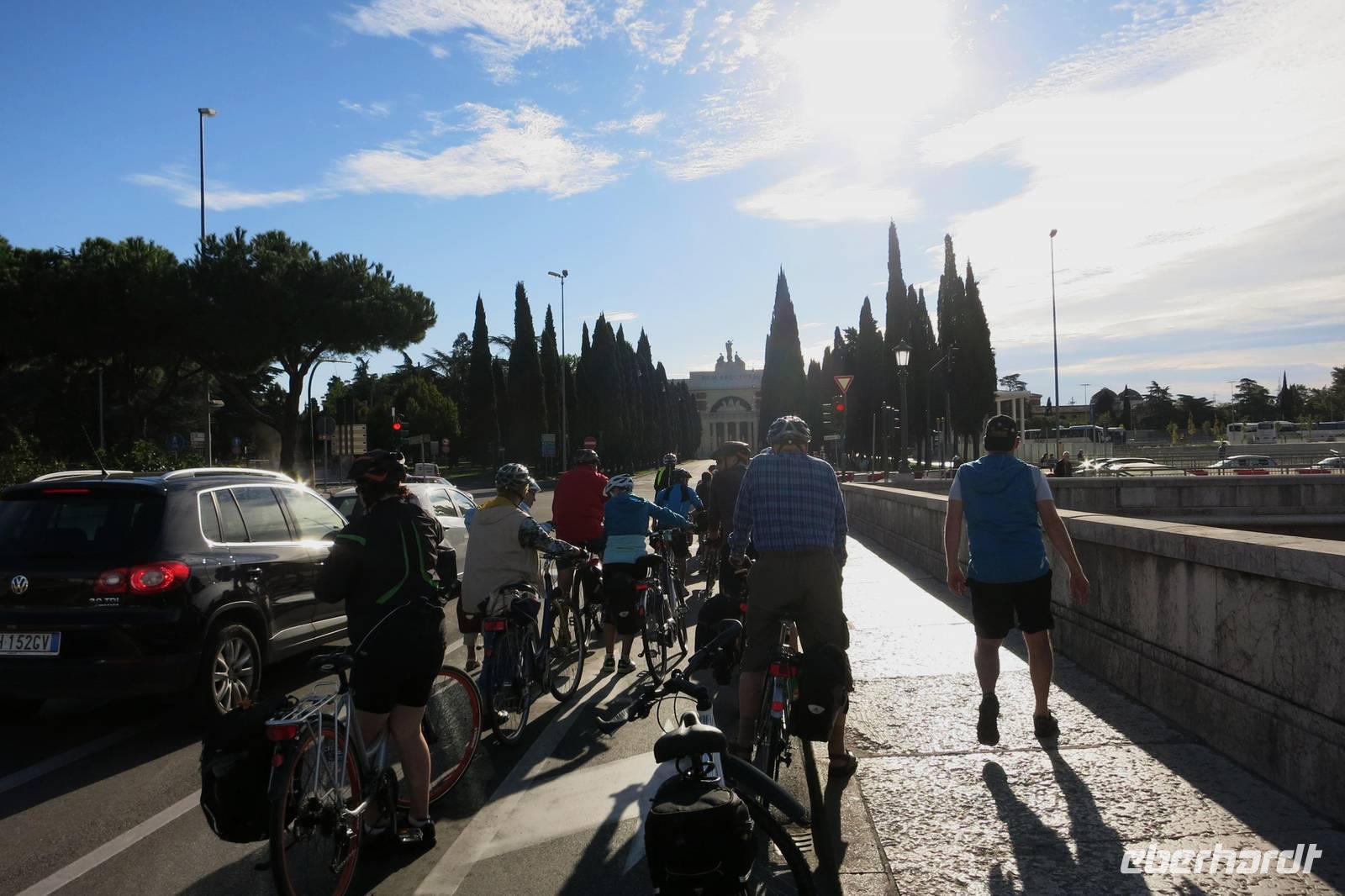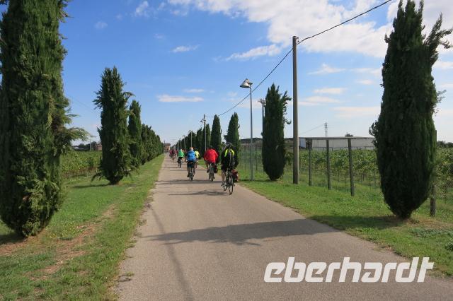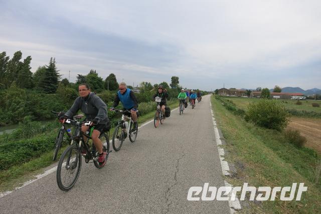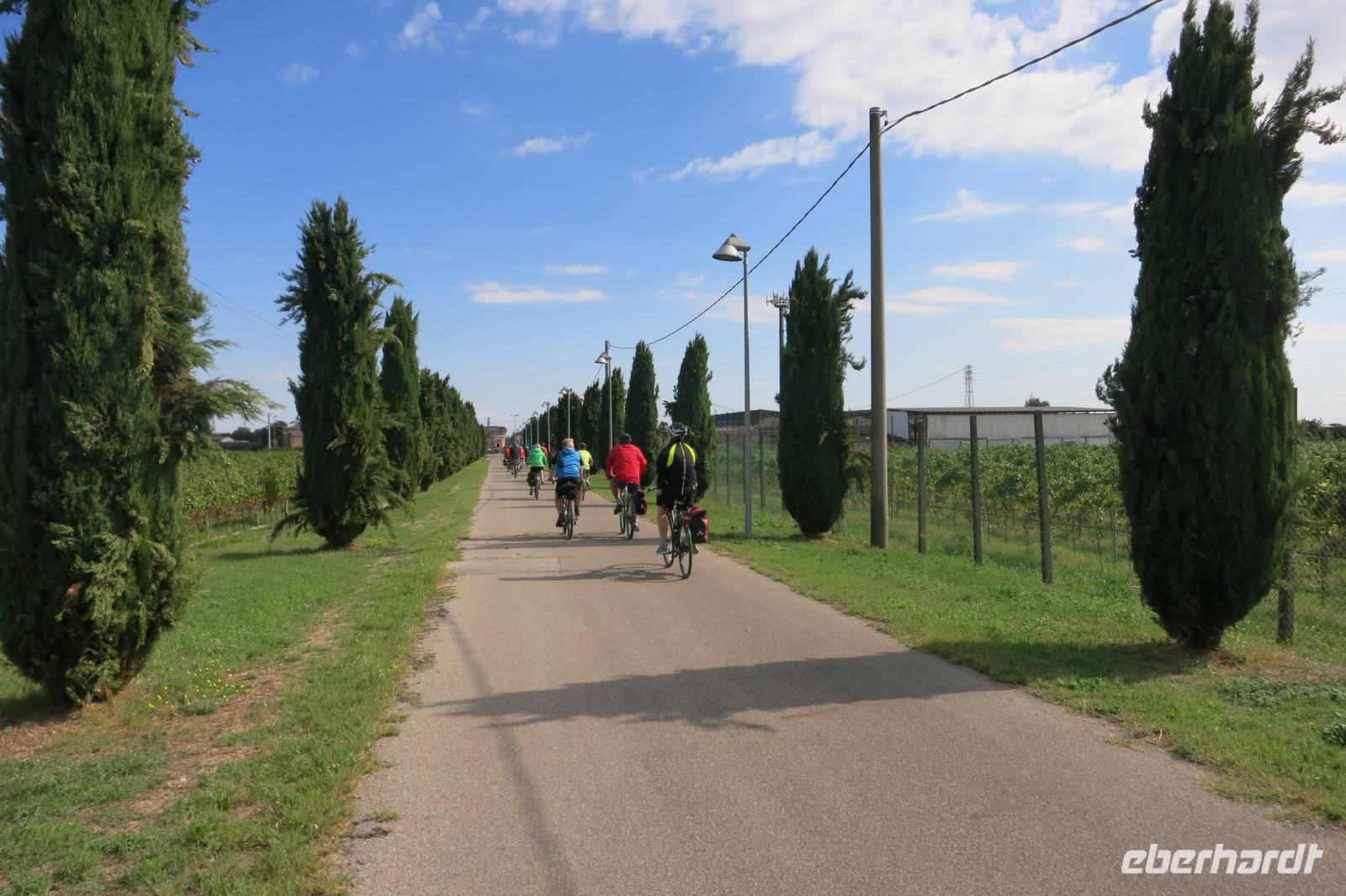 Zuerst statteten wir dem Dom und der Wallfahrtskirche von Padua einen Besuch ab. Auf dem Damm des Brenta kamen wir gut voran, wenn auch der Gegenwind ordentlich zu spüren war. Hier mussten wir uns auf den Innenstadtstrassen als Gruppe behaupten, da es nicht so gute Radwege gab wie bisher. Wir hatten aber auch inzwischen gelernt uns zu behaupten und so kamen wir gut hinein und hinaus. Die offene Landschaft wurde nun mehr und mehr durch die zunehmende Bebauung abgelöst aber auf dem Damm des Brenta, und auf kleinen Nebenstrassen waren wir sicher unterwegs.