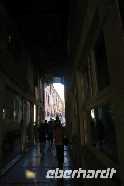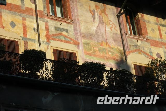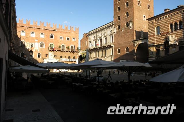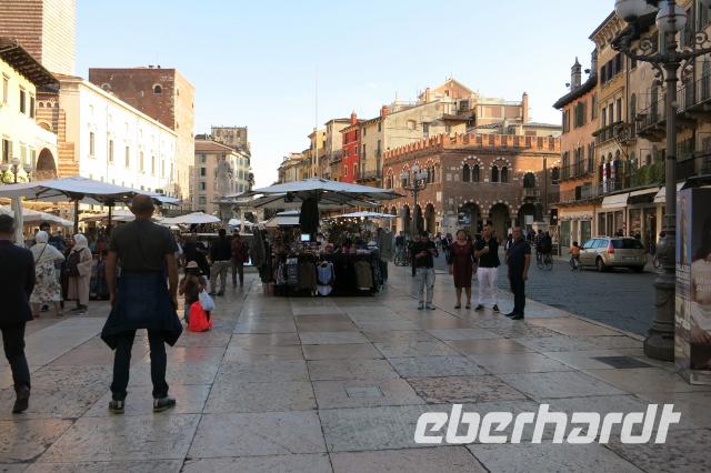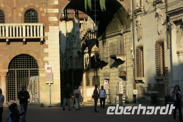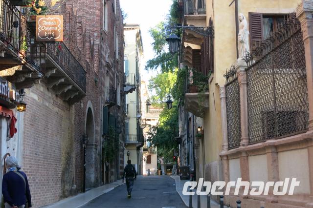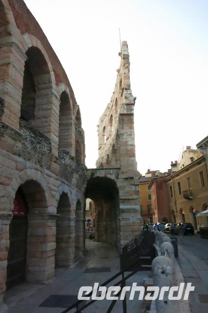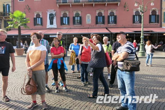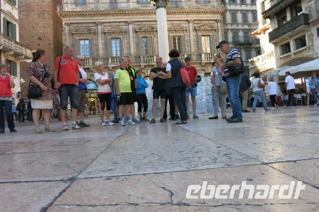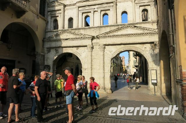 In einem weiten Bogen rollten wir jetzt auf Verona zu. Auf zum Teil gut ausgebauten Radwegen oder Radstreifen kamen wir trotz des starken Verkehrs gut in die Innenstadt zu unserm Hotel. Der Bus mit dem Gepäck stand schon in der Nähe - also zuerst ausladen, dann wurden die Räder sicher in der Hotelgarage verwahrt. Bis zum Beginn der Stadtführung war nicht mehr viel Zeit, also musste alles andere warten. Die Stadtführerin macht mit ihrerArt die Stadtgeschichte von Verona sehr lebendig. Sie zeigte uns auch wie man an Baustil und verwendeten Materialien die Zeit und die jeweiligen Herrscherhäuser ablesen konnte. Beim Bummel durch die Stadt erhielten wir schöne Aus - und Einblicke. Wir hatten auch Glück, das wir bei einigen sonst verschlossenen Innenhöfen offene Türen vorfanden. Im Licht der abendsonne kamen wir neben der Arena,zur Brücke mit dem Schloss, das römische Tor, den Marktplatz und den "politischen Platz" und an vielen weiteren interessanten Bauwerken vorbei.