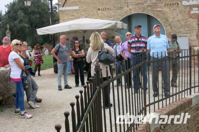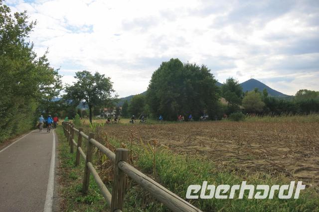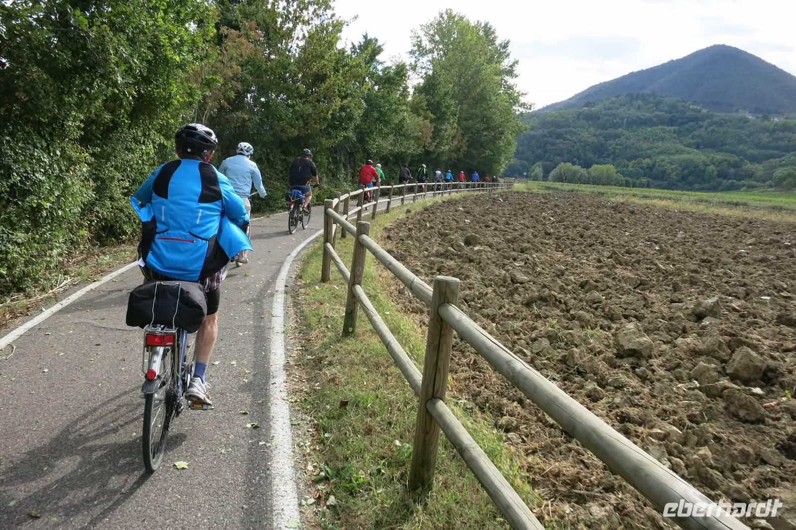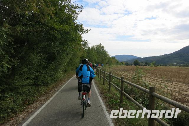 Der Radweg nach Soave führte zuerst am Fluss entlang bis die Adige weiter nach Süden floss, wir aber weiter nach Westen wollten. Nun ging es teils auf kleinen Sträßchen, teils auf Feld - und Dammwegen durch die inzwischen abgeernteten Felder. Langsam nahm der Weinbau zu und wir erreichten das bekannte Weißweingebiet von Soave. Eine Weinprobe war leider nicht möglich, da die Weinlese in vollem Gange war. Teilweise konnten wir auch den Menschen bei ihrer Arbeit entspannt zuschauen. Schon aus der Ferne konnten wir an einen Berghang geschmiegt die Scaliger Burg von Soave erkennen und bald war die ganz von einer Stadtmauer umgebene Altstadt erreicht. Raimond hatte auch hier ein italienisches Essen organisiert und so konnten wir vor dem Essen noch etwas durch die Stadt und über den zu Ende gehenden Markt bummeln. Nach der Pausa stiegen zwei Mitreisende in den Bus. Alle anderen machten sich auf den Weg in Richtung Vicenza. In Brendano war dann noch einmal eine Verschnaufpause fällig da wir nun den Hügel der Vicenza umgibt überqueren wollten. Alle haben die 200 (gefühlt 2000) Höhenmeter gemeistert. Bald schon hatten wir einen schöne Ausblick, auf der einen Seite das Tal um Vicenza, auf der anderenSeite in die Tiefebene in Richtung Padua und Abano Therme. Nun ging es eine lange Abfahrt hinunter, an einer Plattform über der Stadt hielten wir noch einmal an und genossen in der Nachmittagssonne den weiten Blick über die Stadt. Trotz des auch hier starken Verkehrs kamen wir gut durch die Stadt und zu unserem ruhig gelegenen Hotel.