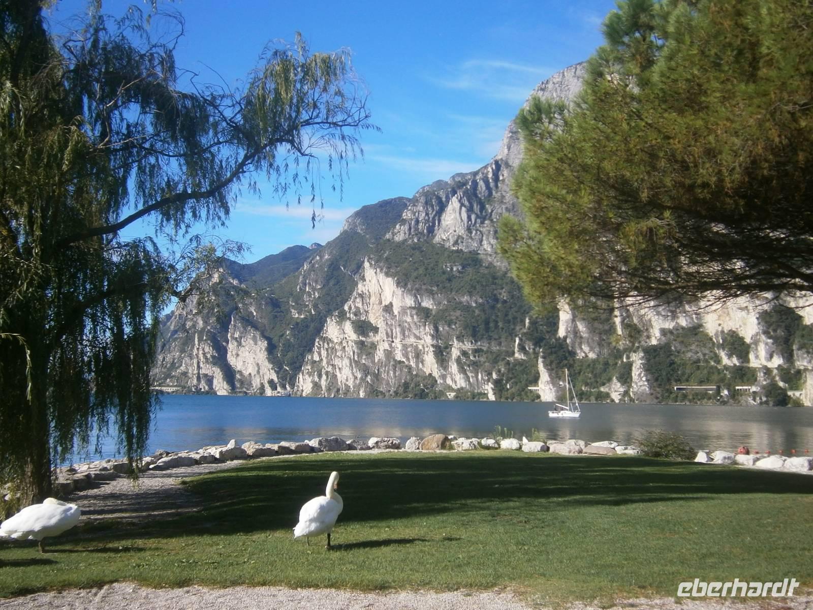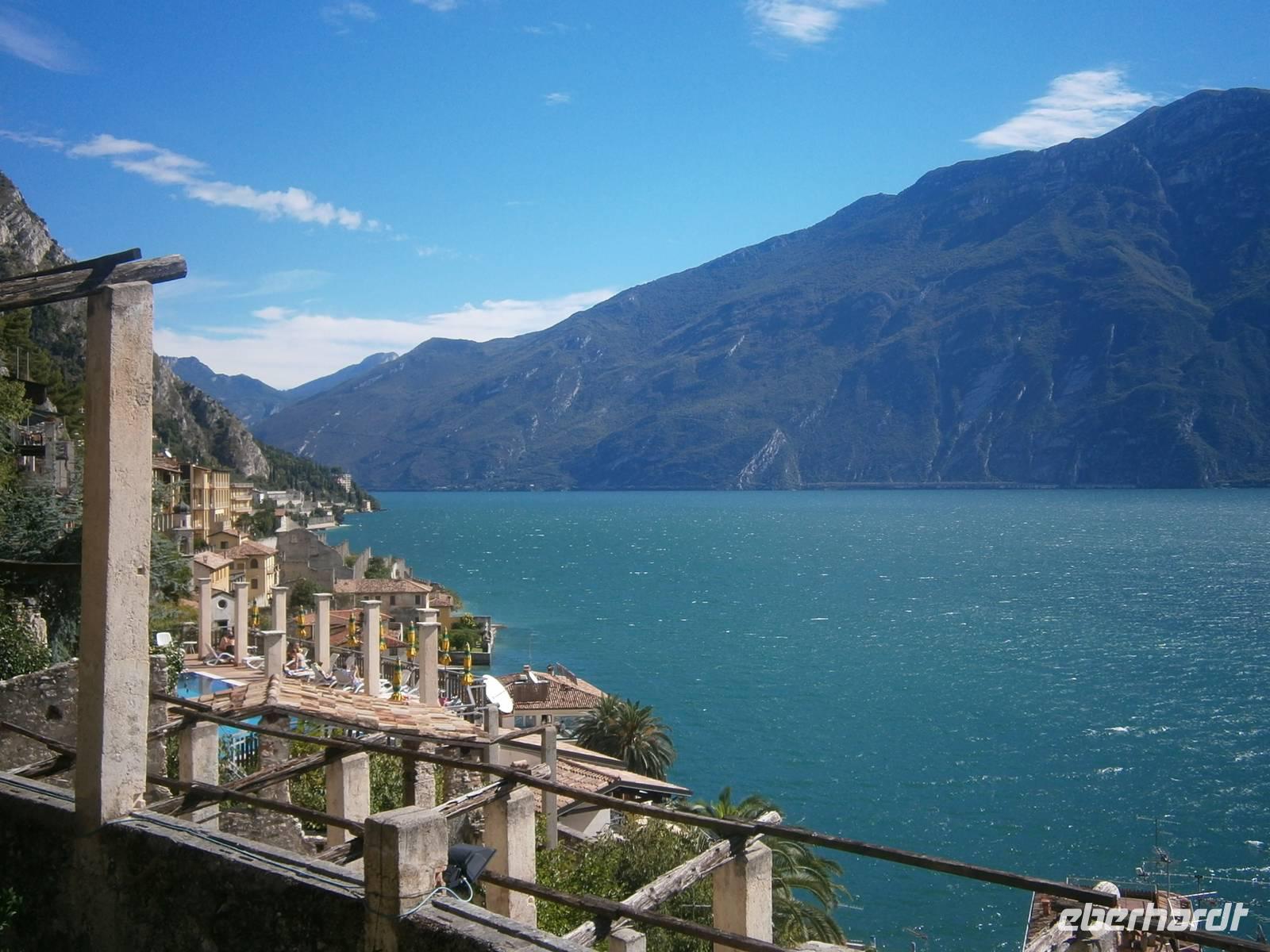 Der Gardasee, er ist der größte der Oberitalienischen Seen, zeigt sich in den nächsten Tagen von seiner schönen Seite. Mediteranes Klima, die einzigartige Naturkulisse, zahlreiche kleine Ortschaften mit einer wechselvollen Geschichte und nicht zu vergessen die üppige Vegetation prägen das Bild des „Lacus Benacus", wie ihn die Römer nannten. Unser erster Ausflugstag führt uns entlang des Ostufers, bekannt als „Riviera degli Olivi", die Olivenriviera. Die Panoramastraße - Gardesana Orientale -, sie ist zirka 50 Kilometer lang, führt uns von Riva del Garda, an Torbrole - Malcesine - Torri del Benaco - Garda - Bardolino - Lazise - Peschiera del Garda vorbei, zum Südufer nach Sirmione.