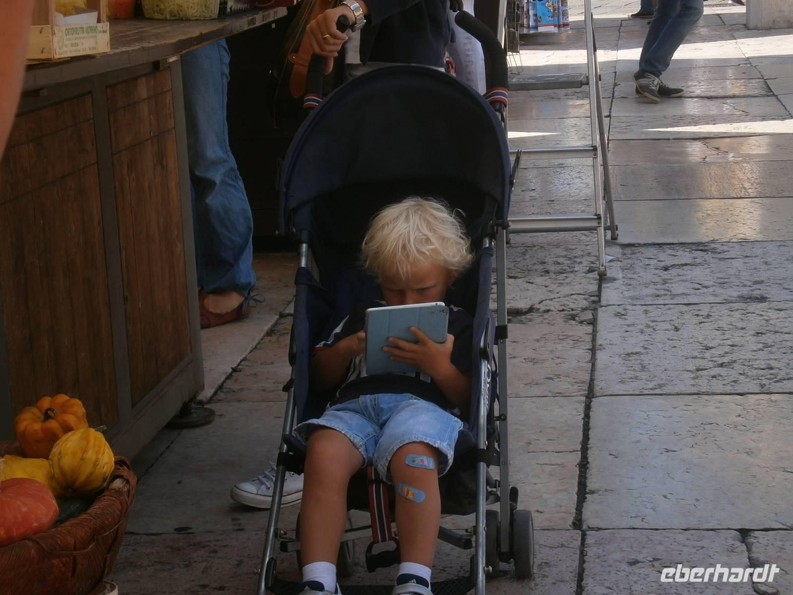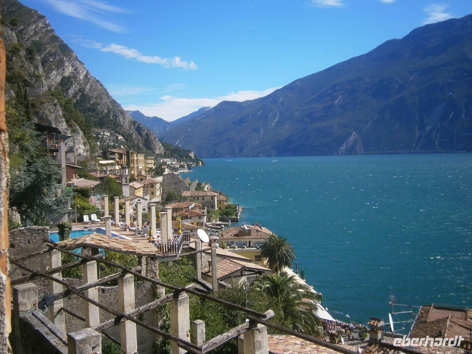 Sonnenschein, blauer Himmel - ideale Bedingungen für eine Auffahrt mit der Seilbahn auf den Monte Baldo. Wir reihen uns ein in die Schlange der Wartenden, um auf den Berg hinauf zu fahren. Nach einer Stunde Wartezeit sind unsere Gäste dann endlich an der Reihe. Während der Fahrt zum Gipfel drehen sich die Kabinen langsam, so dass man den Blick rund herum genießen kann. Hier gibt es gut angelegte Wanderwege und  das Gipfelgebiet ist auch beliebt bei den Gleitschirmfliegern, die hier ihre Startbahn haben. Bevor es am zeitigen Nachmittag zurück nach Riva geht, nutzen unsere Gäste die verbleibende Zeit zu einem ausgiebigen Bummel durch Malcesine - der Ort liegt zu Füßen des Monte Baldo. Ein beliebtes Fotomotiv ist das „Castello Scaligero", gelegen auf einem Felsen nördlich der Altstadt. Die Burg eingegangen in die deutsche Literatur - J.W. Goethe weilte hier am 13. September 1786, ist heute als Museum eingerichtet. Die Altstadt von Malcesine erstreckt sich unterhalb der Hauptstraße. Durchzogen von vielen kleinen Gassen, verwinkelten Straßen ist der Ort Ziel von unzähligen Touristen, nicht nur in den Sommermonaten. Unweigerlich erreicht man auch den Hafen. Hier bietet sich dem Besucher ein reizvolles Bild - die mittelalterliches Häuser und Palazzi erstrahlen in Rot- und Ockerfarben. Und immer wieder Souvenirs - Souvenirs - Souvenirs