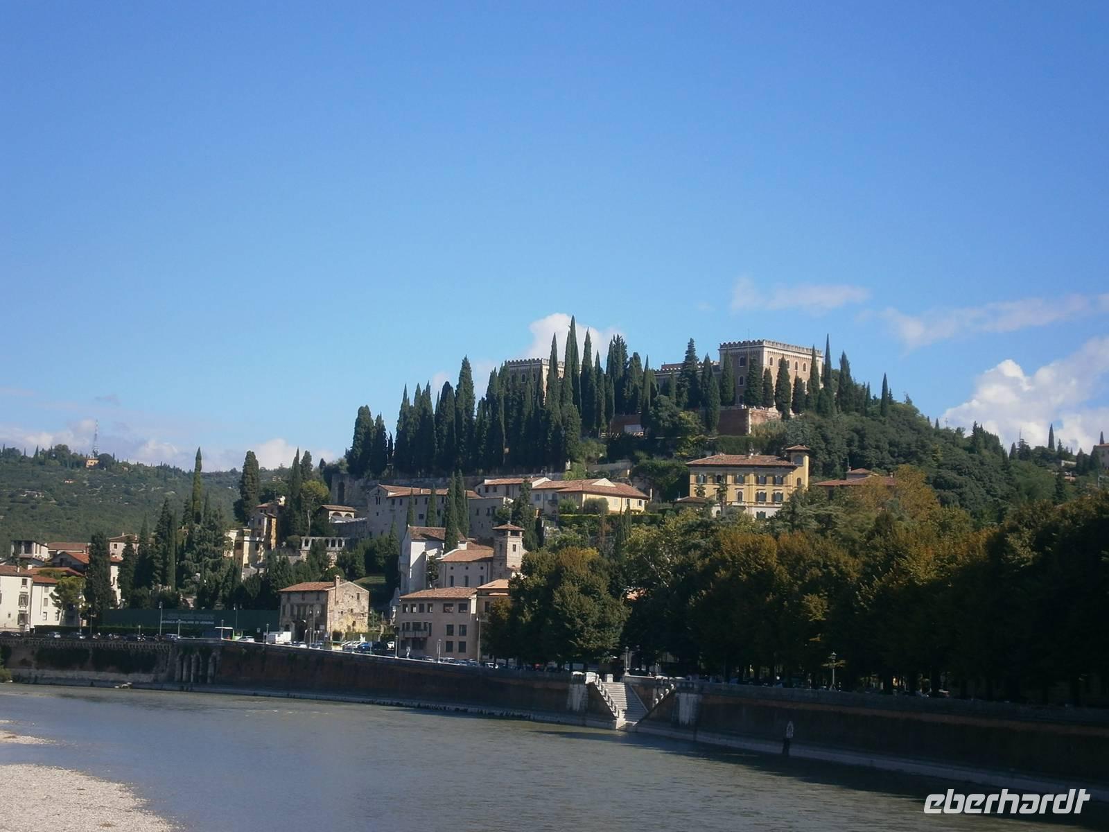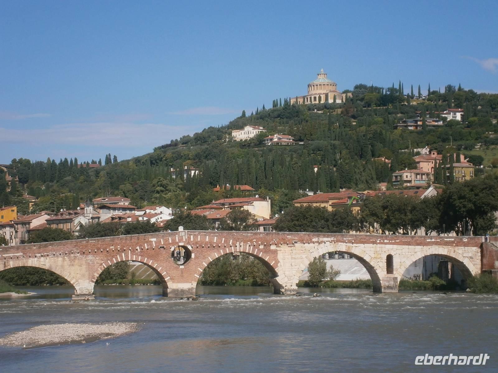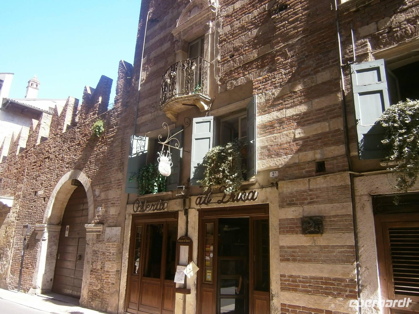 Der nächste Morgen zeigt sich wieder von seiner schönsten Seite, die Luft ist wie klar gewaschen. Wir fahren nach Verona und sind pünktlich zur angegebenen Zeit an der Via Pallone. Hier treffen wir unsere Gästeführerin Renza. Gemeinsam mit ihr drehen wir mit dem Bus erst mal eine Runde entlang der alten Stadtmauer, vorbei an den Stadttoren - Porta Nuova, Porta Palio, Porta San Zeno - am Teatro Romano zur Alten Römerbrücke. Von hier aus spazieren wir in die Altstadt von Verona, genießen den Ausblick auf das Castel San Pietro und auf die Kirche Sant´Anastasia. Auf der Piazza dei Signori, umgeben von Palästen, steht das Denkmal für Dante. Der Platz war früher das Verwaltungs- und Regierungsviertel von Verona. Bei Ausgrabungsarbeiten fand man Mosaiken, Straßenbelag und Fundamente vonb altern römischen Gebäuden. Über die Piazza delle Erbe, sie bildet den Mittelpunkt der Altstadt und gilt als einer der schönsten Plätze von Italien, erreichen wir mit „Müh und Not" den Balkon der Julia. Im Innenhof drängen sich die Schaulustigen, wohl auch wegen des Hochzeitspaares, um hinauf zu sehen und den Balkon zu fotografieren. Weniger bekannt ist der Palazzo in der Via Arche Scaligere, hier steht das Haus der Familie Cagnolo Nogarola, das Haus der Familie von Romeo. Unser Stadtrundgang endet an der berühmten Arena auf der Piazza Bra. Das römische Theater wurde im 1. Jahrhundert errichtet und ist heute eines der wichtigsten Sehenswürdigkeiten der Stadt. Von der ehemaligen Prunkfassade aus Marmor ist nur noch wenig erhalten. Alljährlich finden hier in den Sommermonaten Juli und August die Opernfestspiele statt, immerhin schon seit 1913. Unsere Gäste nutzen die verbleibende Freizeit für einen individuellen Bummel durch die Stadt und gemeinsam fahren wir am Nachmittag zurück in Richtung Hotel.