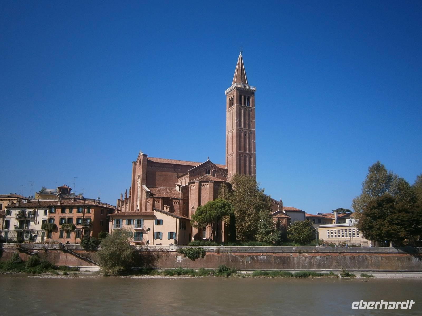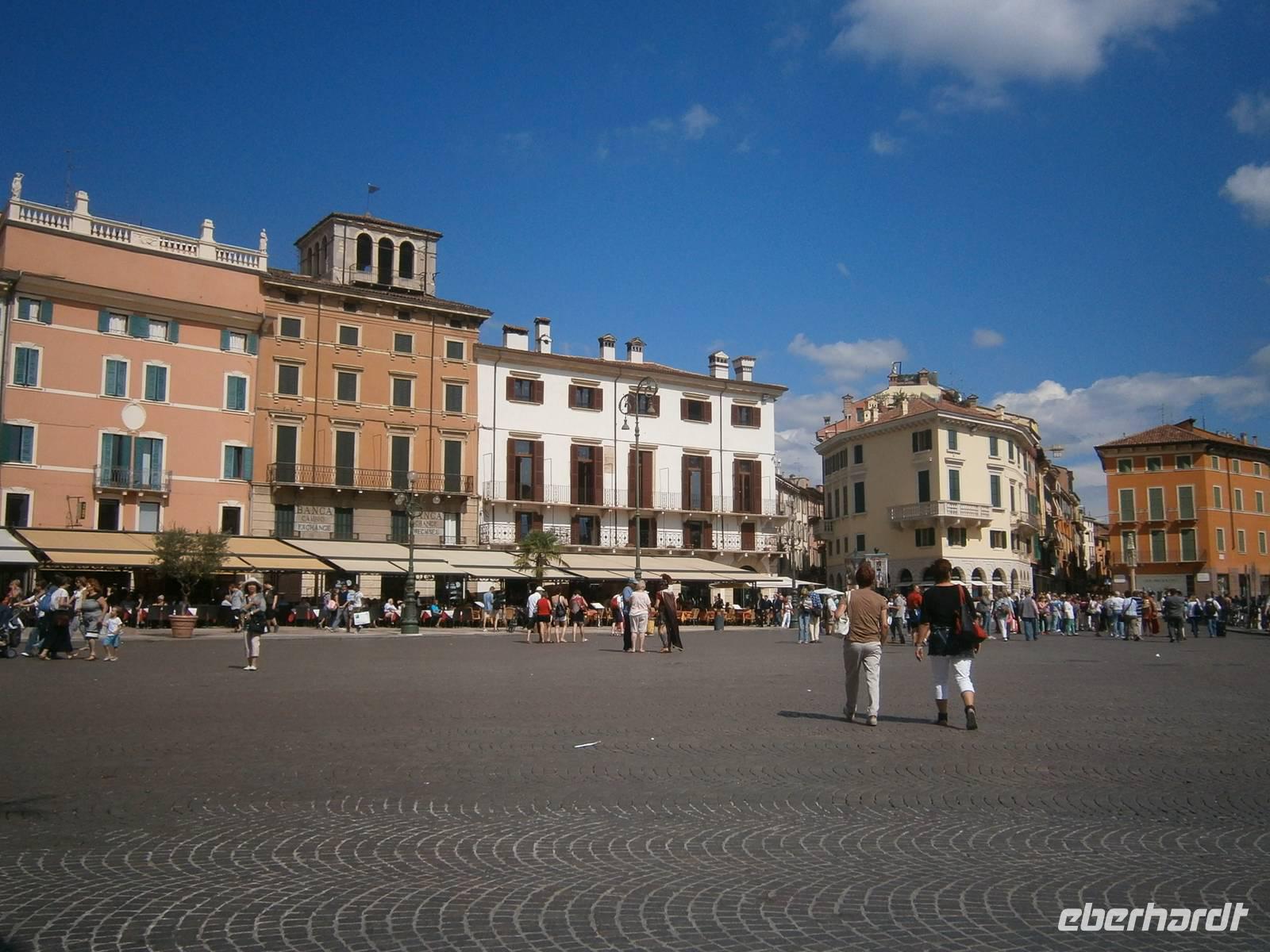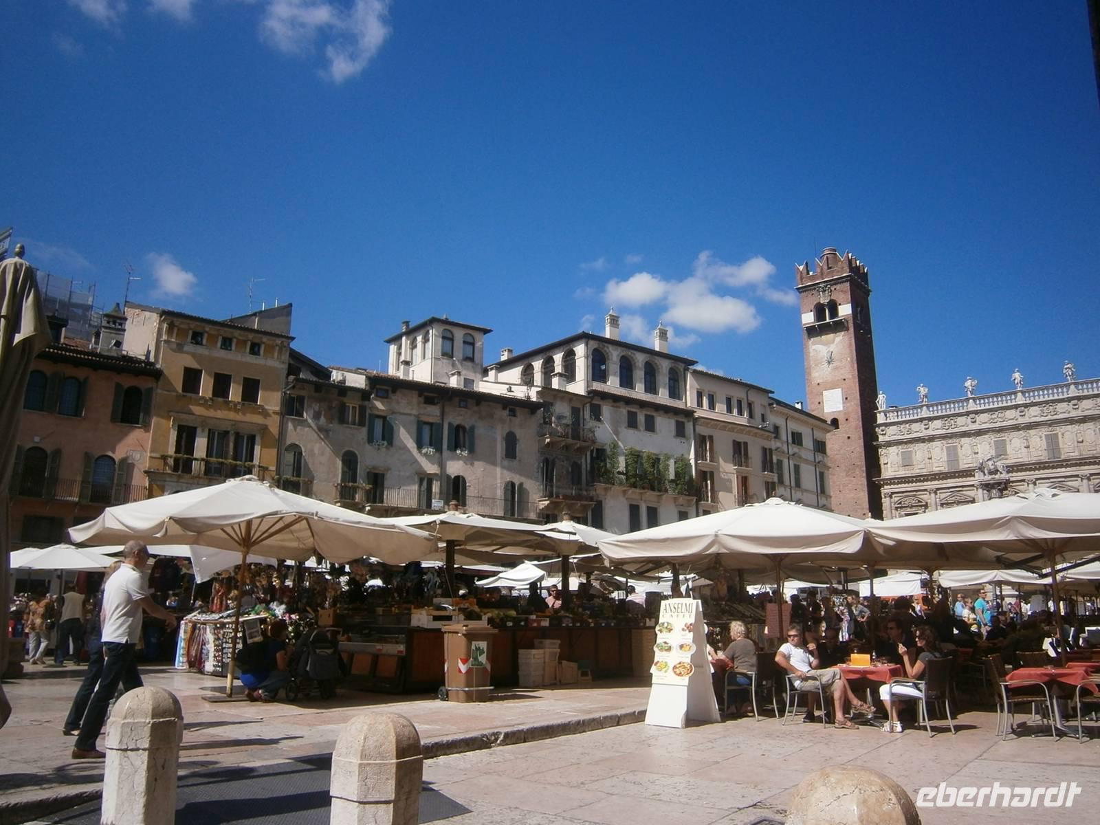 Der nächste Morgen zeigt sich wieder von seiner schönsten Seite, die Luft ist wie klar gewaschen. Wir fahren nach Verona und sind pünktlich zur angegebenen Zeit an der Via Pallone. Hier treffen wir unsere Gästeführerin Renza. Gemeinsam mit ihr drehen wir mit dem Bus erst mal eine Runde entlang der alten Stadtmauer, vorbei an den Stadttoren - Porta Nuova, Porta Palio, Porta San Zeno - am Teatro Romano zur Alten Römerbrücke. Von hier aus spazieren wir in die Altstadt von Verona, genießen den Ausblick auf das Castel San Pietro und auf die Kirche Sant´Anastasia. Auf der Piazza dei Signori, umgeben von Palästen, steht das Denkmal für Dante. Der Platz war früher das Verwaltungs- und Regierungsviertel von Verona. Bei Ausgrabungsarbeiten fand man Mosaiken, Straßenbelag und Fundamente vonb altern römischen Gebäuden. Über die Piazza delle Erbe, sie bildet den Mittelpunkt der Altstadt und gilt als einer der schönsten Plätze von Italien, erreichen wir mit „Müh und Not" den Balkon der Julia. Im Innenhof drängen sich die Schaulustigen, wohl auch wegen des Hochzeitspaares, um hinauf zu sehen und den Balkon zu fotografieren. Weniger bekannt ist der Palazzo in der Via Arche Scaligere, hier steht das Haus der Familie Cagnolo Nogarola, das Haus der Familie von Romeo. Unser Stadtrundgang endet an der berühmten Arena auf der Piazza Bra. Das römische Theater wurde im 1. Jahrhundert errichtet und ist heute eines der wichtigsten Sehenswürdigkeiten der Stadt. Von der ehemaligen Prunkfassade aus Marmor ist nur noch wenig erhalten. Alljährlich finden hier in den Sommermonaten Juli und August die Opernfestspiele statt, immerhin schon seit 1913. Unsere Gäste nutzen die verbleibende Freizeit für einen individuellen Bummel durch die Stadt und gemeinsam fahren wir am Nachmittag zurück in Richtung Hotel.