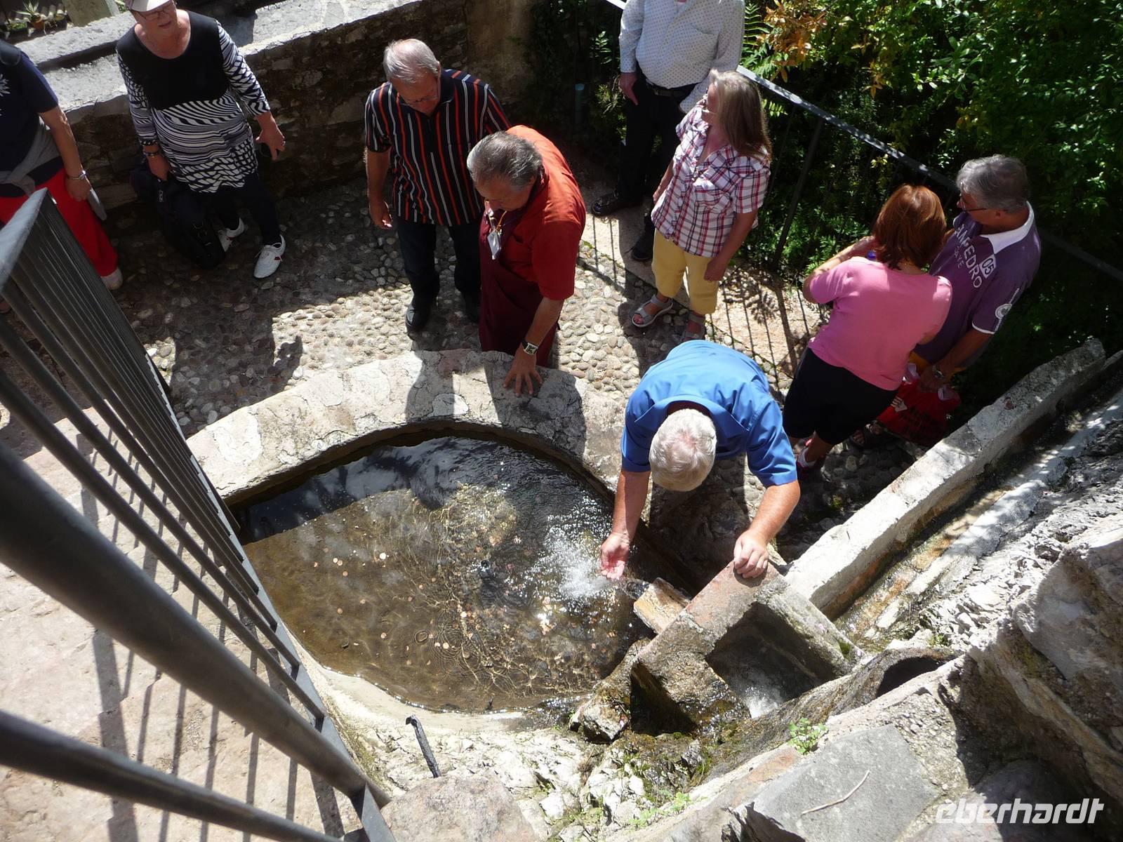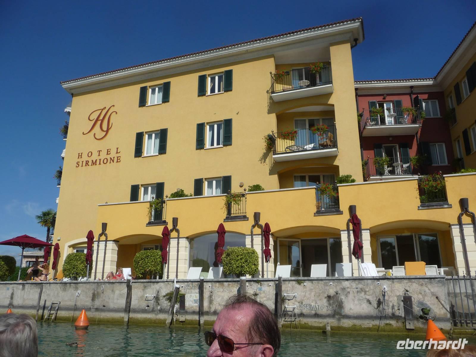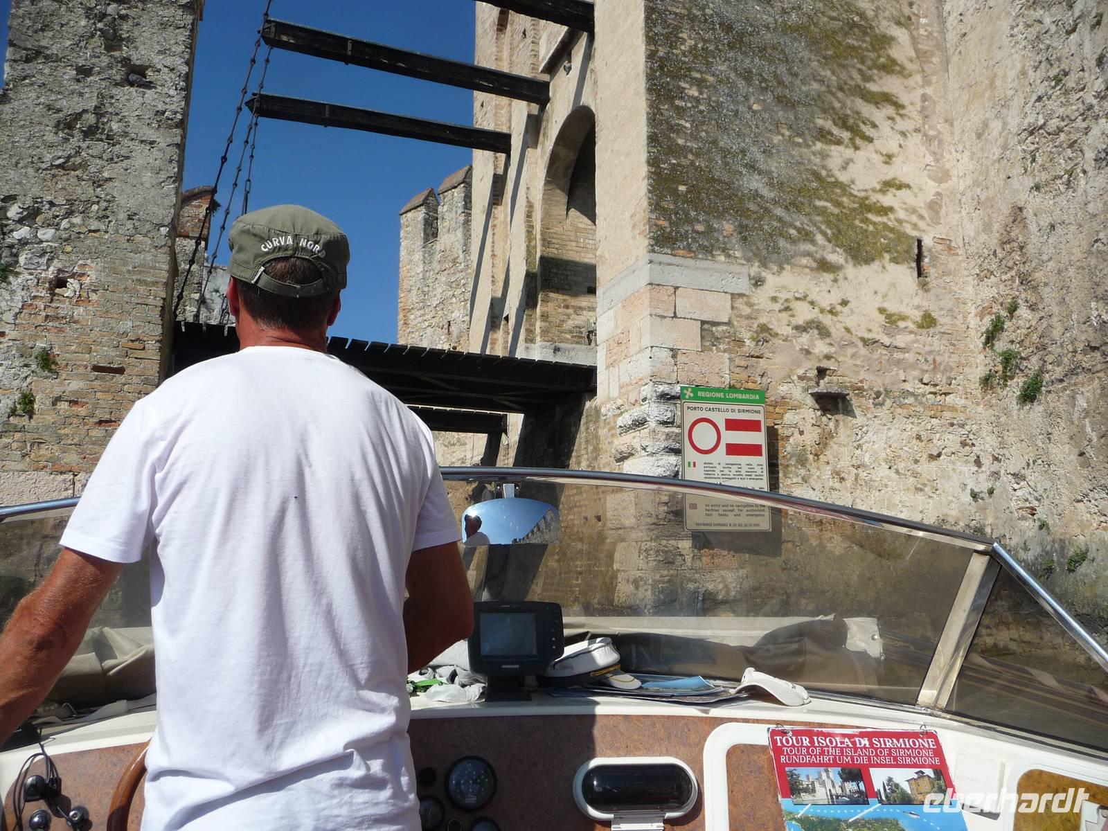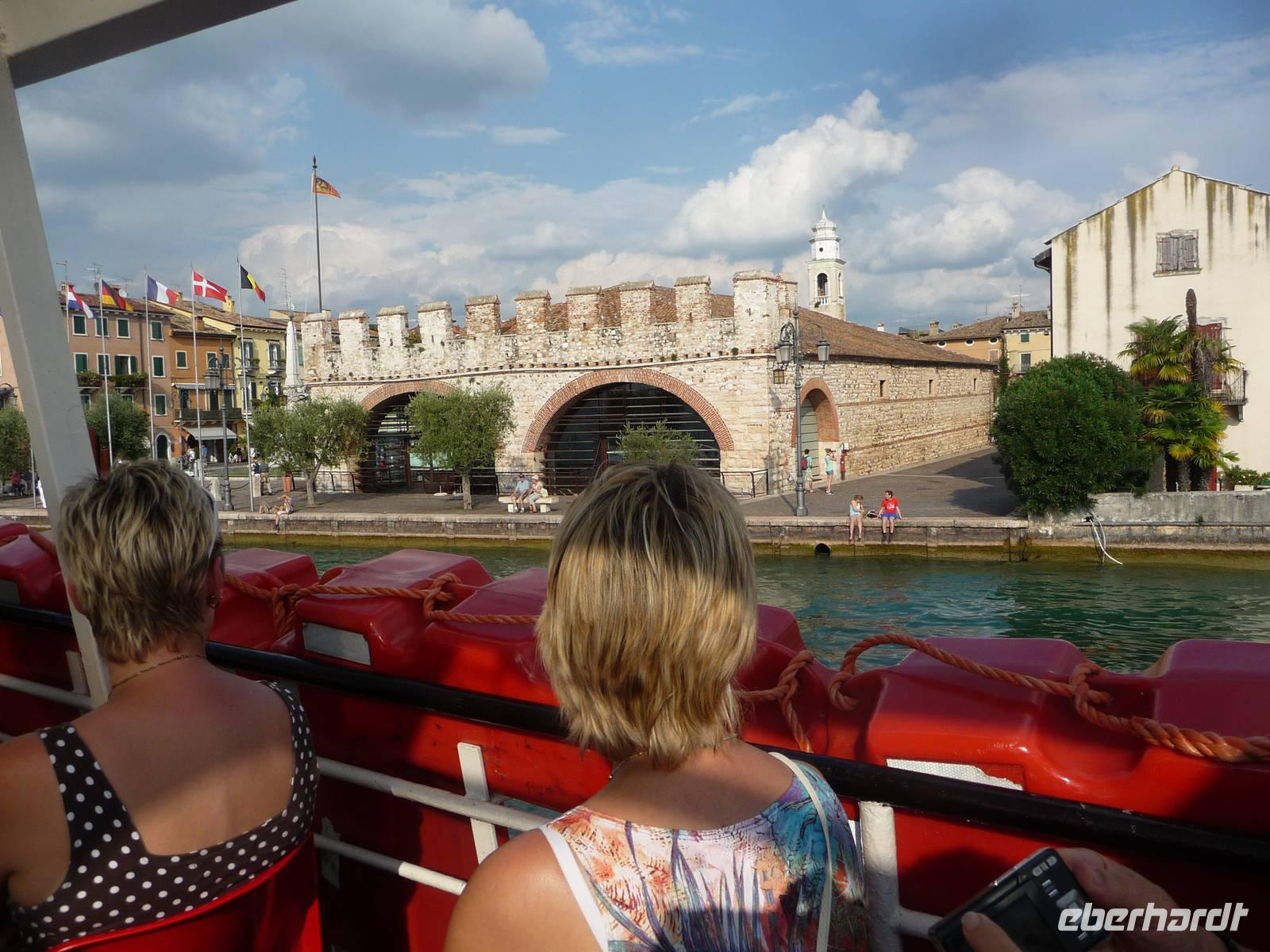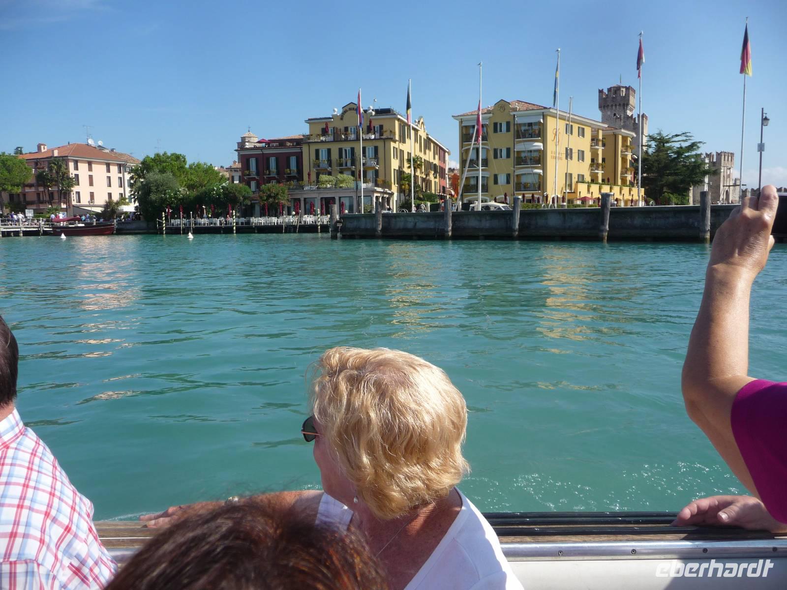 Von Garda aus fahren wir gen Süden durch die alte Festungsstadt Peschiera hindurch, in der wir die Festungsanlagen sehen können aber auch eine schöne Hafenanlage. Bald kommt Sirmione, die Halbinsel, die von Süden aus in den Gardasee hineinragt. Wir fahren an wunderbaren Rosenrabatten entlang und erreichen bald den Busparkplatz. Die Gästen haben dem Vorschlag des RL zugestimmt und steigen bei herrlichstem Sonnenschein in zwei bereitstehende Boote, die uns unter der Zugbrücke der Scaligerburg hindurch fahren auf die andere Seite des Gardasees hinaus. An den Ruinen des Catull vorbei schippernd erfahren wir von den heißen bis 70° C warmen Quellen, die aus den Tiefen des Gardasees hervorquellen und die für das warme, schwefelhaltige Heilwasser der großen Termenanlage sorgen.Ein Spaziergang durch das malerische Städtchen Sirmione mit dem Genuß eines Espressos oder einem in großen Batzen angebotenen italienischen Eis beschließt einen schönen Ausflugstag. Die Rückfahrt nach Garda durch die Städtchen Lazise und Bardolino rundet einen schönen Tag ab.