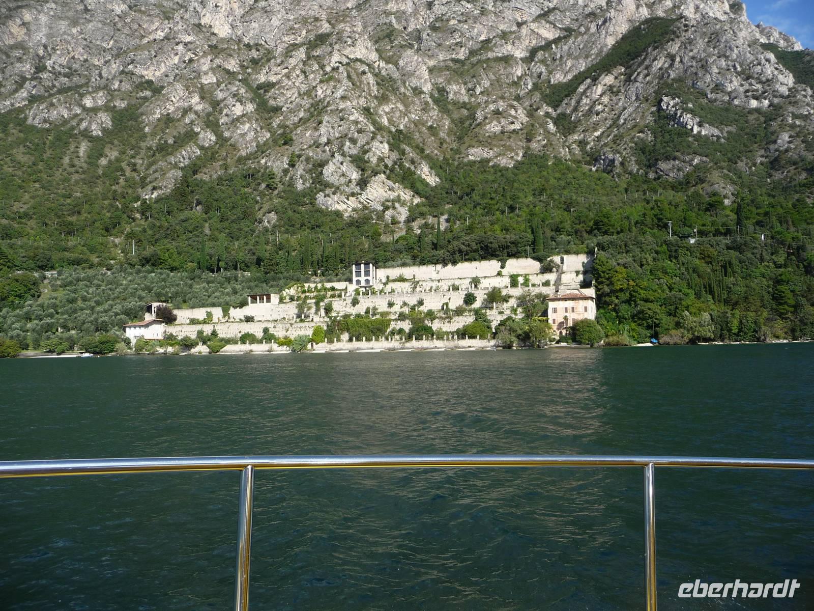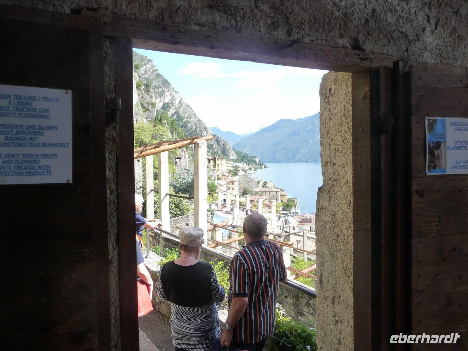 Wir fahren bis zum Nordufer in das prachtvolle Städtchen Riva, wo uns das Speedyboot mit dem Kapitän Roberto empfängt, um uns nach Limone zu schippern. Der nahe an den Felsen gebaute Ort war einst Grenzstädtchen zwischen Österreich und Italien, worauf auch der Name Limone (lateinisch Limes = Grenze) hinweist. Aber von den in der Vergangenheit in großen Mengen angebauten Limonen, Zitronen, Orangen ist heute noch eine wunderschöne Limonaia zu besichtigen. Der örtliche Stadtführer Alberto hat vor uns wißbegierigen Gästen sein ganzes in Jahrzehnten erworbenes Wissen zu Anbau, Pflege und Erntezeiträumen ausgebreitet und hat sich auch selbst erfreut an uns interessiertem Publikum.