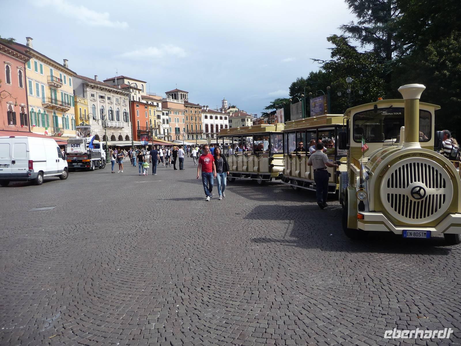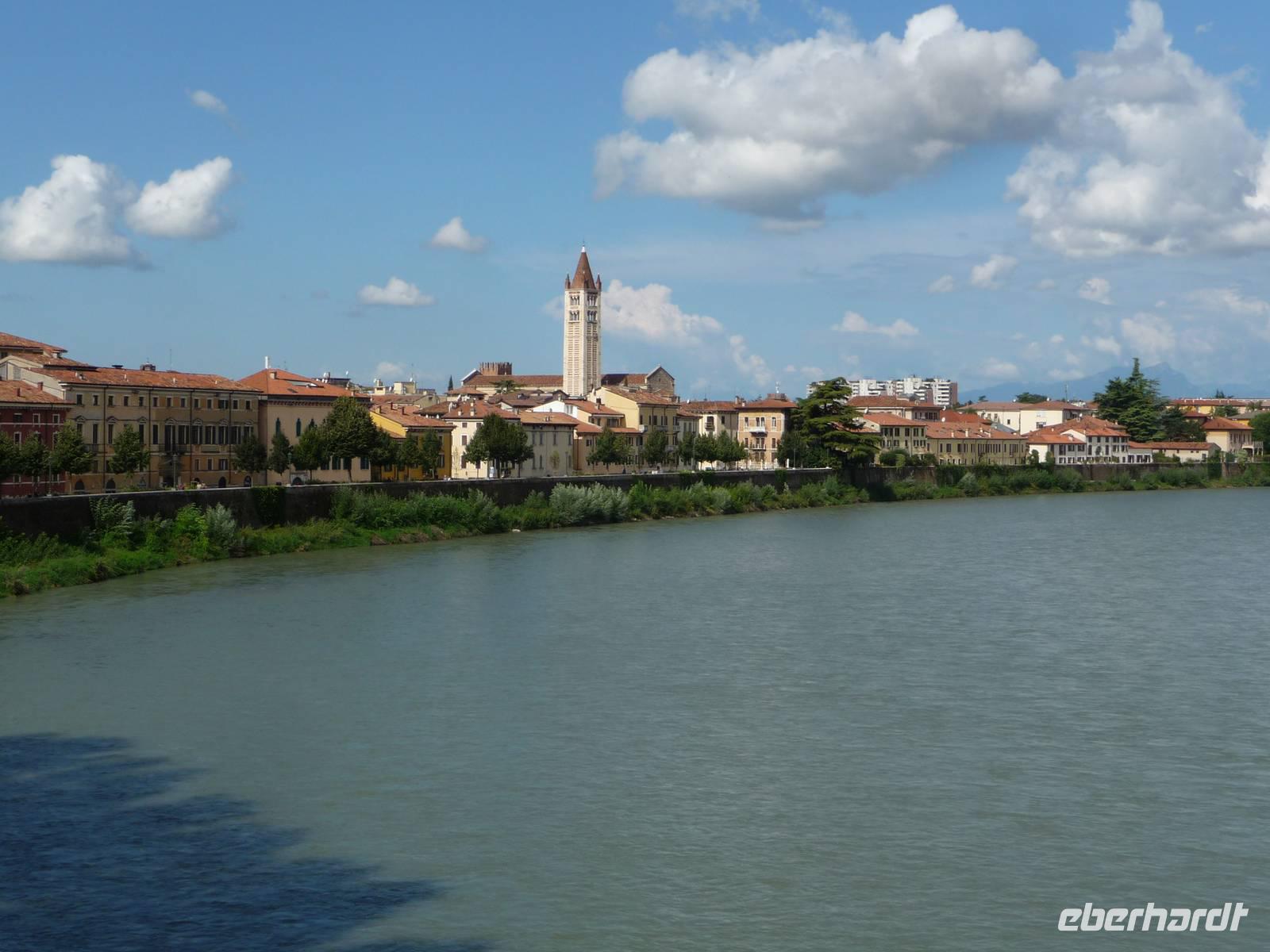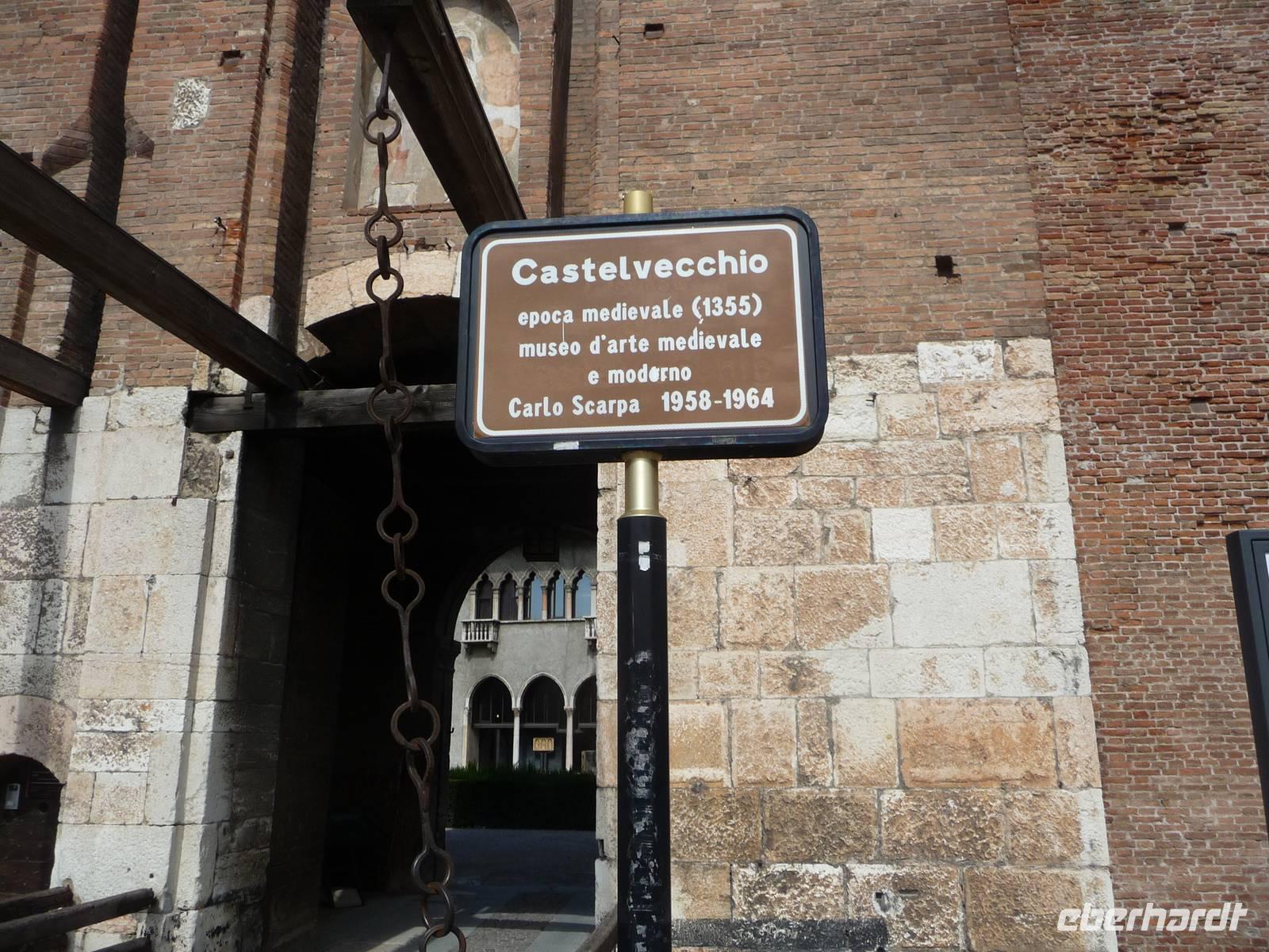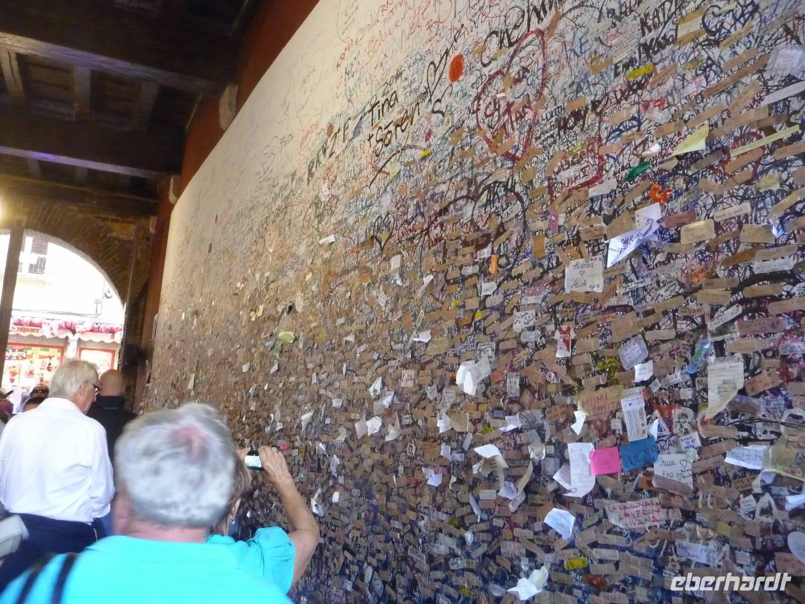 Nach dem Frühstück fahren wir in eine Stadt, die sich in ganz Italien mit keiner anderen vergleichen läßt, wir fahren nach Verona. Verona ist alt, elegant und berühmt für das Liebespaar aus zwei verfeindeten Familien. Romeo und Julia kommen aus dieser Stadt und es fällt schwer, zu glauben, dass es sich nur um Fantasieprodukte handelt, die Shakespeare in einem Drama verewigt hat. Die sehr informative Stadtführung mit Signora Lorella durch die historische Altstadt mit der Piazza delle Erbe, dem ehemaligen römischen Forum, heute Marktplatz und Touristentreffpunkt sowie der Piazza dei Signori mit der kunsthistorisch wertvollen Loggia aus der Renaissanczeit und dem Denkmal des größten Dichters Italiens, Aligheri Dante, endet im Hof des Wohnhauses der Julia. Schon auf den Wänden im Eingangsbereich verewigen sich junge Leute aus aller Herren Länder mit Liebesschwüren für ihre jeweils Angebeteten. Das Haus ist ein Museum und auf dem berühmten Balkon erscheint immer wieder eine moderne Julia, die vom unten wartenden Freund fotografiert wird. Die lebensgroße Statue der Julia im Hof verheißt demjenigen Liebesglück, der Julias Oberweite berührt, was dann auch ausgiebig von Männlein und Weiblein betrieben wird. Der Besuch der Arena di Verona, dem drittgrößten noch aus der Antike existierenden Amphitheater mit Plätzen für 25 000 Zuschauern, gehört zu den Höhepunkten der Stadtbesichtigung ebenso, wie der Eintritt in die Scaligerburg aus dem 13.Jh.