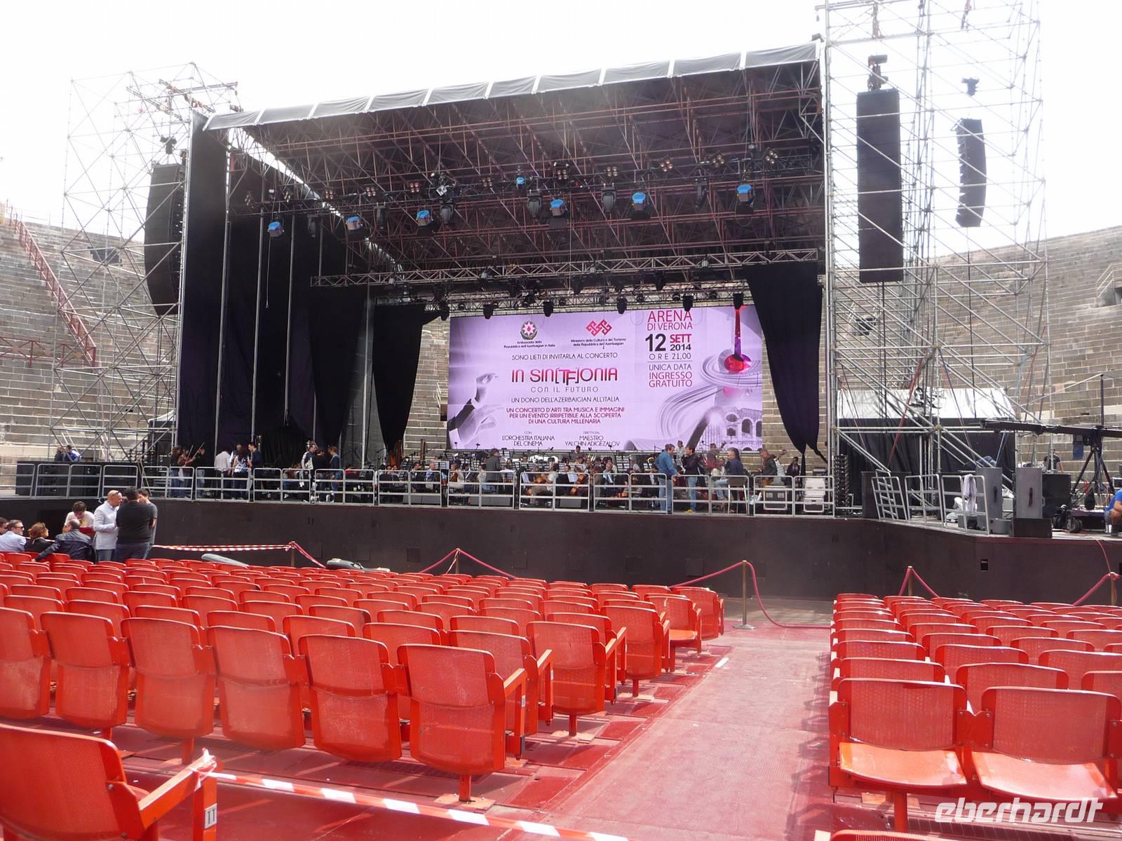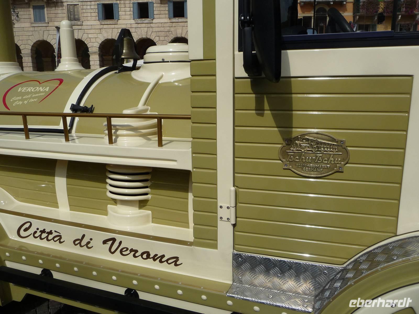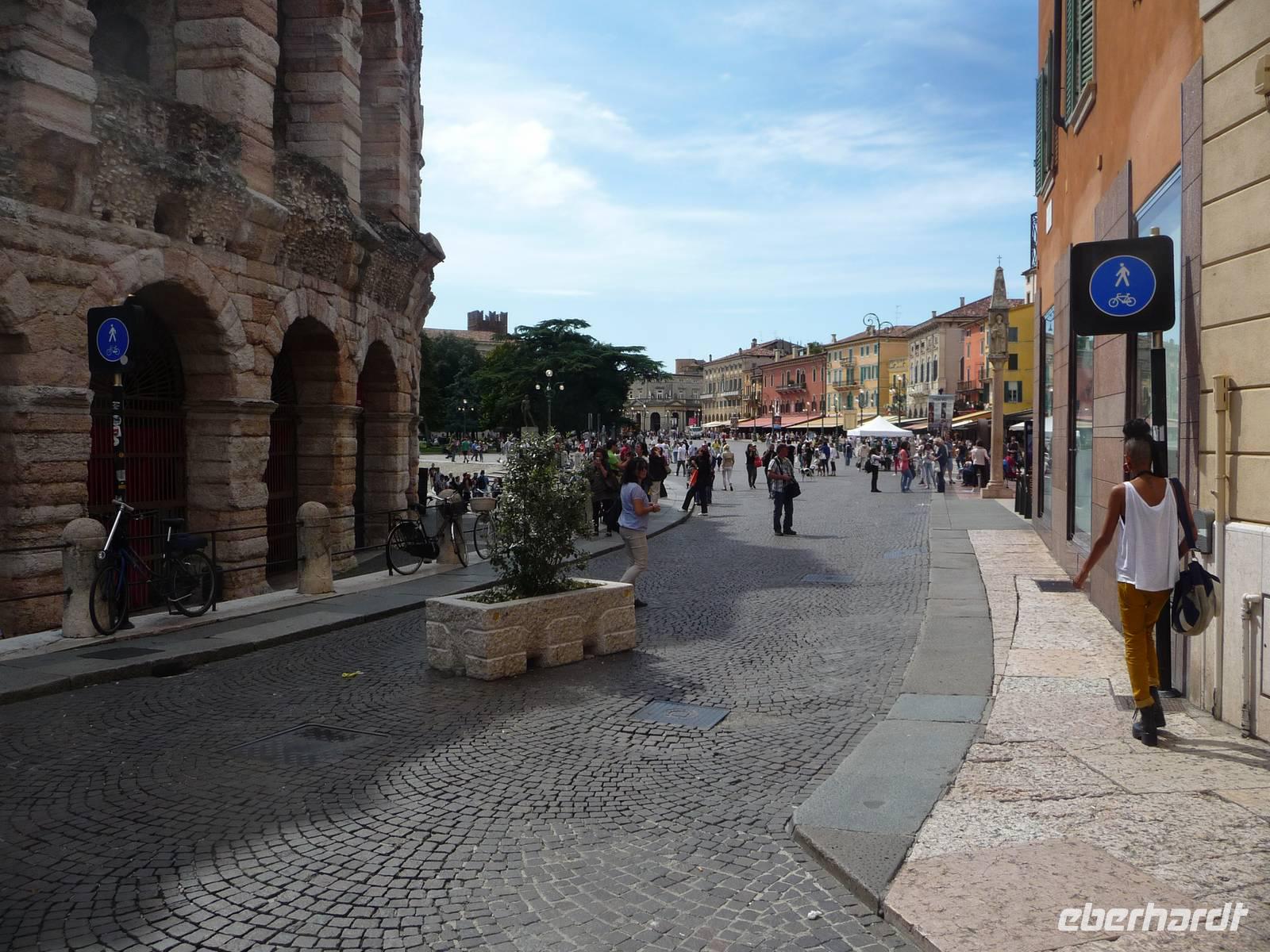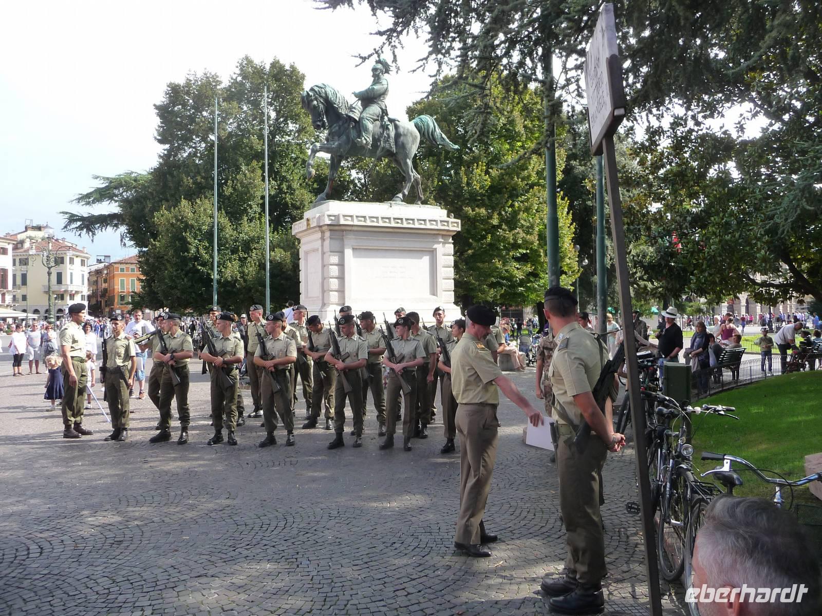 Nach dem Frühstück fahren wir in eine Stadt, die sich in ganz Italien mit keiner anderen vergleichen läßt, wir fahren nach Verona. Verona ist alt, elegant und berühmt für das Liebespaar aus zwei verfeindeten Familien. Romeo und Julia kommen aus dieser Stadt und es fällt schwer, zu glauben, dass es sich nur um Fantasieprodukte handelt, die Shakespeare in einem Drama verewigt hat. Die sehr informative Stadtführung mit Signora Lorella durch die historische Altstadt mit der Piazza delle Erbe, dem ehemaligen römischen Forum, heute Marktplatz und Touristentreffpunkt sowie der Piazza dei Signori mit der kunsthistorisch wertvollen Loggia aus der Renaissanczeit und dem Denkmal des größten Dichters Italiens, Aligheri Dante, endet im Hof des Wohnhauses der Julia. Schon auf den Wänden im Eingangsbereich verewigen sich junge Leute aus aller Herren Länder mit Liebesschwüren für ihre jeweils Angebeteten. Das Haus ist ein Museum und auf dem berühmten Balkon erscheint immer wieder eine moderne Julia, die vom unten wartenden Freund fotografiert wird. Die lebensgroße Statue der Julia im Hof verheißt demjenigen Liebesglück, der Julias Oberweite berührt, was dann auch ausgiebig von Männlein und Weiblein betrieben wird. Der Besuch der Arena di Verona, dem drittgrößten noch aus der Antike existierenden Amphitheater mit Plätzen für 25 000 Zuschauern, gehört zu den Höhepunkten der Stadtbesichtigung ebenso, wie der Eintritt in die Scaligerburg aus dem 13.Jh.