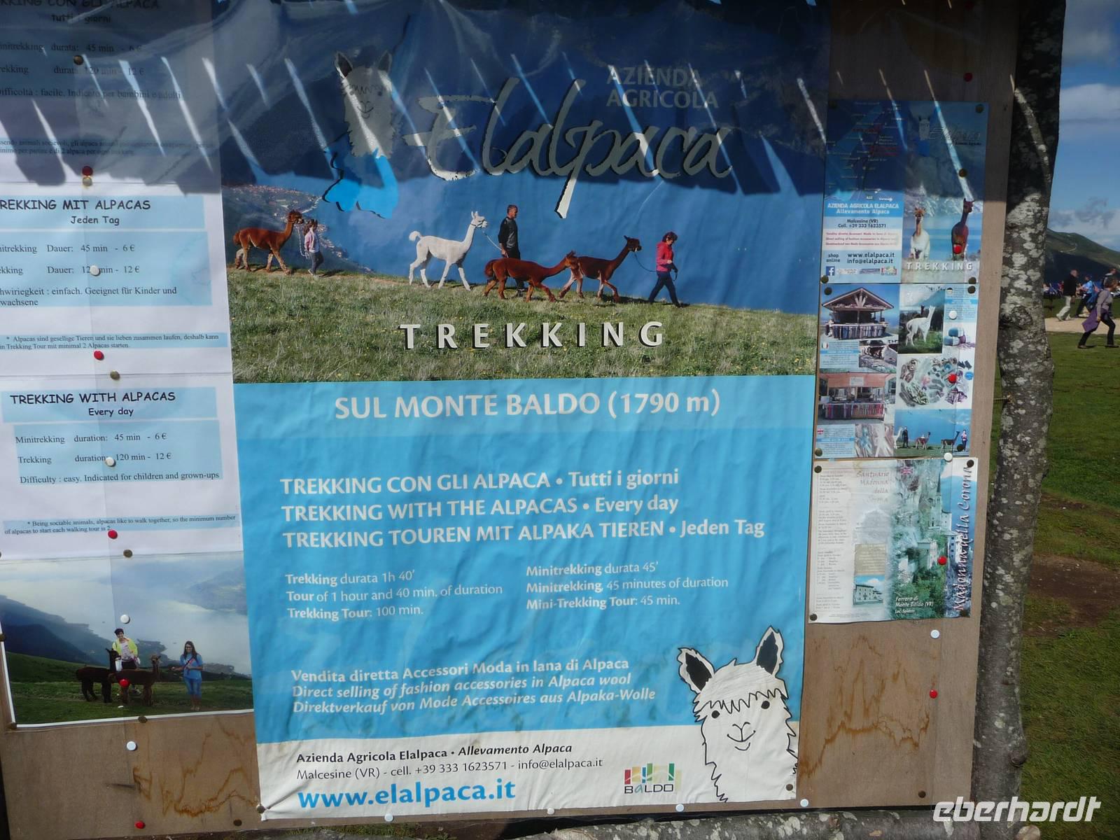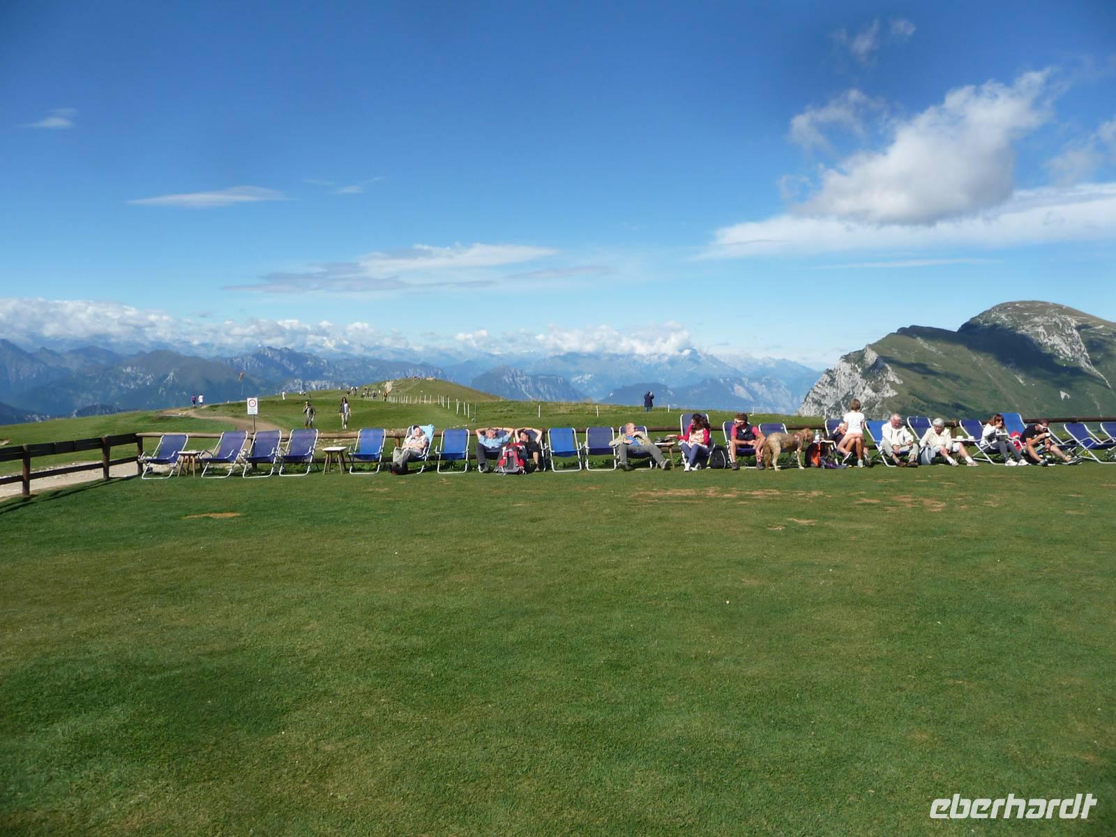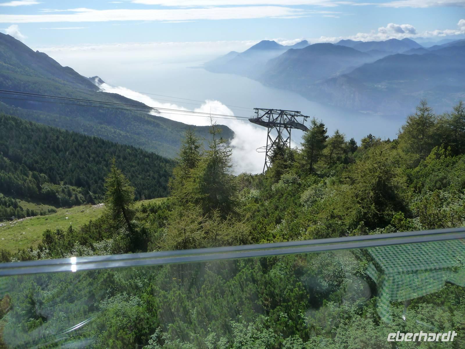 Gegen Mittag dann fahren wir mit unserem Bus zur Talstation der Seilbahn. An der Mittelstation San Michele müssen wir in die sich einmal um ihre Längsachse drehenden Kabinen umsteigen. Oben angekommen genießen wir, dank auch des guten Wetters, einen prächtigen Blick über den Gardasee aber auch einen weiten Ausblick in die Bergwelt der Brentadolomiten in der Ferne. Und wer hätte schon vermutet, dass man auf 1800 m Höhe Lamas antrifft. Eine kleine Farm bietet Trekkingtouren mit den Alpakas an. Bei 22° C, Sonnenschein und fast Windstille haben wir einen außergewöhnlich milden Tag für unseren Ausflug in die Welt der Berge erwischt. Es fällt schwer, sich von den sanften Almenwiesen wieder zu trennen, und so befördern uns die sich ganz langsam drehenden Kabinen der Seilbahn wieder zurück nach Malcesine, wo wir von unserem getreuen Toni mit dem Bus wieder abgeholt und zum Hotel nach Garda transportiert werden.