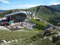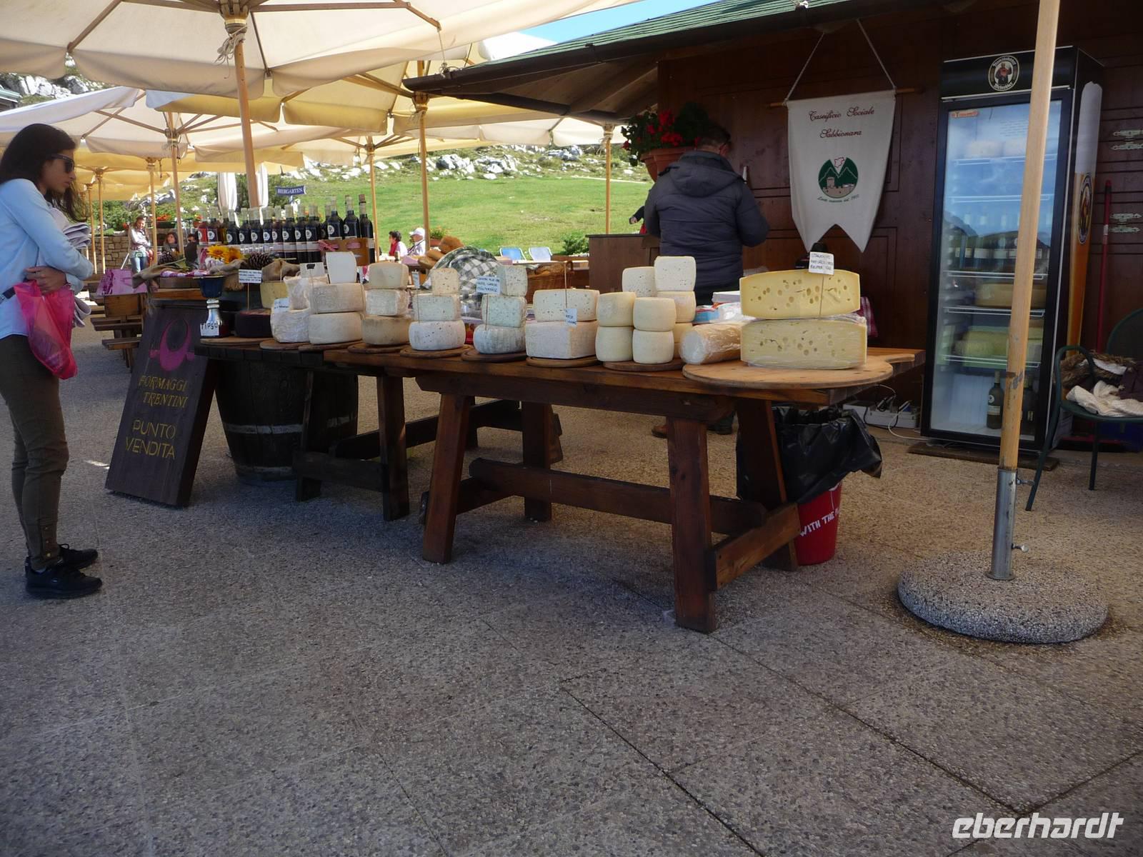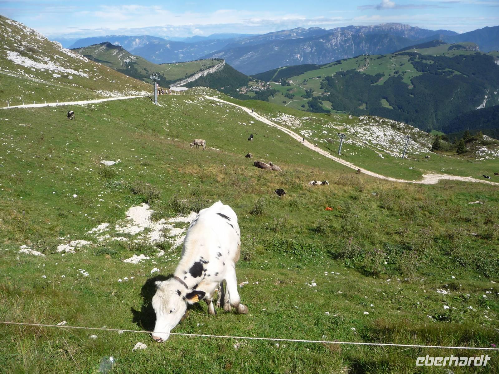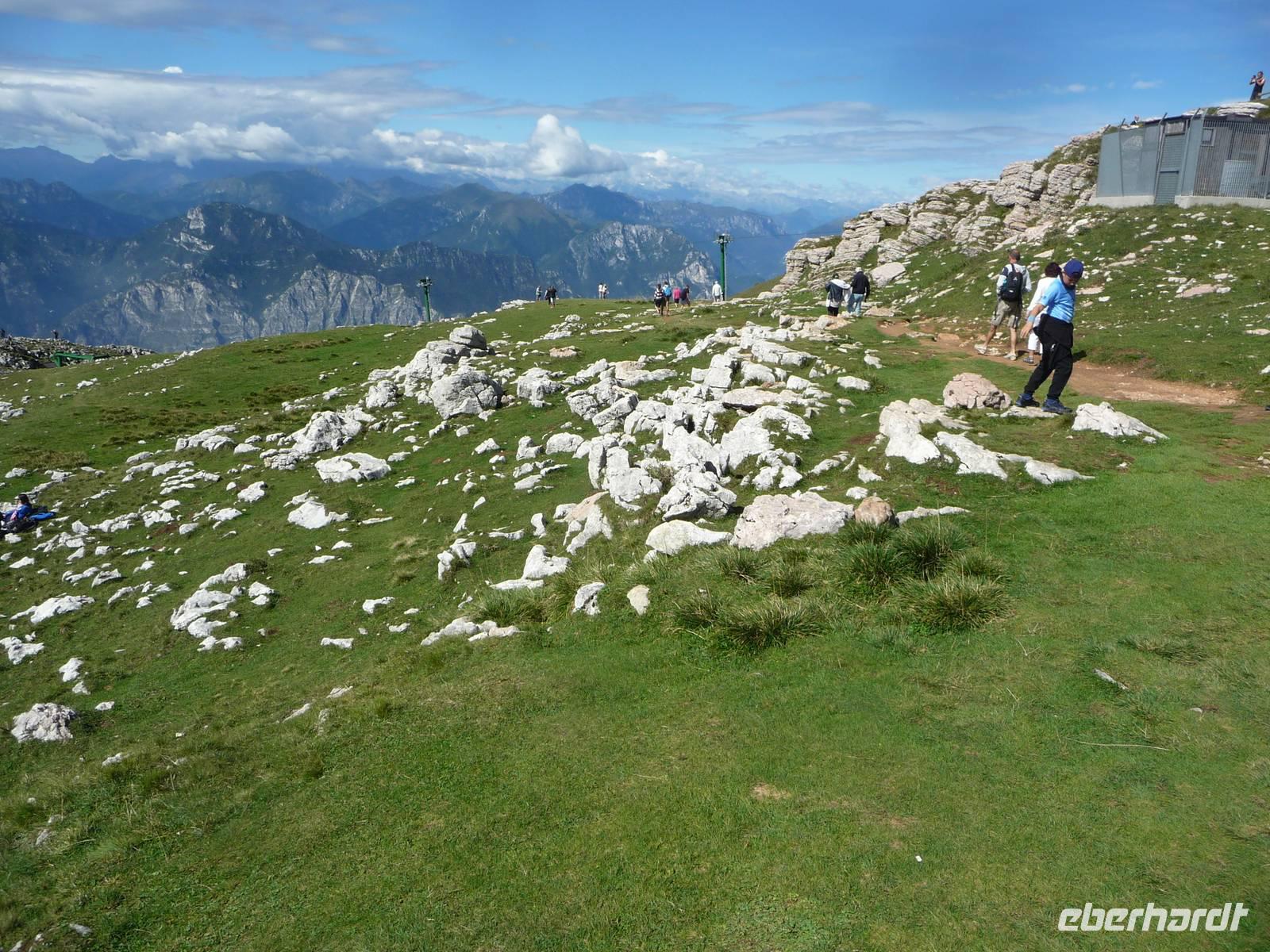 Gegen Mittag dann fahren wir mit unserem Bus zur Talstation der Seilbahn. An der Mittelstation San Michele müssen wir in die sich einmal um ihre Längsachse drehenden Kabinen umsteigen. Oben angekommen genießen wir, dank auch des guten Wetters, einen prächtigen Blick über den Gardasee aber auch einen weiten Ausblick in die Bergwelt der Brentadolomiten in der Ferne. Und wer hätte schon vermutet, dass man auf 1800 m Höhe Lamas antrifft. Eine kleine Farm bietet Trekkingtouren mit den Alpakas an. Bei 22° C, Sonnenschein und fast Windstille haben wir einen außergewöhnlich milden Tag für unseren Ausflug in die Welt der Berge erwischt. Es fällt schwer, sich von den sanften Almenwiesen wieder zu trennen, und so befördern uns die sich ganz langsam drehenden Kabinen der Seilbahn wieder zurück nach Malcesine, wo wir von unserem getreuen Toni mit dem Bus wieder abgeholt und zum Hotel nach Garda transportiert werden.