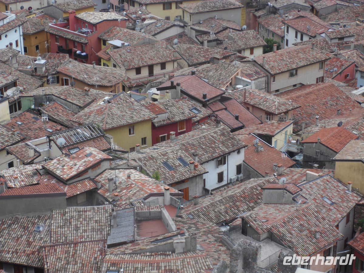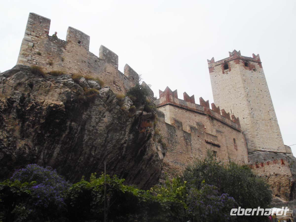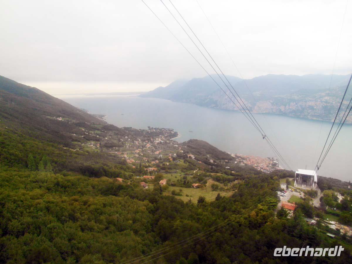 Morgens geht es mit der Seilbahn in luftige Höhen. Wir starten mit ihr von Malcesine aus und sind in 10 min auf eine Höhe von mehr als 1700 m. Doch ach, war unten noch eitel Sonnenschein, so befinden wir uns nun mitten in den Wolken. Die Temperatur ist auch um mindestens 10 Grad gefallen. Doch ein kleiner Spaziergang ist trotzdem drin. Auf dem Rückweg kann man aber auch an der Mittelstation aussteigen, und hat von hier aus bei klarer Sicht einen nicht minder schönen Blick auf den See von oben. Etliche nutzen auch die schöne Landschaft, und gehen per pedes durch Olivenhaine zwischen uralten Mauern und Gehöften zurück in die Stadt. Diese ist sehr geschichtsträchtig und entwickelte sich ab dem 6. Jh. um eine langobardische Burg auf dem Felsen direkt am See. Nach den Franke bauten diese die Skaliger zur heutigen Größe aus. Durch enge gewundene Gassen und über malerische Plätze gelangt man zu ihr, wie schon Goethe im Jahr 1786. Der wurde sogar beim Abzeichnen der Anlage als österreichischer Spion verdächtigt, konnte den Verdacht gottlob aber ausräumen. Ein eigens eingerichteter Museumssaal erinnert an seinen Aufenthalt hier. Auch wir erklimmen den Bergfried und haben eine wunderbare Aussicht auf die verwinkelte Dachlandschaft der kleinen Stadt. Nun noch ein leckeres italienisches Eis als Lohn für den Aufstieg und dann reisen wir die kurze Strecke zu unserem Hotel zurück.